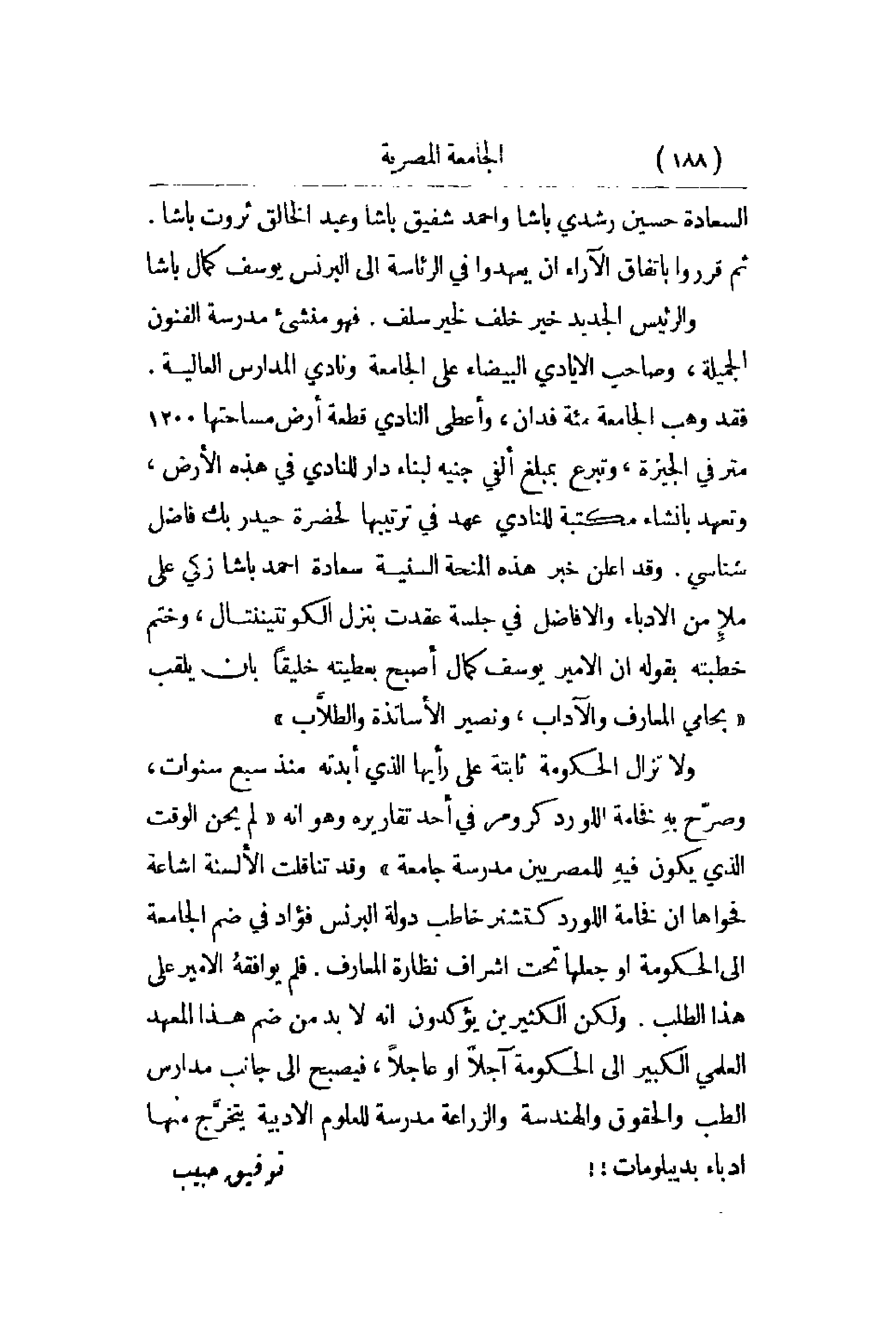 السعادة حسين رشدي باشا وأحمد شفيق باشا وعبد الخالق ثروت باشا. ثم قرروا باتفاق الآراء أن يعهدوا في الرئاسة إلى البرنس يوسف كمال باشا والرئيس الجديد خير خلف لخير سلف. فهو منشئ مدرسة الفنون الجميلة , وصاحب الأيادي البيضاء على الجامعة ونادي المدارس العالية. فقد وهب الجامعة مئة فدان , وأعطى النادي قطعة أرض مساحتها 1200 متر في الجيزة , وتبرع بمبلغ ألفي جنيه لبناء دار للنادي في هذه الأرض , وتعهد بإنشاء مكتبة للنادي عهد في ترتيبها لحضرة حيدر بك فاضل شناسي. وقد أعلن خبر هذه المنحة السنية سعادة أحمد باشا زكي على ملأِ من الأدباء والأفاضل في جلسة عقدت بنزل الكونتيننتال , وختم خطبته بقوله أن الأمير يوسف كمال أصبح بعطيته خليقاً بأن يلقب بحامي المعارف والآداب , ونصير الأساتذة والطلاَّب ولا تزال الحكومة ثابتة على رأيها الذي أبدته منذ سبع سنوات , وصرّح بهِ فخامة اللورد كرومر في أحد تقاريره وهو أنه لم يحن الوقت الذي يكون فيهِ للمصريين مدرسة جامعة وقد تناقلت الألسنة إشاعة فحواها أن فخامة اللورد كتشنر خاطب دولة البرنس فؤاد في ضم الجامعة إلى الحكومة أو جعلها تحت إشراف نظارة المعارف. فلم يوافقهُ الأمير على هذا الطلب. ولكن الكثيرين يؤكدون أنه لابد من ضم هذا المعهد العلمي الكبير إلى الحكومة آجلاً أو عاجلاً , فيصبح على جانب مدارس الطب والحقوق والهندسة والزراعة مدرسة للعلوم الأدبية يتخرَّج منها أدباء بديبلومات!!