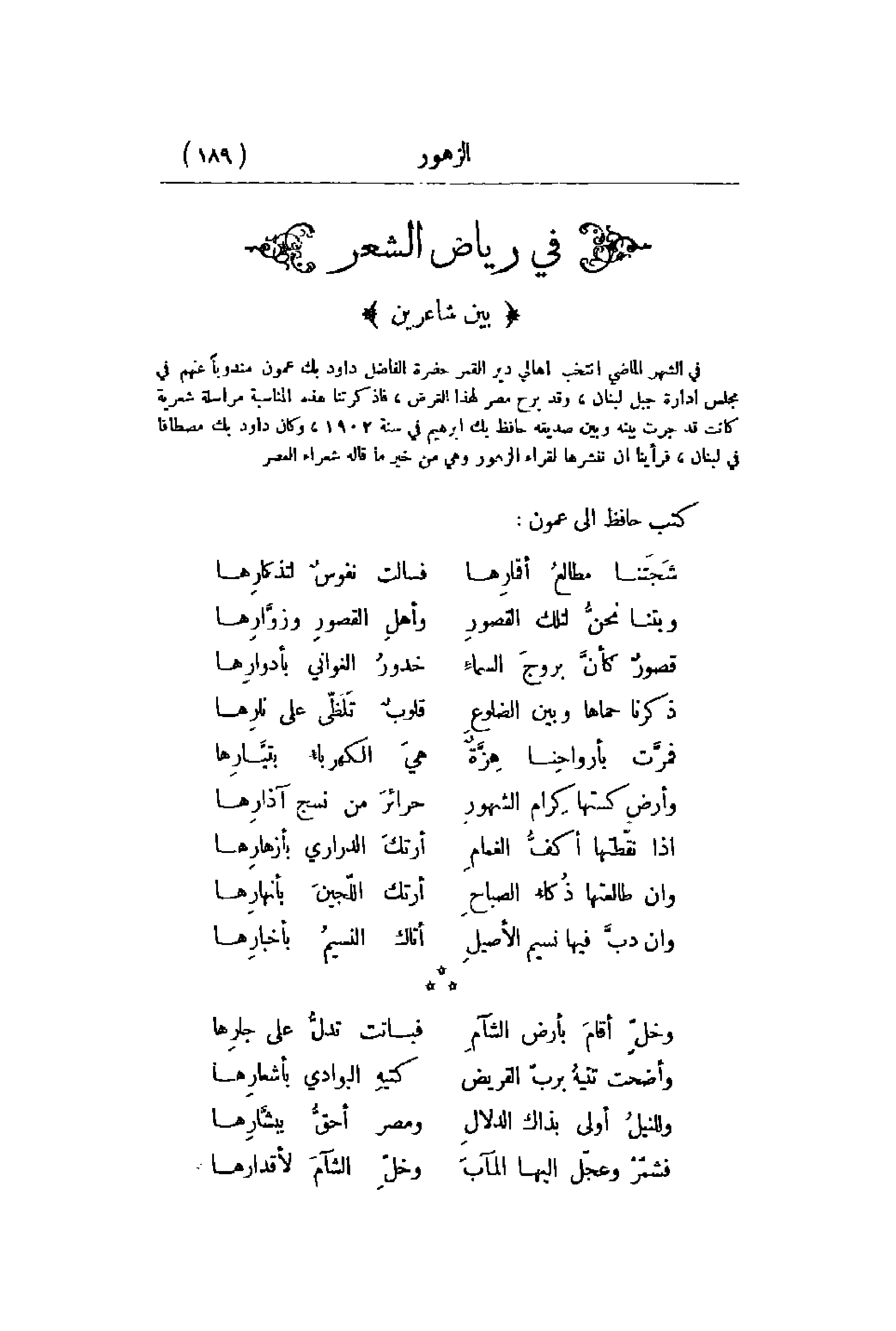 في الشهر الماضي انتخب أهالي دير القمر حضرة الفاضل داود بك عمون مندوباً عنهم في مجلس إدارة جبل لبنان , وقد برح مصر لهذا الغرض , فاذكرتنا هذه المناسبة مراسلة شعرية كانت قد جرت بينه وبين صديقه حافظ بك إبراهيم في سنة 1902 , وكان داود بك مصطافا في لبنان , فرأينا أن ننشرها لقراء الزهور وهي من خير ما قاله شعراء العصر: