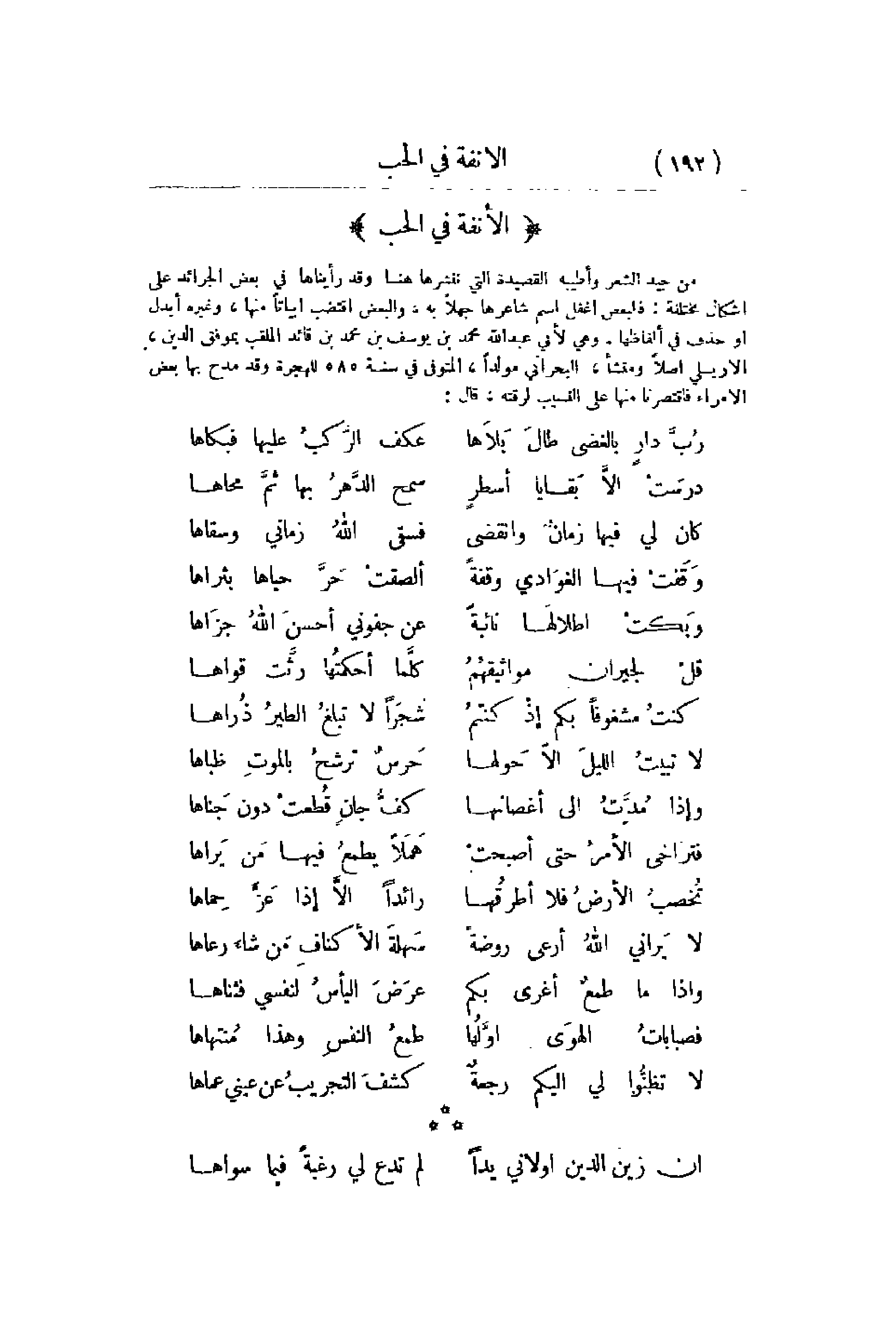 من حيد الشعر وأطيبه القصيدة التي ننشرها هنا وقد رأيناها في بعض الجرائد على أشكال مختلفة: فالبعض أغفل اسم شاعرها جهلاً به , والبعض اقتضب أبياتاً منها , وغيره أبدل الأربلي أصلاً ومنشأ , البحراني أني مولداً , المتوفي في سنة 585 للهجرة وقد مدح بها بعض الأمراء فانتصرنا منها على النسيب لرقته , قال: