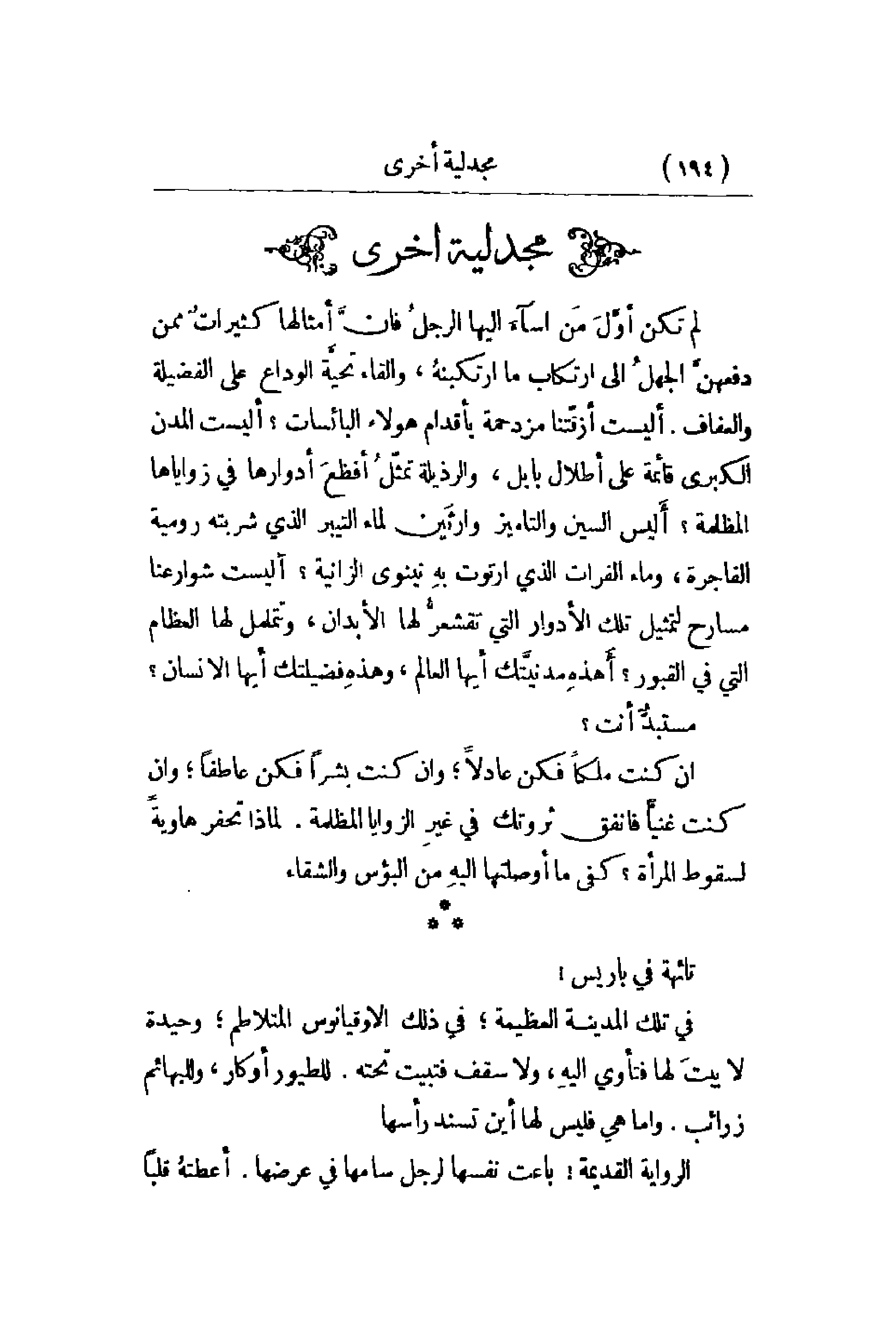 لم تكن أوَّلَ من أساءَ إليها الرجلُ فإنَّ أمثالها كثيراتٌ ممن دفعهنَّ الجهلُ إلى ارتكاب ما ارتكبنهُ , وإلقاء تحيَّة الوداع على الفضيلة والعفاف. أليست أزقّتنا مزدحمة بأقدام هؤلاء البائسات؟ أليست المدن الكبرى قائمة على أطلال بابل , والرذيلة تمثّلُ أفظعَ أدوارها في زواياها المظلمة؟ أَليس السين والتاميز وارثَين لماء للتيبر الذي شربته رومية الفاجرة , وماء الفرات الذي ارتوت بهِ نينوى الزانية؟ أليست شوارعنا مسارح لتمثيل تلك الأدوار التي تقشعرُّ لها الأبدان , وتتململ لها العظام التي في القبور؟ أَهذهِ مدنيَّتك أيها العالم , وهذهِ فضيلتك أيها الإنسان؟
