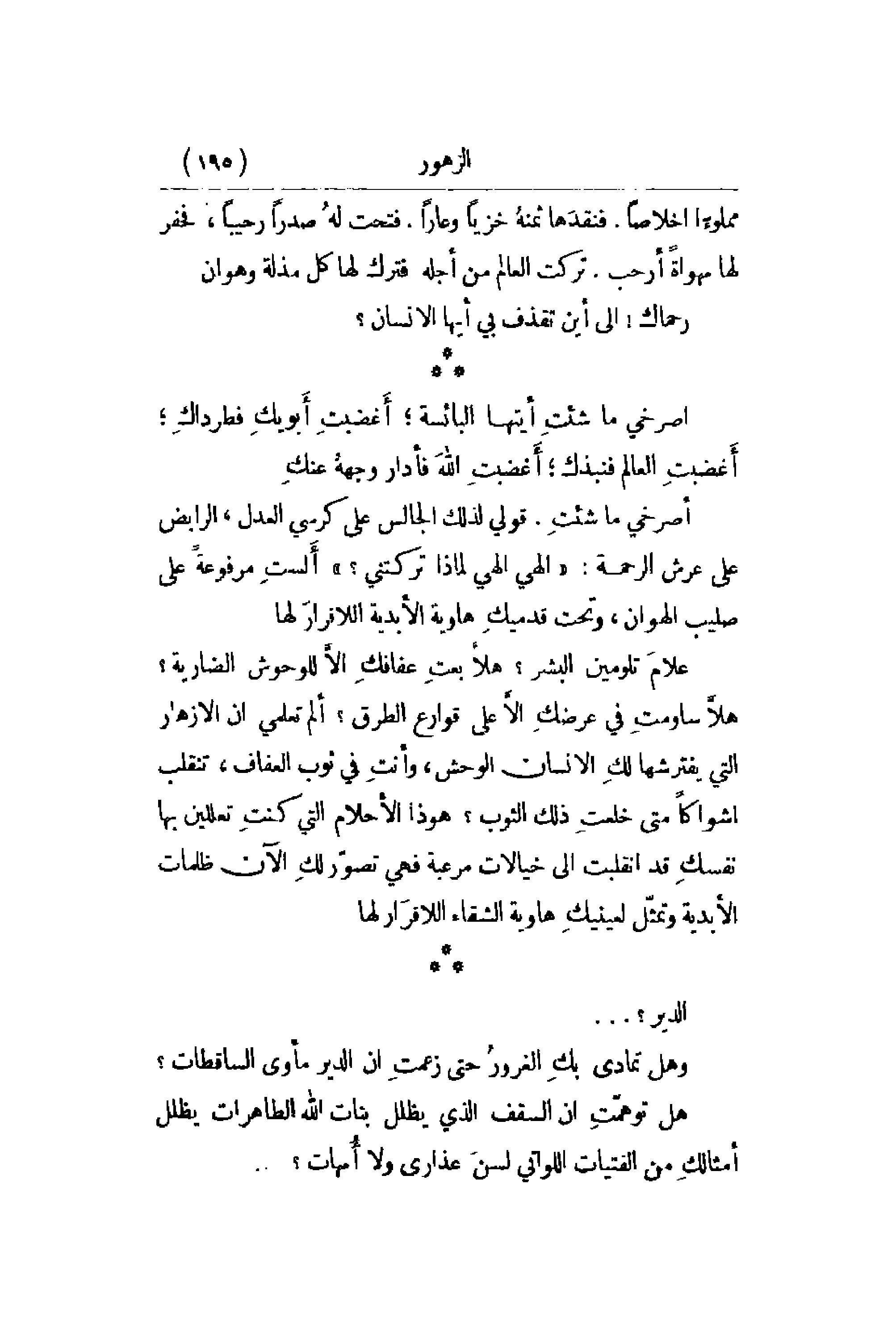علمَ تلومين البشر؟ هلا بعتِ عفافكِ إلاَّ للوحوش الضارية؟ هلاَّ ساومتِ في عرضكِ إلاَّ على قوارع الطرق؟ ألم تعلمي أن الأزهار التي يفترسها لكِ الإنسان الوحش , وأنتِ في ثوب العفاف , تنقلب أشواكاً متى خلعتِ ذلك الثوب؟ هو ذا الأحلام التي كنتِ تعللين بها