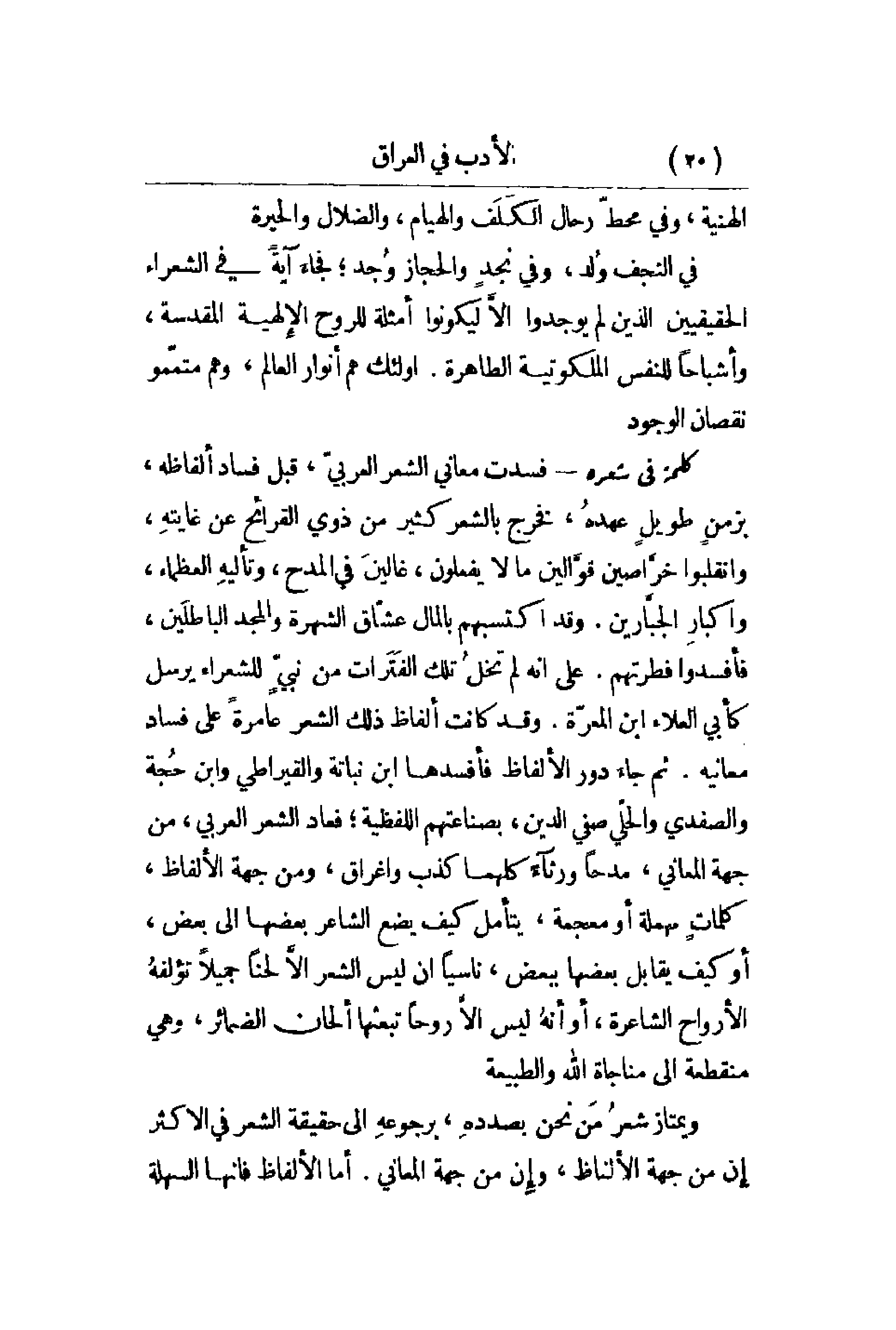 اللفظية؛ فعاد الشعر العربي , من جهة المعاني , مدحاً ورثاء كلهما كذب وإغراق , ومن جهة الألفاظ , كلماتٍ مهملة أو معجمة , يتأمل كيف يضع الشاعر بعضها إلى بعض , أو كيف يقابل بعضها ببعض , ناسياً أن ليس الشعر إلاَّ لحناً جميلاً تؤلفهُ الأرواح الشاعرة , أو أنهُ ليس إلاَّ روحاً تبعثها ألحان الضمائر , وهي منقطعة إلى مناجاة الله والطبيعة. ويمتاز شعرُ مَن نحن بصددهِ , برجوعهِ إلى حقيقة الشعر في الأكثرِ إن من جهة الألفاظ , وإِن من جهة المعاني. أما الألفاظ فإنها السهلة