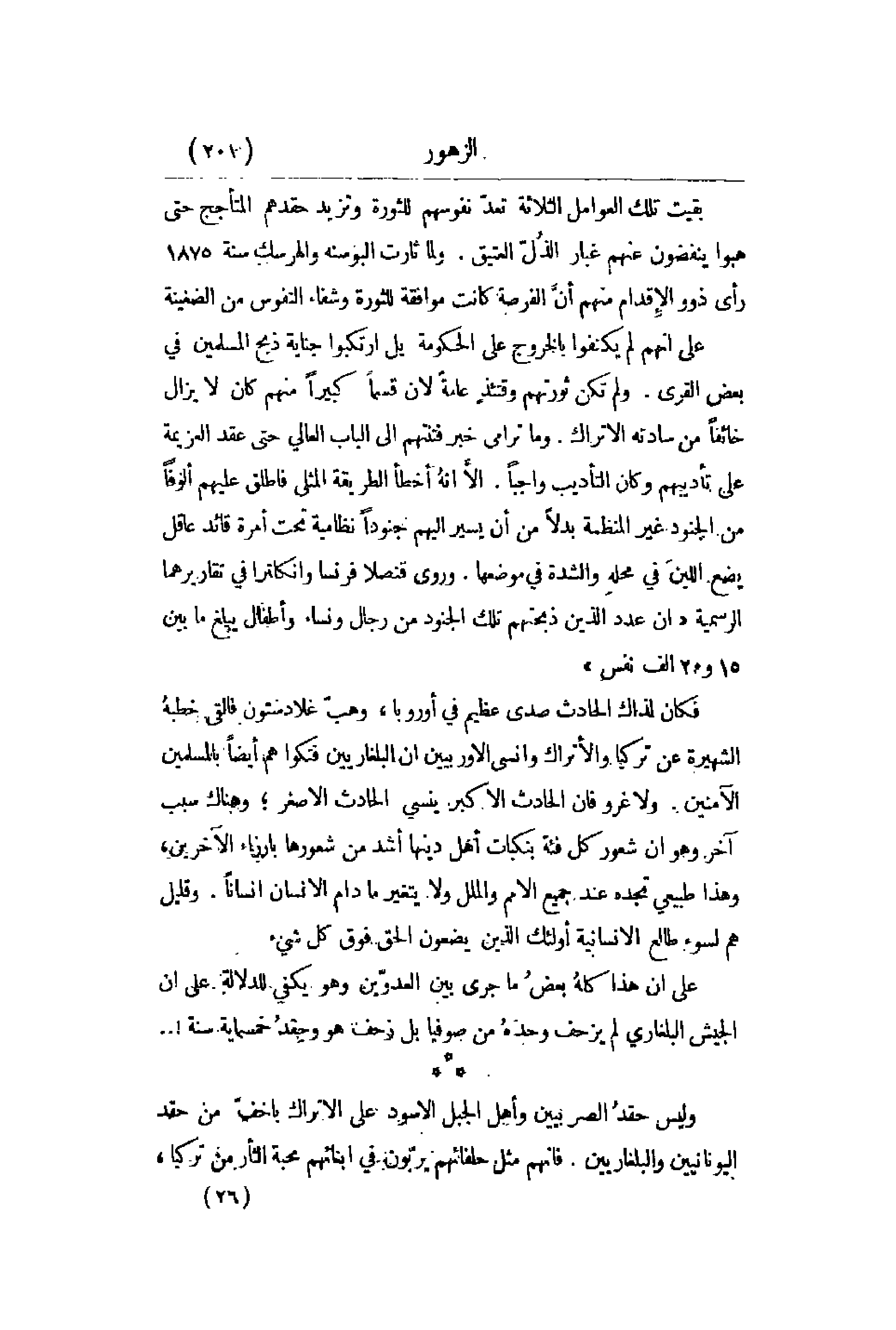 بقيت تلك العوامل الثلاثة تعدّ نفوسهم للثورة ونزيد حقدهم المتأجج حتى هبوا ينفضون عنهم غبار الذُلّ العتيق. ولما ثارت البوسنة والهرسك سنة 1875 رأى ذوو الإِقدام منهم أنَّ الفرصة كانت موافقة للثورة وشفاء النفوس من الضغينة. على أنهم لم يكنفوا بالخروج على الحكومة بل ارتكبوا جناية ذبح المسلمين في بعض القرى. ولم تكن ثورتهم وقتئذ عامة لأن قسماً كبيراً منهم كان لا يزال خائفاً من سادته الأتراك. وما ترامى خبر فتنتهم على الباب العالي حتى عقد العزيمة على تأديبهم وكان التأديب واجباً. إلاَّ أنهُ أخطأ الطريقة المثلى فأطلق عليهم ألوفاً من الجنود غير المنظمة بدلاً من أن يسير إليهم جنوداً نظامية تحت امرأة قائد عاقل يضع اللينَ في محلهِ والشدة في موضعها. وروى قنصلاً فرنسا وانكلترا في تقاريرها الرسمية إن عدد ذبحتهم تلك الجنود من رجال ونساء وأطفال يبلغ ما بين 15 و20 ألف نفس فكان لذاك الحادث صدى عظيم في أوربا , وهبّ غلادستون فألقى خطبهُ الشهيرة عن تركيا والأتراك وأنسى الأوروبيين أن البلغاريين فتكوا هم أيضاً بالمسلمين الآمنين. ولا غرو فإن الحادث الأكبر ينسي الحادث الأصغر؛ وهناك سبب آخر وهو أن شعور كل فئة بنكبات أهل دينها أشد من شعورها بأرزاء الآخرين , وهذا طبيعي تجده عند جميع الأمم والملل ولا يتغير ما دام الإنسان إنساناً. وقليل هم لسوء طالع الإنسانية أولئك الذين يضعون الحق فوق كل شيء. على أن هذا كلهُ بعضُ ما جرى بين العدوّين وهو يكفي للدلالة على أن الجيش البلغاري لم يزحف وحدهُ من صوفيا بل زحف هو وحِقدُ خمسماية سنة!. . .