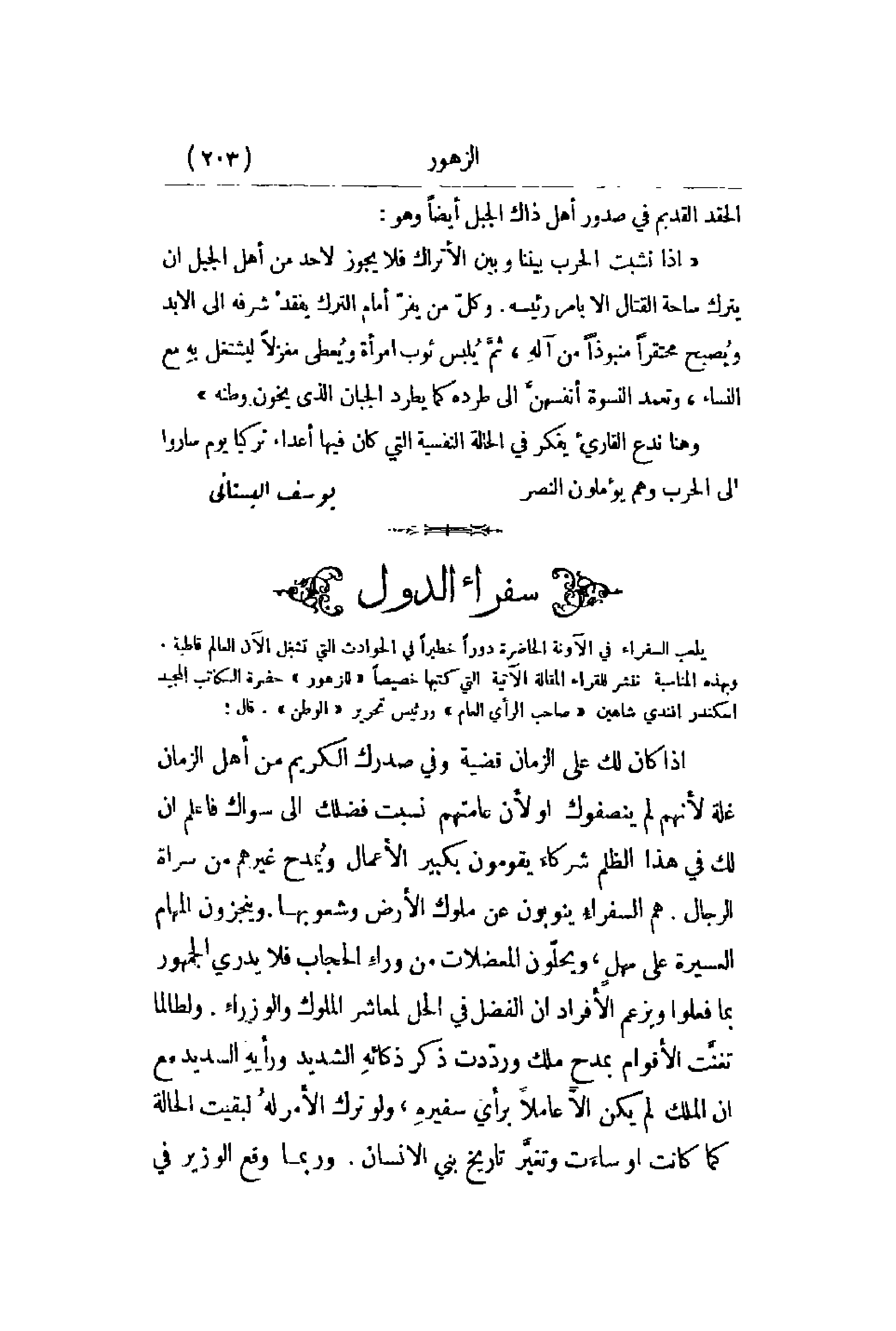 يلعب السفراء في الآونة الحاضرة دوراً خطيراً في الحوادث التي تشغل الآن العالم قاطبة. وبهذه المناسبة ننشر للقراء المقالة الآتية التي كتبها خصيصاً للزهور حضرة الكاتب المجيد اسكندر أفندي شاهين صاحب الرأي العام ورئيس تحرير الوطن قال: إذا كان لك على الزمان قضية وفي صدرك الكريم من أهل الزمان غلة لأنهم لم ينصفوك أو لأن عامتهم نسبت فضلك إلى سواك فاعلم أن لك في هذا الظلم شركاءَ يقومون بكبير الأعمال ويُمدح غيرهم من سراة الرجال. هم السفراءُ ينوبون عن ملوك الأرض وشعوبها وينجزون المهام العسيرة على نعهلٍ , ويحلّون المعضلات من وراءِ الحجاب فلا يدري الجمهور بما فعلوا ويزعم الأفراد أن الفضل في الحل لمعاشر الملوك والوزراءِ. ولطالما تغنَّت الأقوام بمدح ملك وردّدت ذكر ذكائهِ الشديد ورأيهِ السديد مع أن الملك لم يكن إلاَّ عاملاً برأي سفيرهِ , ولو ترك الأمر لهُ لبقيت الحالة كما كانت أو ساءَت وتغيَّر تاريخ بني الإنسان. وربما وقع الوزير في
