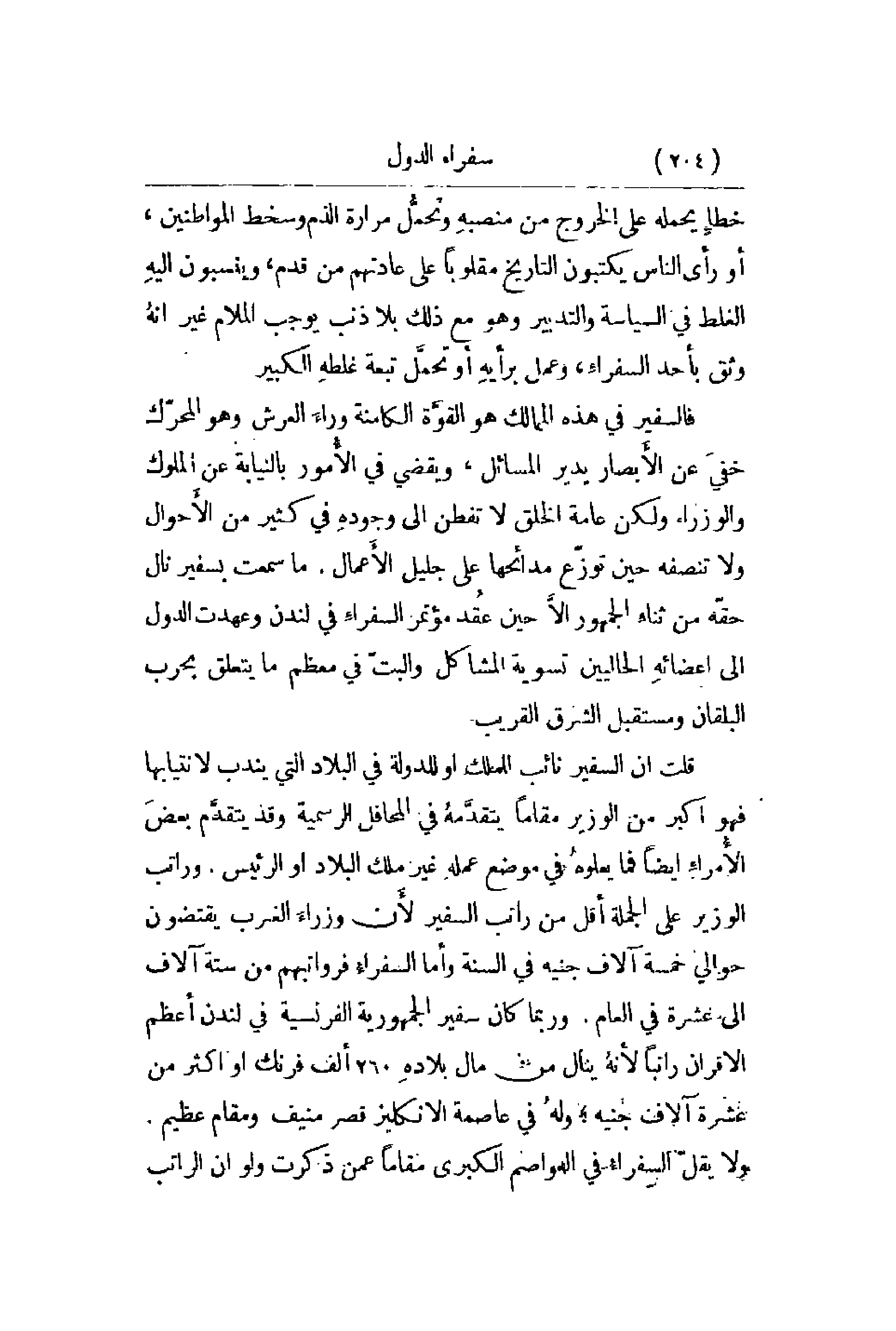 خطأِ يحمله على الخروج من منصبهِ وتحمُّل مرارة وسخط المواطنين , أو رأي الناس يكتبون التاريخ مقلوباً على عادتهم من قدم , وينسبون إليهِ الغلط في السياسة والتدبير وهو مع ذلك بلا ذنب يوجب الملام غير أنهُ وثق بأحد السفراءِ , وعمل برأيهِ أو تحمَّل تبعة غلطهِ الكبير. فالسفير في هذه الممالك هو القوَّة الكامنة وراءَ العرش وهو المحرّك خفيَ عن الأبصار يدير المسائل , ويقضي في الأُمور بالنيابة عن الملوك والوزراء ولكن عامة الخلق لا تفطن إلى وجودهِ في كثير من الأَحوال ولا تنصفه حين توزّع مدائحها على جليل الأَعمال. ما سمعت بسفير نال حقّه ثناءِ الجمهور إلاَّ حين عُقد مؤتمر السفراءِ في لندن وعهدت الدول إلى أعضائهِ الحاليين تسوية المشاكل والبتّ في معظم ما يتعلق بحرب البلقان ومستقبل الشرق القريب. قلت أن السفير نائب للملك أو للدولة في البلد التي يندب لأنتيابها فهو أكبر من الوزير مقاماً يتقدَّمهُ في المحافل الرسمية وقد يتقدَّم بعضَ الأُمراءِ أيضاً فما يعلوهُ في موضع عمله غير ملك البلاد أو الرئيس. وراتب الوزير على الجملة أقل من راتب السفير لأَن وزراءَ الغرب يقتضون حوالي خمسة آلاف جنيه في السنة وأما السفراءُ فرواتبهم من ستة آلاف إلى عشرة في العام. وربما كان سفير الجمهورية الفرنسية في لندن أعظم الأقران راتباً لأنهُ ينال من مال بلادهِ 260 ألف فرنك أو أكثر من عشرة آلاف جنيه؛ ولهُ في عاصمة الانكليز قصر منيف ومقام عظيم.