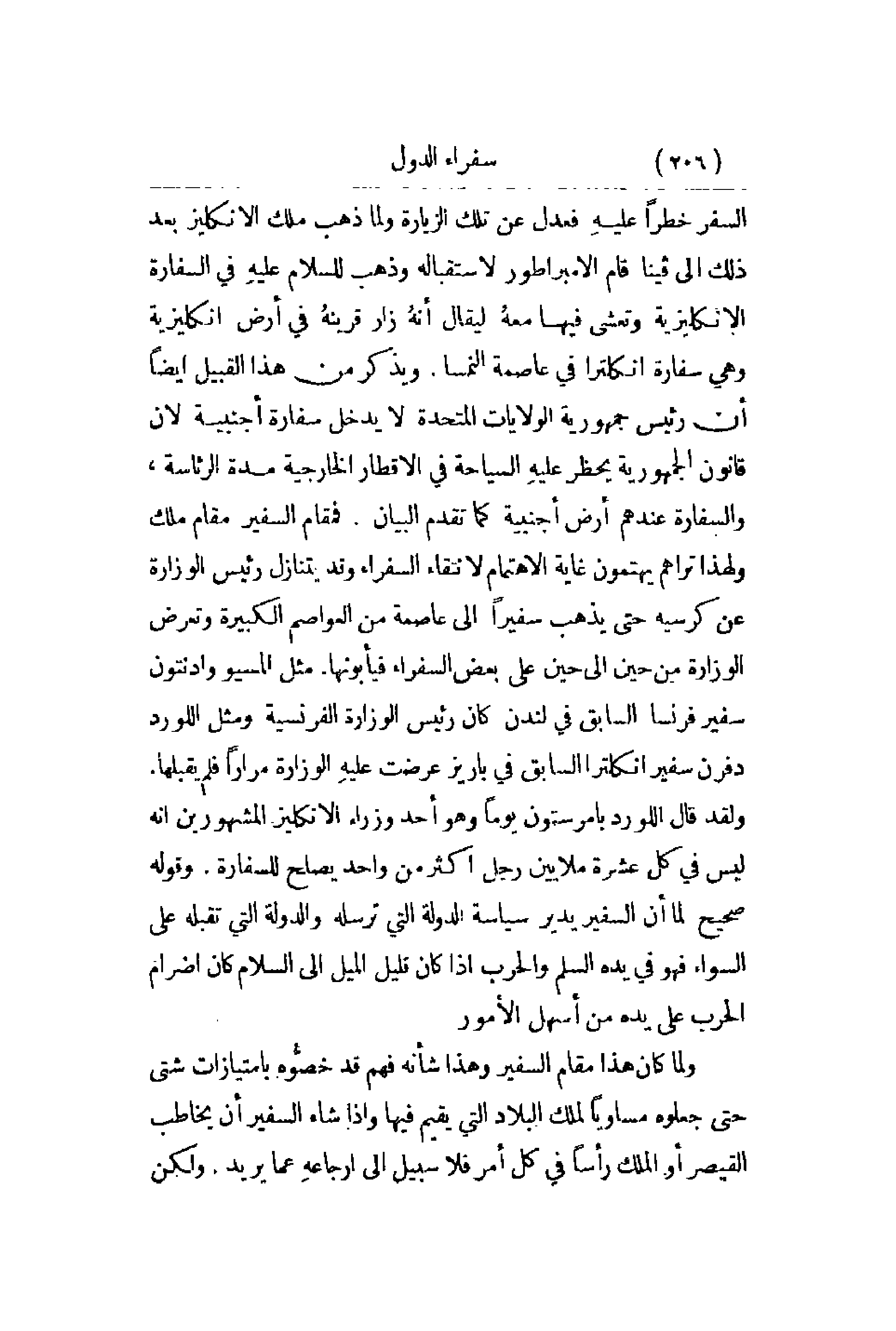 السفر خطراً عليهِ فعدل عن تلك الزيارة ولما ذهب ملك الانكليز بعد ذلك إلى فينا قام الإمبراطور لاستقباله للسلام عليهِ في السفارة الانكليزية وتعشى فيها ليقال أنهُ زار قرينهُ في أرض انكليزية وهي سفارة انكلترا في عاصمة النمسا. ويذكر من هذا القبيل أيضاً أن رئيس جمهورية الولايات المتحدة لا يدخل سفارة أجنبية لأن قانون الجمهورية يحظر عليهِ السياحة في الأقطار الخارجية مدة الرئاسة , والسفارة عندهم أرض أجنبية كما تقدم البيان فمقام السفير مقام ملك ولهذا تراهم يهتمون غاية الاهتمام لانتقاء السفراء وقد يتنازل رئيس الوزارة عن كرسيه حتى يذهب سفيراً إلى عاصمة من العواصم الكبيرة وتعرض الوزارة من حين إلى حين على بعض السفراء فيأبونها مثل المسيو وادنتون سفير فرنسا السابق في لندن كان رئيس الوزارة الفرنسية ومثل اللورد