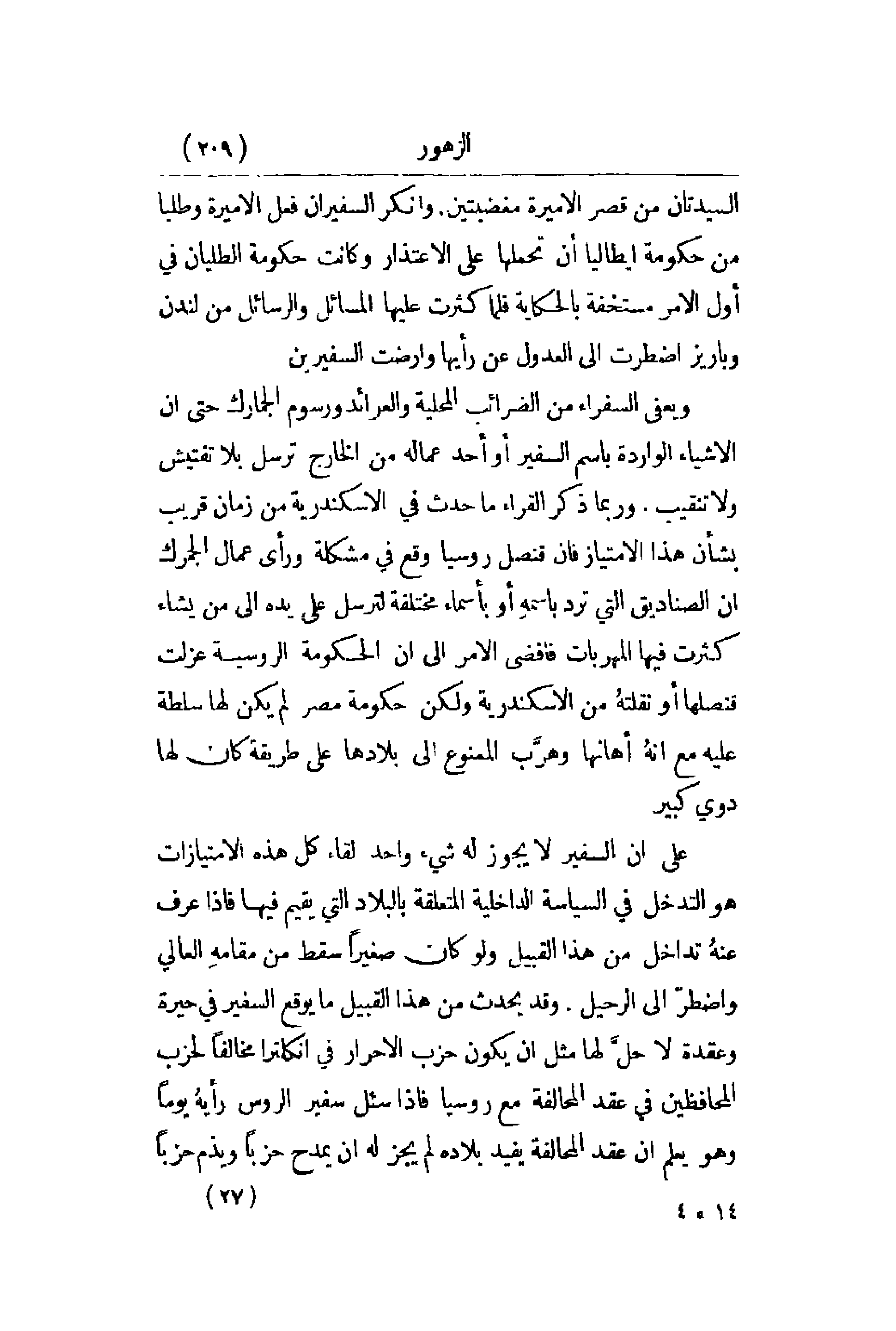 السيدتان من قصر الأميرة مغتصبتين. وأنكر السفيران فعل الأميرة وطلبا من حكومة إيطاليا أن تحملها على الاعتذار وكانت حكومة الطليان في أو الأمر مستخفة بالحكاية فلما كثرت عليها المسائل والرسائل من لندن وباريز اضطرت على العدول عن رأيها وأرضت السفيرين. ويعفي السفراء من الضرائب المحلية والعوائد ورسوم الجمارك حتى أن الأشياء الواردة باسم السفير أو أحد عماله من الخارج ترسل بلا تفتيش ولا تنقيب. وربما ذكر القراء ما حدث في الإسكندرية من زمان قريب بشأن هذا الامتياز فإن قنصل روسيا وقع في مشكلة ورأى عمال الجمرك أن الصناديق التي ترد باسمهِ أو بأسماء مختلفة لترسل على يده إلى من يشاء كثرت فيها المهربات فأفضى الأمر إلى أن الحكومة الروسية عزلت قنصلها أو نقلتهُ من الإسكندرية ولكن حكومة مصر لم يكن لها سلطة عليه مع أنهُ أهانها وهرَّب الممنوع إلى بلادها على طريقة كان لها دوي كبير. على أن السفير لا يجوز له شيء واحد لقاء كل هذه الامتيازات هو التدخل في السياسة الداخلية المتعلقة بالبلاد التي يقيم فيها فإذا عرف عنبهُ تداخل من هذا القبيل ولو كان صغيراً سقط من مقامهِ العالي واضطرّ إلى الرحيل. وقد يحدث من هذا القبيل ما يوقع السفير في حيرة وعقدة لا حلَّ لها