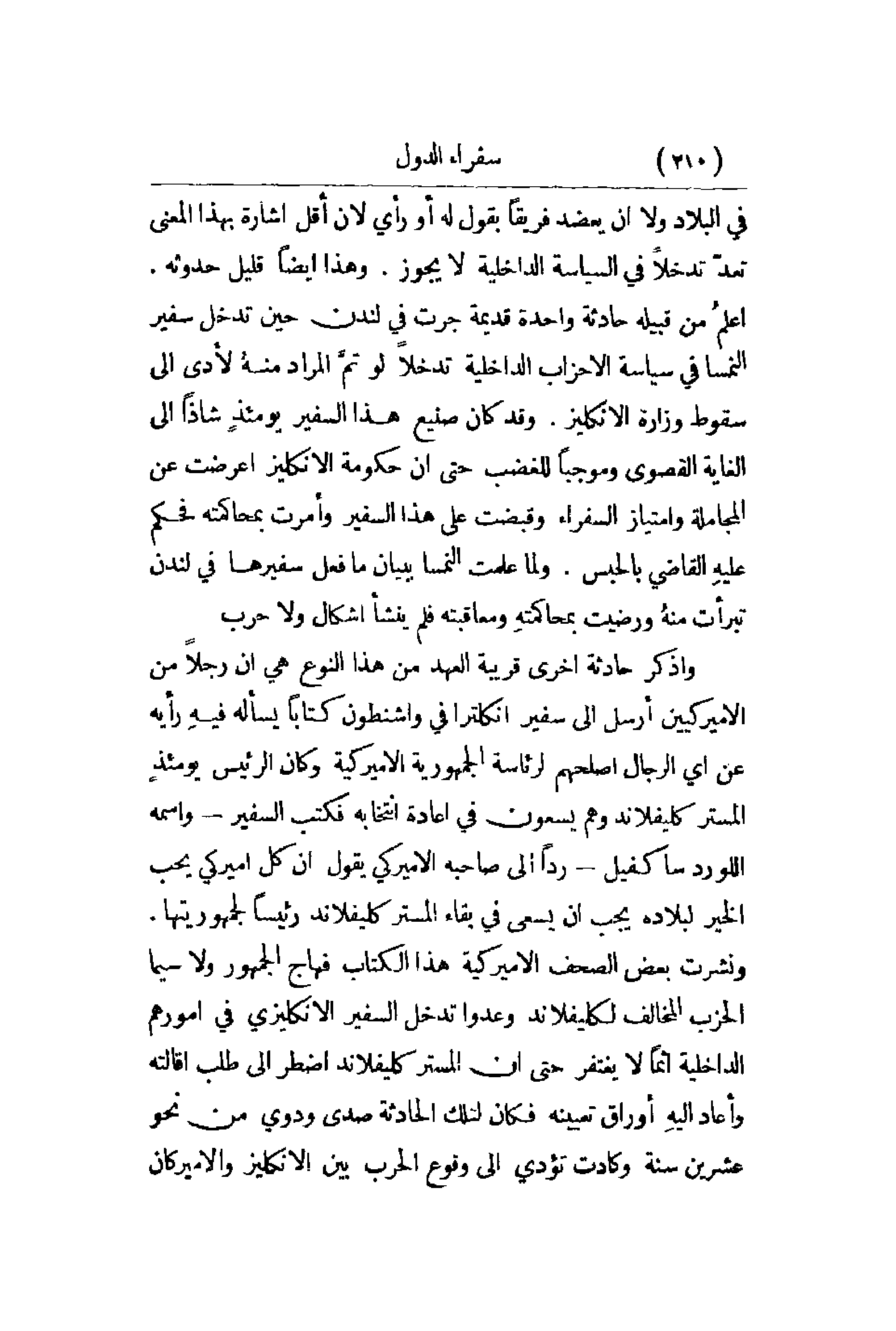 في البلاد ولا أن يعضد فريقاً بقول له أو رأي لأن أقل إشارة بهذا المعنى تعدّ تدخلاً في السياسية الداخلية لا يجوز. وهذا أيضاً قليل حدوثه. اعلمُ من قبيله حادثة واحدة قديمة جرت في لندن حين تدخل سفير النمسا في سياسة الأحزاب الداخلية تدخلاً لو تمَّ المراد منهُ لأدى إلى سقوط وزارة الانكليز. وقد كان صنيع هذا السفير يومئذٍ شاذاً إلى الغاية القصوى وموجباً للغضب حتى أن حكومة الانكليز أعرضت عن المجاملة وامتياز السفراء وقبضت على هذا السفير وأمرت بمحاكمته فحكم عليهِ القاضي بالحبس. ولما علمت النمسا ببيان ما فعل سفيرها في لندن تبرأت منهُ ورضيت بمحاكمتهِ ومعاقبته فلم ينشأ أشكال ولا حرب. واذكر حادثة أخرى قريبة العهد من هذا النوع هي أن رجلاً من الأميركيين أرسل إلى سفير انكلترا في واشنطون كتباً يسأله فيهِ رأيه عن أي الرجال أصلحهم لرئاسة الجمهورية الأميركية وكان الرئيس يومئذٍ المستر كليفلاند وهم يسعون في إعادة انتخابه فكتب السفير - واسمه اللورد ساكفيل - رداً إلى صاحبه الأميركي يقول أن كل أميركي يحب الخير لبلاده يجب أن يسعى في بقاء المستر كليفلاند رئيساً لجمهوريتها. ونشرت بعض الصحف الأميركية هذا الكتاب فهاج الجمهور ولاسيما الحزب المخالف لكليفلاند وعدوا تدخل السفير الانكليزي في أمورهم الداخلية إثماً لا يغتفر حتى أن المستر كليفلاند اضطر إلى طلب إقالته وأعاد إليهِ أوراق تعيينه فكان لتلك الحادثة صدى ودوي من نحو عشرين سنة وكادت تؤدي إلى وقوع الحرب بين الانكليز والاميركان