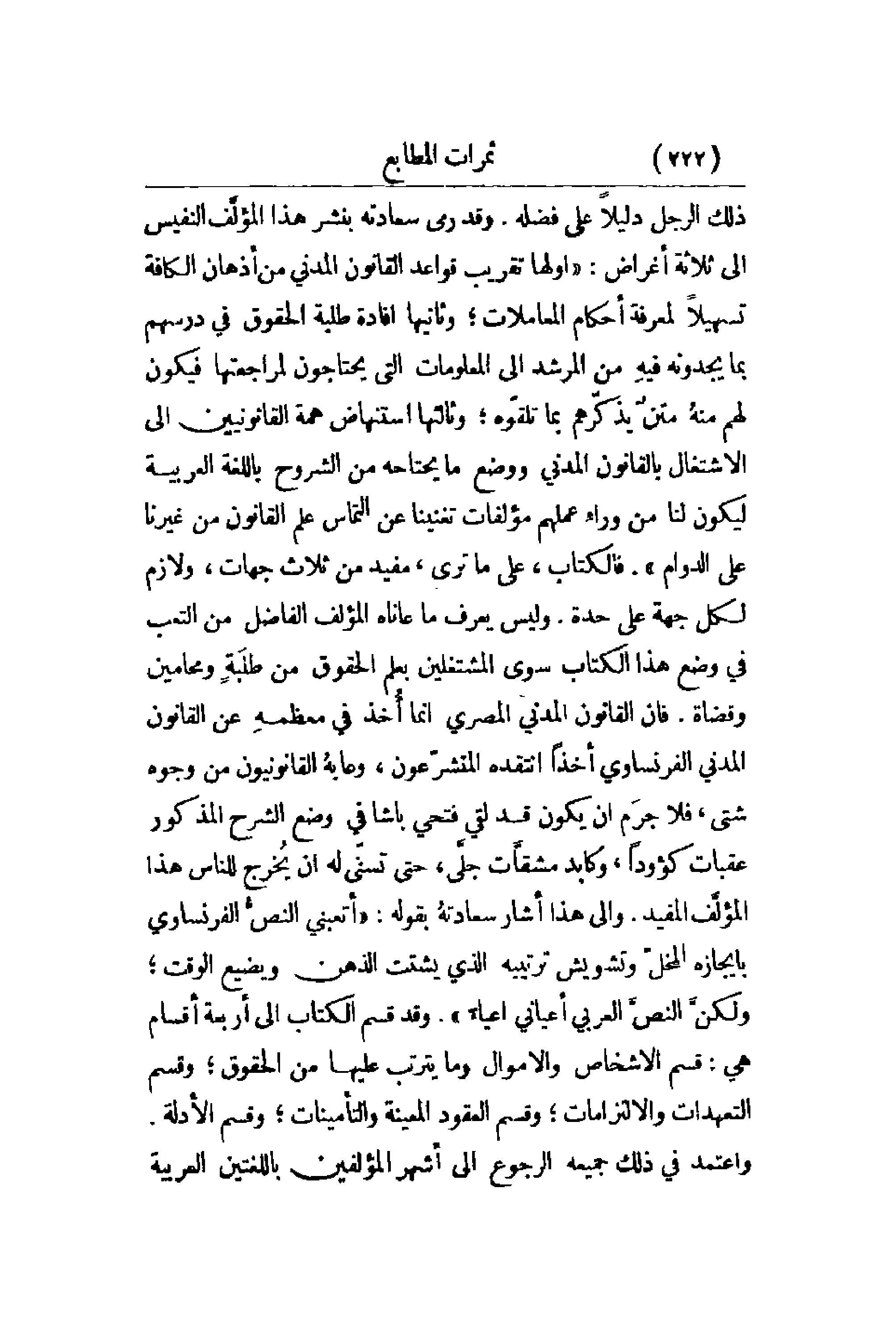 ذلك الرجل دليلاً على فضله. وقد رمى سعادته بنشر هذا المؤلَّف النفيس إلى ثلاثة أغراض: أولها تقريب قواعد القانون المدني من أذهان الكافة تسهيلاً لمعرفة أحكام المعاملات؛ وثانيهما إفادة طلية الحقوق في درسهم بما يجدونه فيهِ من المرشد إلى المعلومات التي يحتاجون لمراجعتها فيكون لهم منهُ متنٌ يذكرّهم بما تلقّوه؛ وثالثهما استنهاض همة القانونيين إلى الاشتغال بالقانون المدني ووضع ما يحتاجه من الشروح باللغة العربية ليكون لنا من وراءِ عملهم مؤلفات تغنينا عن ألتماس علم القانون من غيرنا على الدوام. فالكتاب سوى المشتغلين بعلم الحقوق من طلَبةٍ ومحامين وقضاة. فإن القانون المدني المصري إنما أُخذ في معظمهِ عن وجوه شتى , فلا جرَم أن يكون قد مشقَّات جلَّى , حتى تسنّى له أن يُخرج للناس هذا المؤلَف المفيد. وغلى هذا أشار سعادتهُ بقوله: أتعبني النصُّ الفرنساوي بإيجازه المخلّ وتشويش ترتيبه الذي يشتت الذهن ويضيع الوقت؛ ولكنَّ النصَّ العربي أعياني أعياءَ. وقد قسم الكتاب إلى أربعة أقسام هي: قسم الأشخاص والأموال وما يترتب عليها من الحقوق؛ وقسم التعهدات والالتزامات؛ وقسم العقود المعينة والتأمينات؛ وقسم الأدلة. واعتمد في ذلك جميعه الرجوع إلى أشهر المؤلفين باللغتين العربية