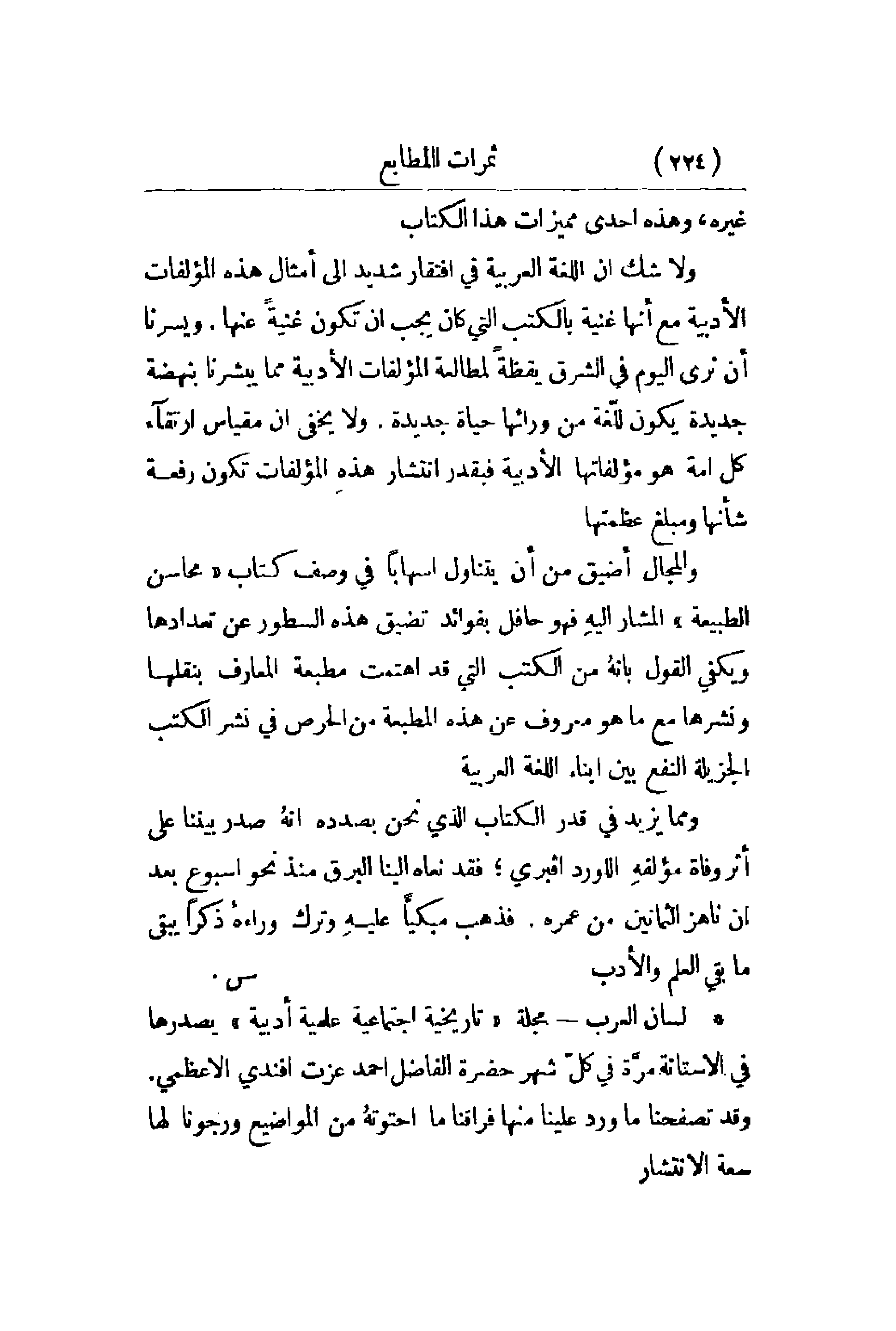 غيره , وهذه إحدى مميزات هذا الكتاب. ولا شك أن اللغة العربية في افتقار شديد إلى أمثال هذه المؤلفات الأدبية مع أنها غنية بالكتب التي كان يجب أن تكون غنيةً عنها. ويسرنا أن نرى اليوم للّغة من ورائها حياة جديدة. ولا يخفي أن مقياس ارتقاء كل أمة هو مؤلفاتها الأدبية فبقدر انتشار هذهِ المؤلفات تكون رفعة شأنها ومبلغ عظمتها. والمجال أضيق من أن يتناول إسهاباً في وصف كتاب محاسن الطبيعة المشار إليهِ فهو حافل بفوائد تضيق هذه السطور عن تعدادها ويكفي القول بأنهُ من الكتب التي قد اهتمت مطبعة المعارف المعارف بنقلها ونشرها مع ما هو معروف عن هذه المطبعة من الحرص في نشر الكتب الجزيلة النفع بين أبناء اللغة العربية. ومما يزيد في قدر الكتاب الذي نحن بصدده أنهُ صدر بيننا على أثر وفاة مؤلفهِ اللورد افبري؛ فقد نعه إلينا البرق منذ أسبوع بعد أن ناهز الثمانين من عمره. فذهب مبكيّاً عليهِ وترك وراءهُ ذكراً يبقى ما بقي العلم والأدب.