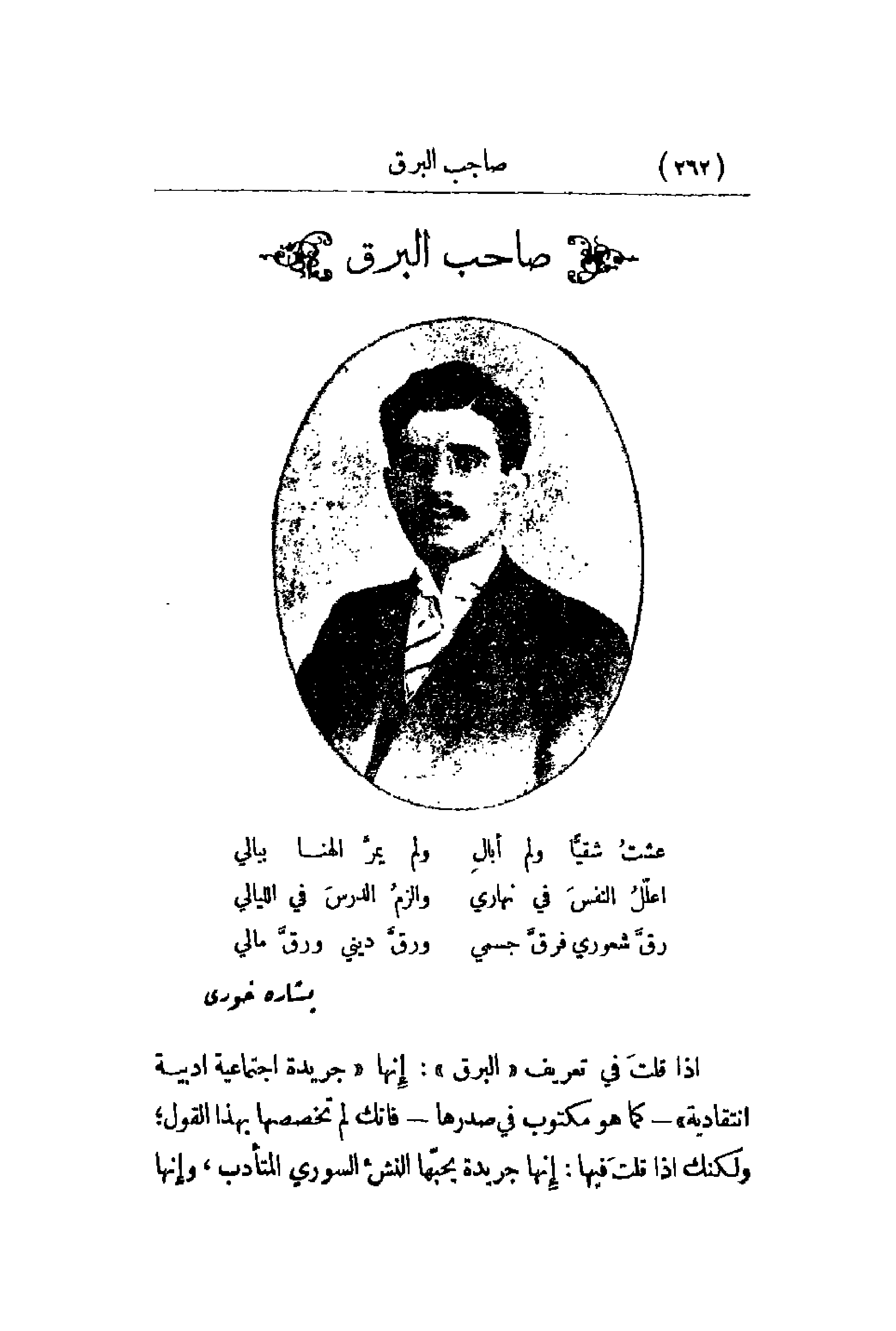 إذا قلتَ في تعريف البرق: إِنها جريدة اجتماعية أدبية انتقاديه - كما هو مكتوب في صدرها - فإنك لم تخصصها بهذا القول؛ ولكنك إذا قلتَ فيها: إِنها جريدة يحبّها النشء السوري المتأدب , وإِنها