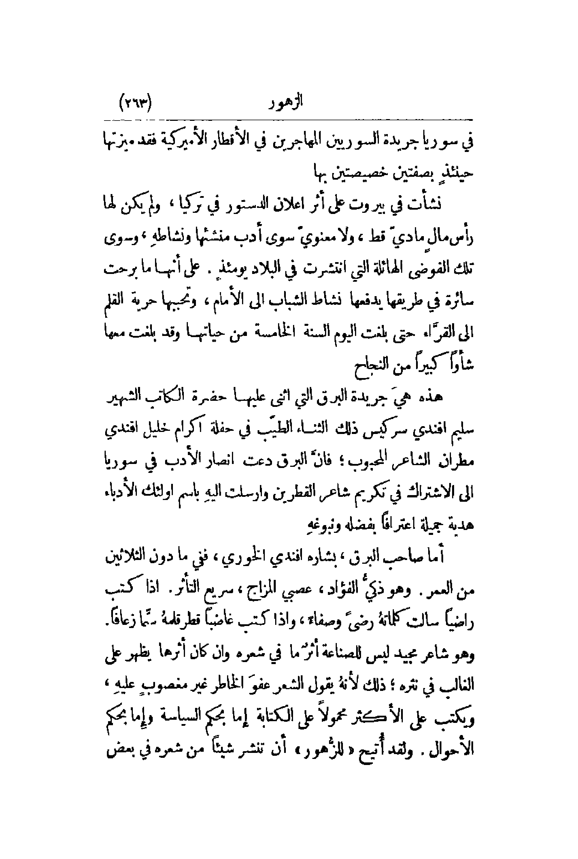 في سوريا جريدة السوريين المهاجرين في الأقطار الأميركية فقد ميزتها حينئذٍ بصفتين خصيصتين بها. نشأت في بيروت على أثر إعلان الدستور في تركيا , ولم يكن لها رأس مالٍ ماديّ قط , ولا معنويّ سوى أدب منشئها ونشاطهِ , وسوى تلك الفوضى الهائلة التي انتشرت في البلاد يومئذ. على أنها ما برحت سائرة في طريقها يدفعها نشاط الشباب إلى الأمام , وتحببها حرية القلم إلى القرَّاء حتى بلغت اليوم السنة الخامسة من حياتها وقد بلغت معها شأواً كبيراً من النجاح. هذه هي جريدة البرق التي اثني عليها حضرة الكاتب الشهير سليم أفندي سركيس ذلك الثناء الطيّب في حفلة إكرام خليل أفندي مطران الشاعر المحبوب؛ فإنَّ البرق دعت أنصار الأدب في سوريا إلى الاشتراك في تكريم شاعر القطرين وأرسلت إليهِ باسم أولئك الأدباء هدية جميلة اعترافاً بفضله ونبوغهِ. أما صاحب البرق , بشارة أفندي الخوري , ففي ما دون الثلاثين من العمر. وهو ذكيُّ الفؤاد , عصبي المزاج , سريع التأثر. إذا كتب راضياً سالت كلماتهُ رضيً وصفاءً , وإذا كتب غاضباً قطر قلمهُ سّماً زعافاً. وهو شاعر مجيد ليس للصناعة أثرٌ ما في شعره وإن كان أثرها يظهر على الغالب في نثره؛ ذلك لأنهُ يقول الشعر عفواَ الخاطر غير مغضوب عليهِ , ويكتب على الأكثر محمولاً على الكتابة إما بحكم السياسة وإِما بحكم الأحوال. ولقد أُتيح للزُّهور أن تنشر شيئاً من شعره في بعض
