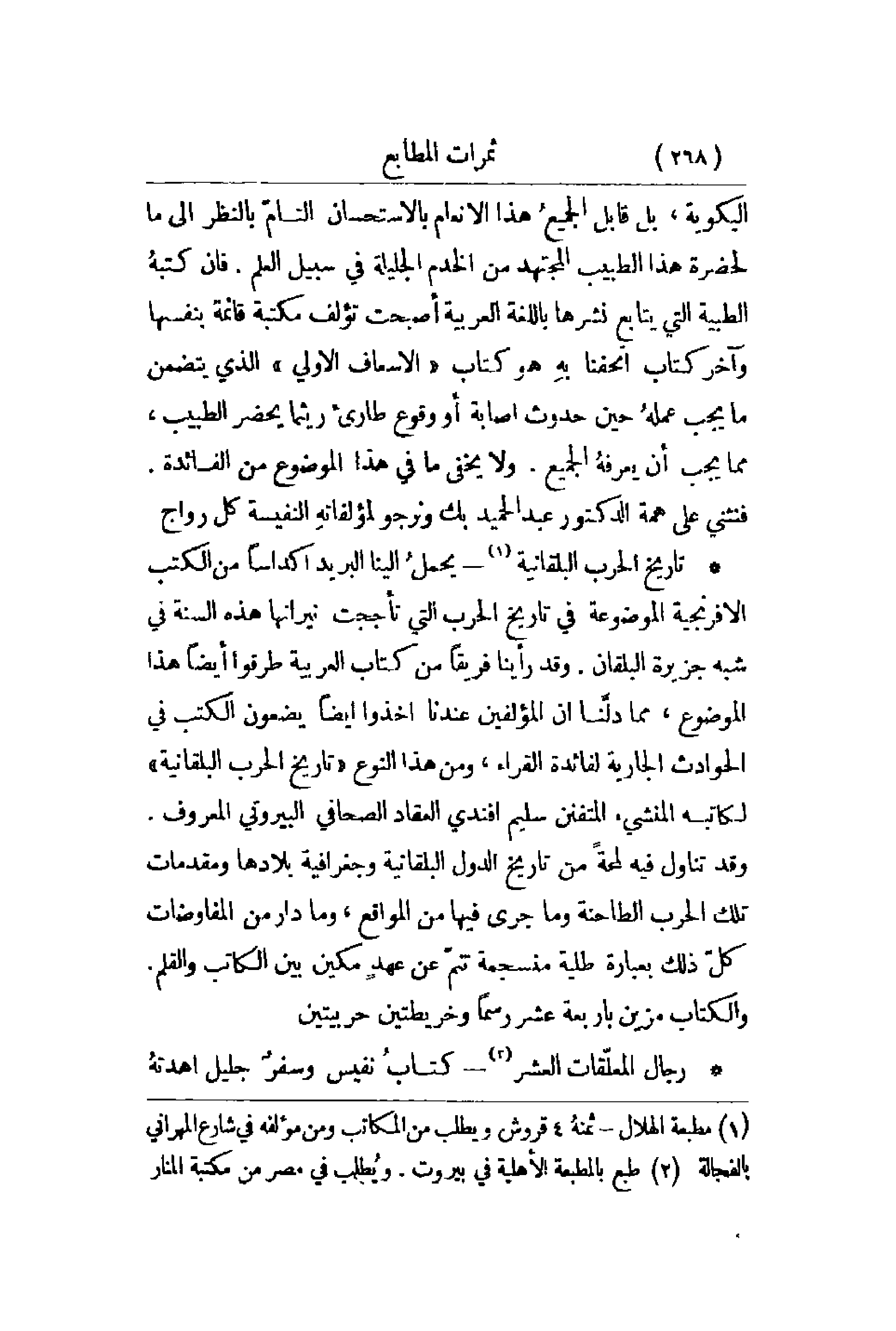 البكوية , بل قابل الجميعُ هذا الأنعام بالاستحسان التامّ بالنظر إلى ما لحضرة هذا الطبيب المجتهد من الخدم الجليلة في سبيل العلم. فإن كتبهُ الطبيبة التي يتابع نشرها باللغة العربية أصبحت تؤلف مكتبة قائمة بنفسها وآخر كتاب أتحفنا بهِ هو كتاب الإسعاف الأولي الذي يتضمن ما يجب أن يعرفهُ الجميع. ولا يخفي ما في هذا الموضوع من الفائدة. فنثني على همة الدكتور عبد الحميد بك ونرجو لمؤلفاتهِ النفسية كل رواج.