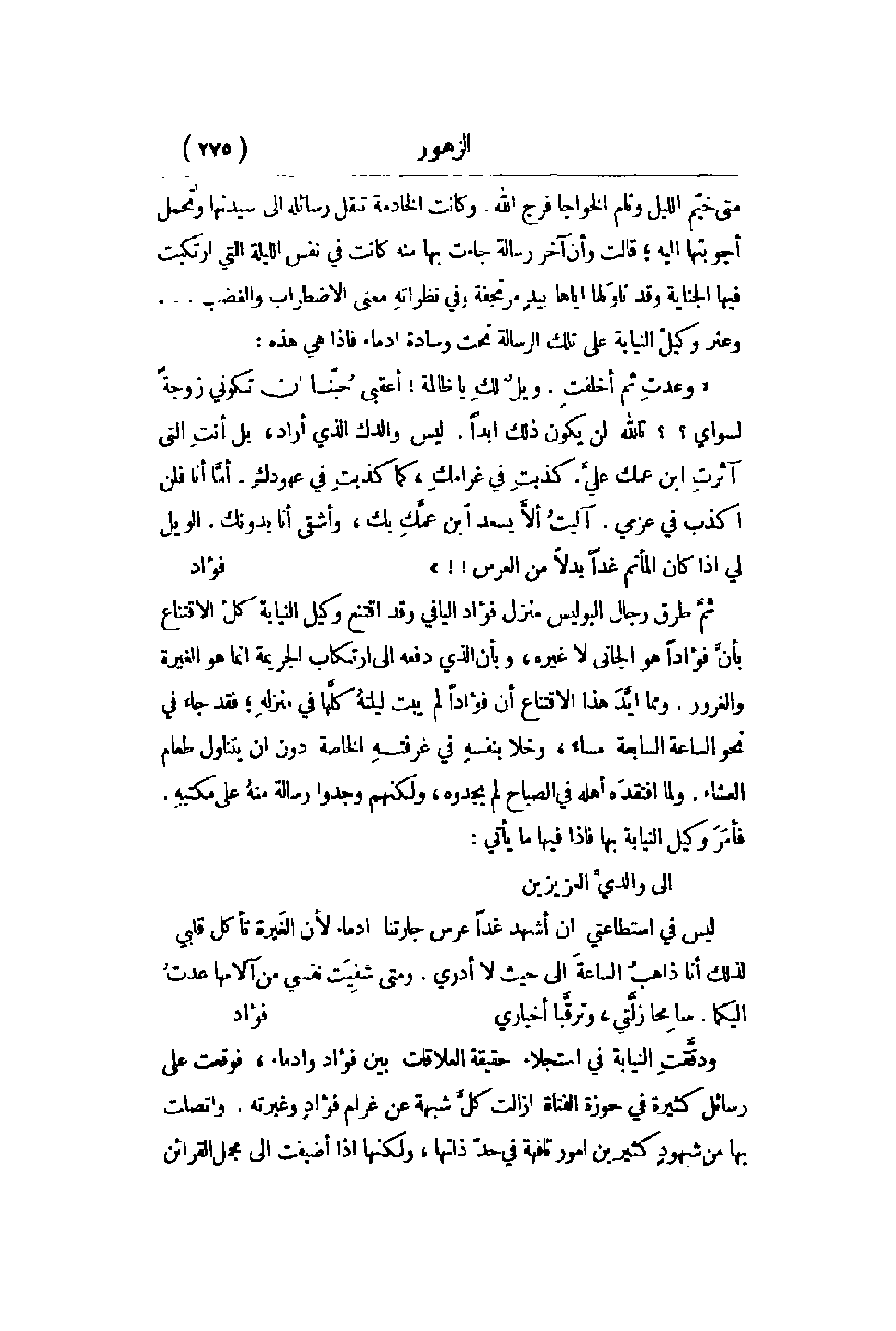 وعدتِ ثم أخلفتِ. ويلٌ لكِ يا ظالمة! أعقبي حبّنا إن تكوني زوجةً لسواي؟ تالله لن يكون ذلك أبداً. ليس والدك الذي ارادو بل أنتِ التي اثرتِ ابن عمك عليَّ. كذبتِ في غرامكِ , كما كذبتِ في عهودكِ. أمَّا أنا فلن أكذب في عزمي. آليتُ ألاَّ يسعد ابن عمَّكِ بك , وأشقى أنا بدونك. الويل لي إذا كان المأتم غداً بدلاً من العرس!!