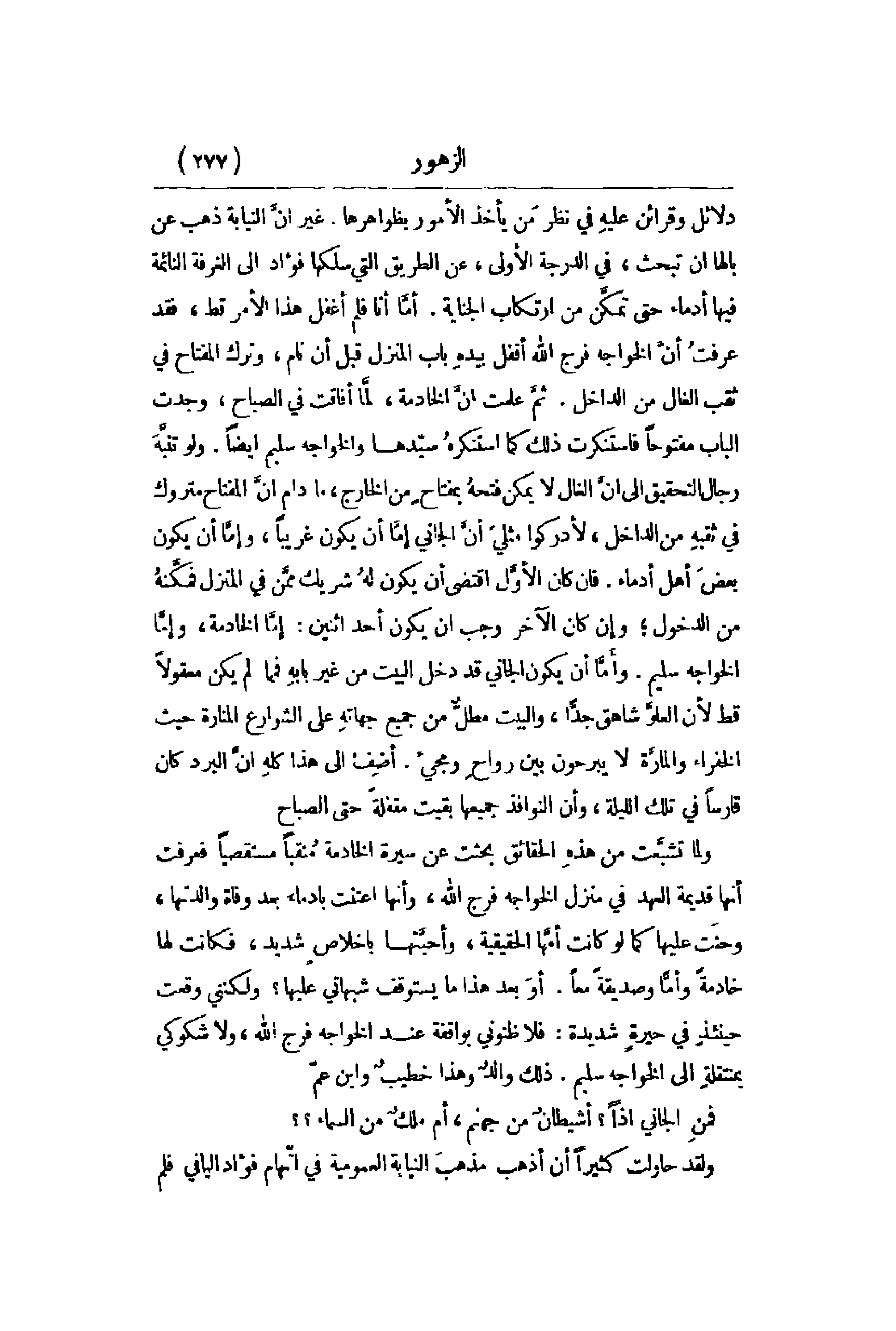 دلائل وقرائن عليهِ في نظر عليهِ في نظر مَن يأخذ الأمور بظواهرها. غير أنَّ النيابة ذهب عن بالها أن تبحث , في الدرجة الأولى , عن الطريق التي سلكها فؤاد إلى الغرفة النائمة فيها أدماء حتى تمكن من ارتكاب الجنلية. أمَّا أنا فلم أغفل هذا الأمر قط , فقد عرفتُ أنَّ الخواجه فرج الله أقفل بيدهِ باب المنزل قبل أن نام , وترك المفتاح في ثقب الغال من الداخل. ثمَّ علمت أنَّ الخادمة , لمَّا أفاقت في الصباح , وجدت الباب مفتوحاً فاستنكرت ذلك كما استنكرهُ سيدها والخواجة