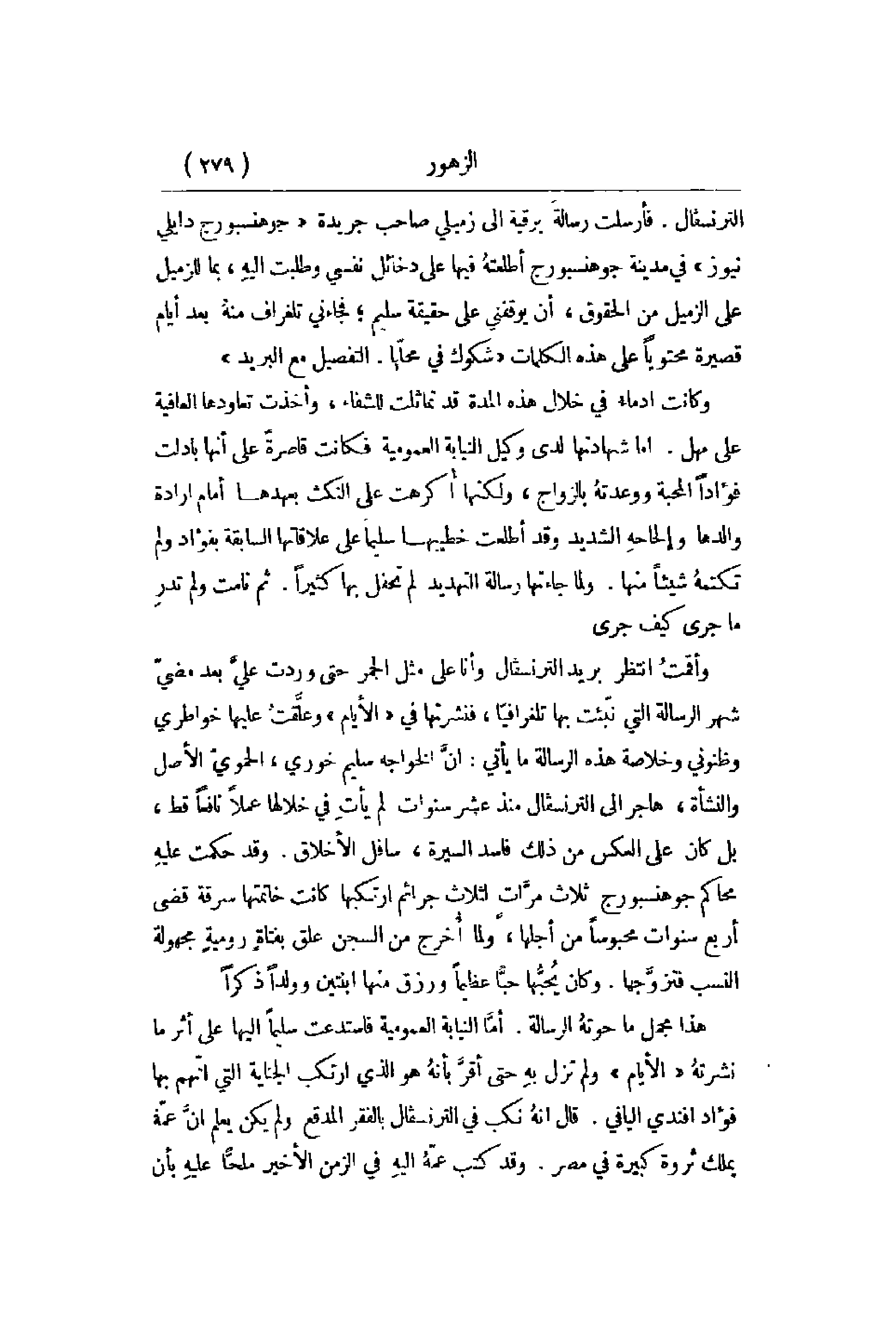 الترنسفال. فأرسلت رسالة برقية إلى زميلي صاحب جريدة جوهسبورج دايلي نيوز في مدينة جوهنسبوج اطلعتهُ فيها على دخائل نفسي وطلبت إليهِ , بما للزميل على الزميل من الحقوق , أن يوقفني على حقيقة سليم؛ فجاءَني تلغراف منهُ بعد أيام قصيرة محتوياً على هذه الكلمات شكوك في محلهاز التفصيل مع البريد وكانت أدماء في خلال هذه المدة قد تماثلت لشفاء , وأخذت تعاودها العافية على مهل. أما شهادتها لدى وكيل النيابة العمومية فكانت قاصرة على أنها بادلت فؤاداً المحبة ووعدتهُ بالزواج , ولكنها أكرهت على النكث بعهدها أمام إرادة والدها وإلحاحهِ الشديد وقد أطلعت خطيبها سليماً عى علاقاتها السابقة بفؤاد ولم نكتمهُ شيئاً منها. ولما جاءتها رسالة التهديد بم تحفل بها كثيراً. ثم نامت ولم تدرِ ما جرى كيف جرى. وأقمتُ انتظر بريد الترنيسفال وأنا على مثل الجمر حتى وردت عليَّ بعد مضيّ شهر الرسالة التي نبّثت به تلغرافيَّا , فنشرتها في الأيام وعلَّقت عليها خواطري وظنوني وخلاصة هذه الرسالة منذ عشر سنوات لم يأتِ في خلاها عملاً نافعاً قط بل كان على العكس من ذلك فاسد السيرة , سافل الأخلاق. وقد حكمت عليهِ محاكم جوهنسبورج ثلاث مرَّات لثلاث جرائم ارتكبها كانت خاتمتها سرقة قضى أربع سنوات محبوساً من أجلها , ولما أخرج من السجن علق بفتاةٍ روميةٍ مجهولة النسب فتزوَّجها. وكان يُحبّها حبّاَ عظيماً ورزق منها ابنتين وولداً ذكراً. هذا مجمل ما حوتهُ الرسالة. أمَّا النيابة العمومية فاستدعت سلماً إليها على أثر ما نشرتهُ الأيام ولم تزل بهِ حتى أقرَّ بأنهُ هو الذي ارتكب