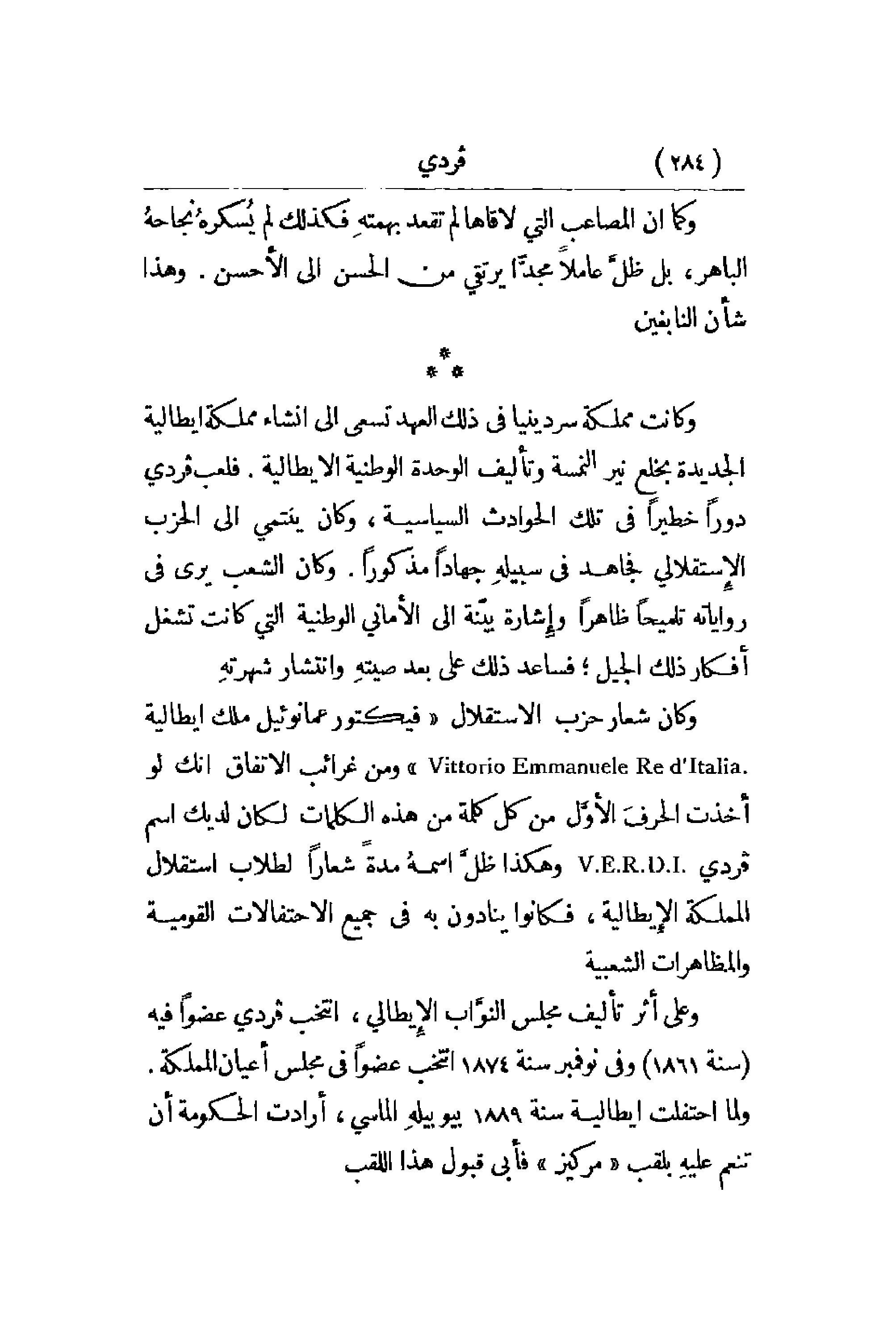 الشعبية. وعلى أثر تأليف مجلس النوَّاب الإِيطلي , انتخب فردي عضواً فيه سنة 1861 وفي نوفمبر سنة 1874 انتخب عضواً في مجلس أعيان المملكة. ولما احتفلت إيطالية سنة 1889 بيوبيلهِ الماسي , أرادت الحكومة أن تنعم عليهِ بلقب مركيز فأبى قبول هذا اللقب