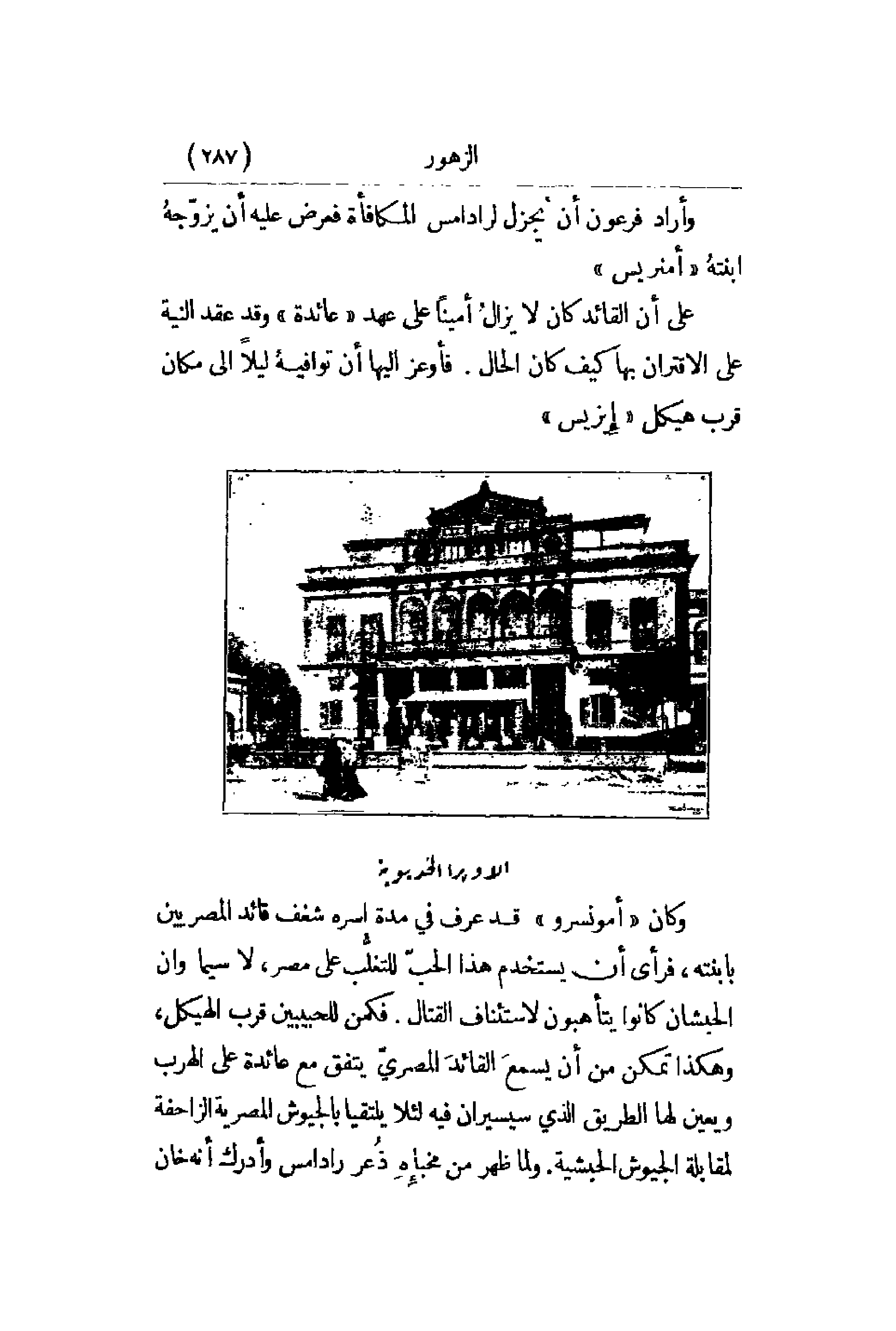 وأراد فرعون أن يُجزل لرادامس المكافأة فعرض عليه أن يزوّجهُ ابنتهُ أمنريس على أن القائد كان لا يزالُ أميناً على عهد عائدة وقد عقد النية على الاقتران بها كيف كان الحال. فأوعز إليها أن توافيه ليلاً إلى مكان قرب هيكل