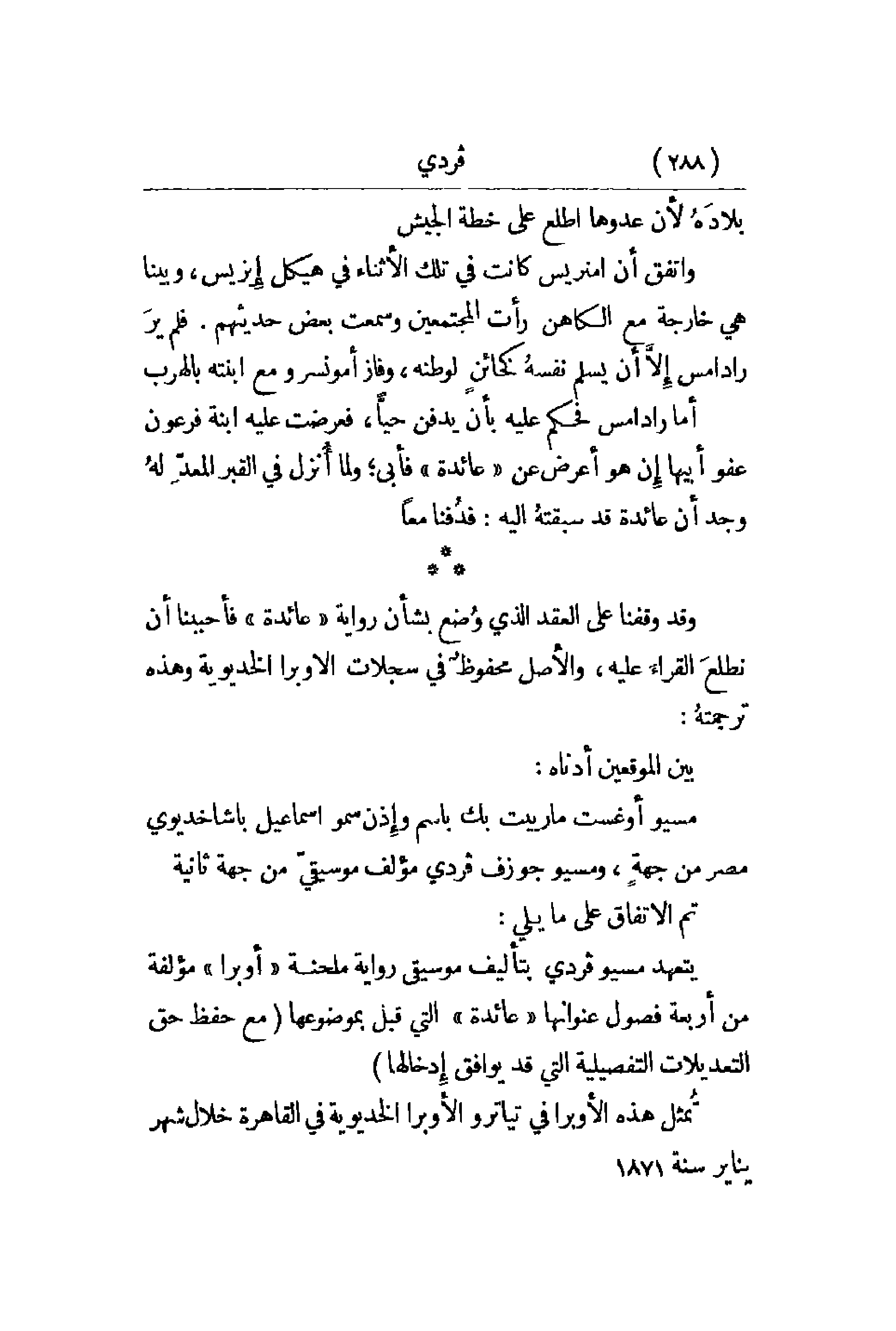 يتعهد مسيو فردي بتأليف موسيقي رواية ملحنة أوبرا مؤلفة من أربعة فصول عنوانها عائدة التي قبل بموضوعها مع حفظ حق التعديلات التفصيلية التي قد يوافق إِدخالها تُمثل هذه الأوبرا في تياترو الأوبرا الخديوية في القاهرة خلال شهر يناير سنة 1871.
