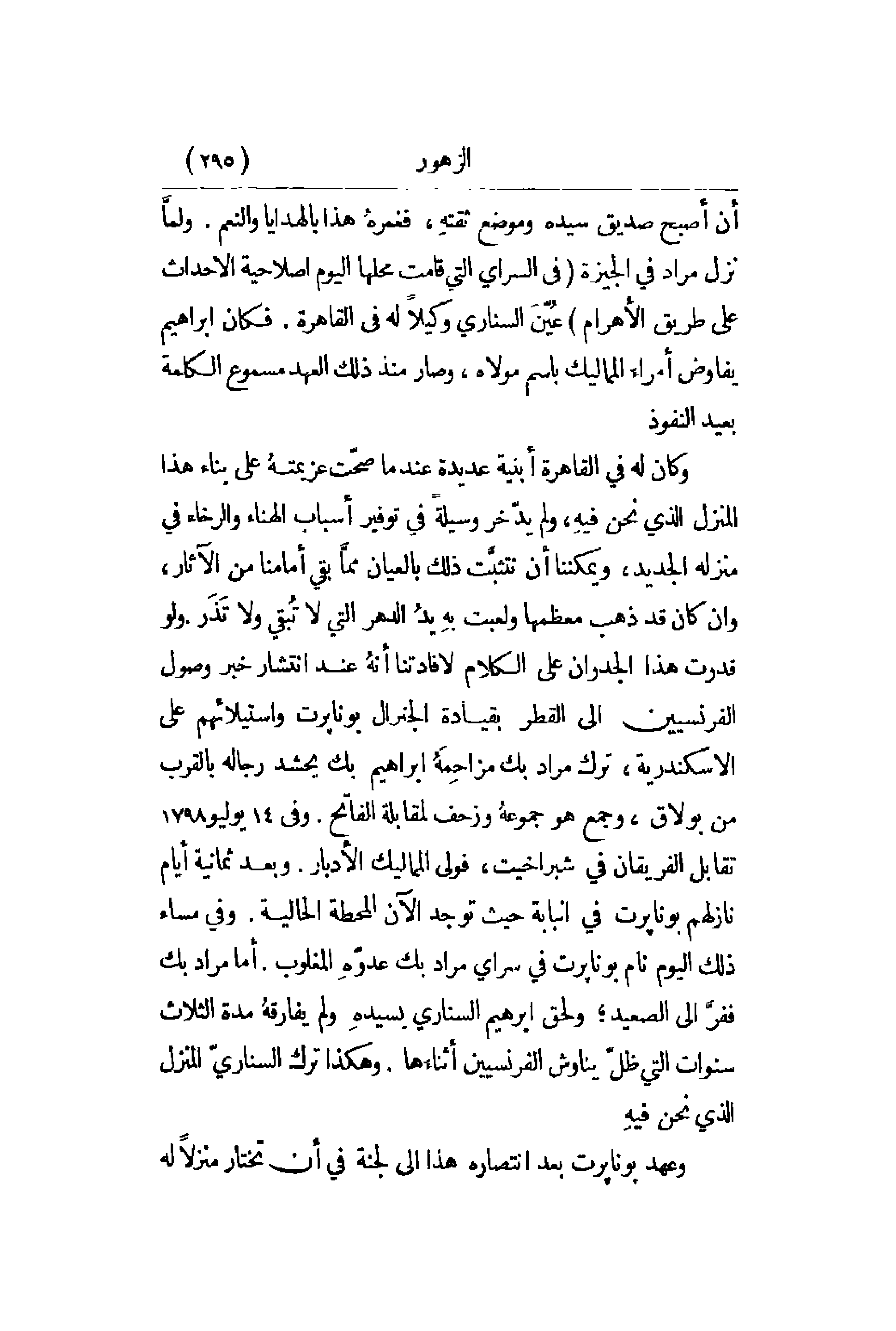 الأحداث على طريق الأهرام عُيّنَ السناري وكيلاً له في القاهرة. فكان إبراهيم يفلوض امراء المماليك باسم مولاه , وصار منذ ذلك العهد مسموع الكلمة بعيد النفوذ. وكان له في القاهرة أبنية عديدة عندما صحّت عزيمتهُ على بناء هذا المنزل الذي نحن فيهِ , ولم يدّخر وسيلةً في توفير أسباب الهناء والرخاء في منزله الجديد , ويمكننا أن نتثبَّت ذلك بالعيان ممَّا بقي أمامنا من الآثار , وإن كان قد ذهب معظمها ولعبت بهِ يدُ الدهر التي لا تُبقي ولا تَذّر. ولو قدرت هذا الجدران على الكلام لإفادتنا أنهُ عند انتشار خبر وصول الفرنسيين إلى القطر بقيادة الجنرال بونابرت واستيلائهم على الاسكندرية , ترك مراد بك مزاحِمَهُ إبراهيم بك يحشد رجاله بالقرب من بولاق , وجمع هو جموعهُ وزحف لمقابلة الفاتح وفي 14 يوليو 1798 تقابل الفريقان في شبراخيت , فولى المماليك الأدبار. وبعد ثمانية أيام نازلهم بونابرت في أنبابة حيث توجد الآن المحطة الحالية. وفي مساء ذلك اليوم نام بونابرت في سراي مراد بك عدّوهِ المغلوب. أما مراد بك ففرَّ إلى الصعيد؛ ولحق إبراهيم السناري بسيدهٍ ولم يفارقهُ مدة الثلاث سنوات التي ظلّ يناوش الفرنسيين أثناءَها. وهكذا ترك السناريّ المنزل الذي نحن فيهِ. وعهد بونابرت بعد انتصاره هذا إلى الجنة في أن تختار منزلاً له