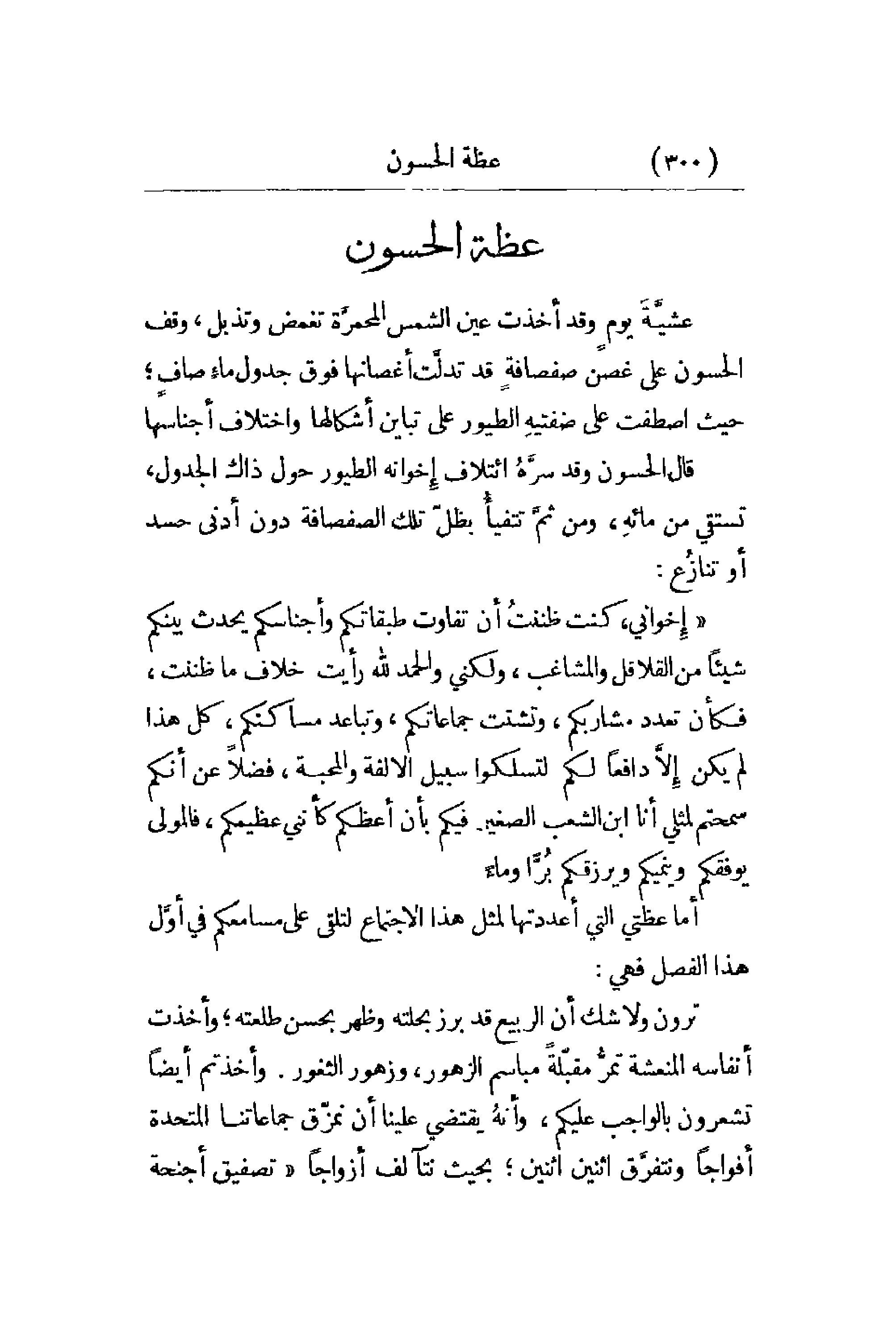 عشيَّةَ يومٍ وقد أخذت عين الشمس المحمرَّة تغمض وتذبل , وقف الحسون على غصت صفصافةٍ قد تدلَّت أغصانها فوق جدول ماءٍ صافٍ؛ حيث اصطفت على ضفتيهِ الطيور على تباين أشكالها واختلاف أجناسها قال الحسون وقد سرَّهُ ائتلاف إِخوانه الطيور حول ذاك الجدول , تستقي من مائهِ , ومن ثمَّ تتفيأُ بظلّ تلك الصفصافة دون أدنى حسد أو تنازُع: إخواني , كنت ظننتُ أن تفاوت طبقاتكم وأجناسكم يحدث بينكم شيئاً من القلاقل والمشاغب , ولكني والحمد لله رأيت خلاف ما ظننت , فكأن تعدد مشاربكم , وتشتت جماعاتكم , وتباعد مساكنكم , كل هذا لم يكن إلاَّ دافعاً لكم لتسلكوا سبيل الألفة والمحبة , فضلاً عن أنكم سمحتم لمثلي أنا ابن الشعب الصغير فيكم بأن أعظكم كأنني عظيمكم , فالمولى يوفقكم وينميكم ويرزقكم بُرّاً وماءً. أما عظتي التي أعددتها لمثل هذا الاجتماع لتلقي على مسامعكم في أوَّل هذا الفصل فهي: ترون ولاشك أن الربيع قد برز بحلته وظهر بحسن طلعته؛ وأخذت أنفاسه المنعشة تمرُّ مقبّلةً مباسم الزهور , وزهور الثغور. وأخذتم أيضاً تشعرون بالواجب عليكم , وأنه يقتضي علينا أن نمزّق جماعاتنا المتحدة أفواجاً ونتفرَّق اثنين اثنين؛ بحيث نتألف أزواجاً تصفيق أجنحة