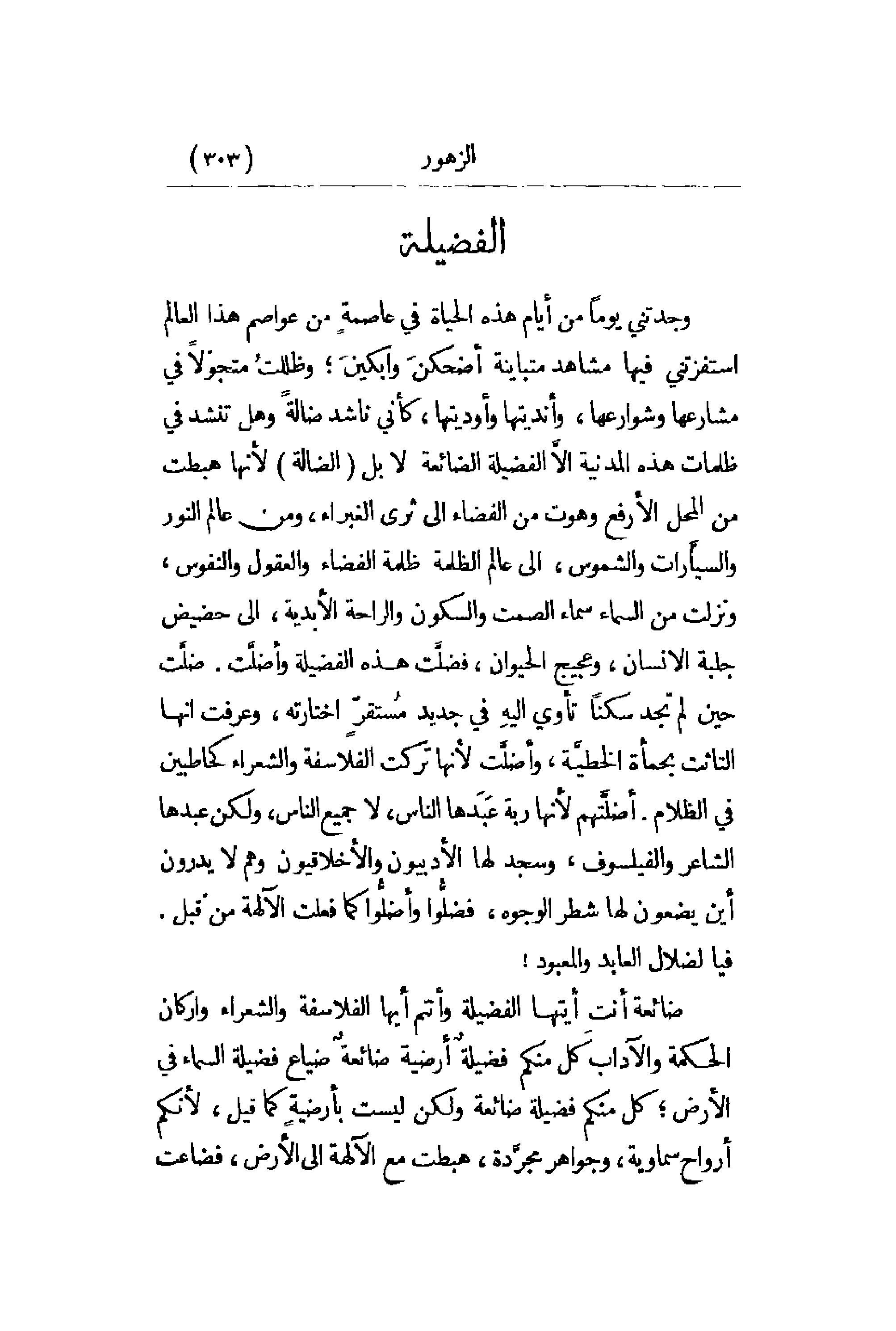 وجدتني يوماً من أيام هذه الحياة في عاصمةٍ من عواصم هذا العالم استفزتني فيها مشاهد متباينة أضحكنَ وابكينَ؛ وظللتُ متجولاً في مشارعها وشوارعها , وأنديتها وأوديتها , كأني ناشد ضالةً وهل تنشد في ظلمات هذه المدينة إلاَّ الفضيلة الضائعة لا بل الضالة لأنها هبطت من المحل الأرفع وهوت من الفضاء إلى ثرى الغبراء ومن عالم النور والسيَّارات والشموس , إلى عالم الظمة ظلمة الفضاء والعقول والنفوس , ونزلت من السماء سماء الصمت والسكون والراحة الأبدية , إلى حضيض جلبة الإنسان , وعجيج الحيوان , فضلَّت هذه الفضيلة وأضلَّت. ضلَّت حين لم تجد سكناً تأوي إليهِ في جديد مُستقرٍّ اختارته , وعرفت أنها التاثت بحمأة الخطيَّة , وأضلَّت لأنها تركت الفلاسفة والشعراء كحاطبين في الظلام. أضلَّتهم لأنها ربة عَبَدها الناس , لا جميع الناس , ولكن عبدها الشاعر والفيلسوف , وسجد لها الأدبيون والأخلاقيون وهم لا يدرون أين يضعون لها شطر الوجوه , فضلَّوا وأضلُّوا كما فعلت الآلهة من قبل فيا لضلال العابد والمعبود! ضائعة أنت أيتها الفضيلة وأنتم أيها الفلاسفة والشعراء وأركان الحكمة والآداب كل منكم فضيلةٌ أرضية ضائعة ضياع فضيلة السماء في الأرض؛ كل منكم فضيلة ضائعة ولكن يست بأرضيةٍ كما قيل , لأنكم أرواح سماوية , وجواهر مجرَّدة , هبطت مع الآلهة إلى الأرض, فضاعت