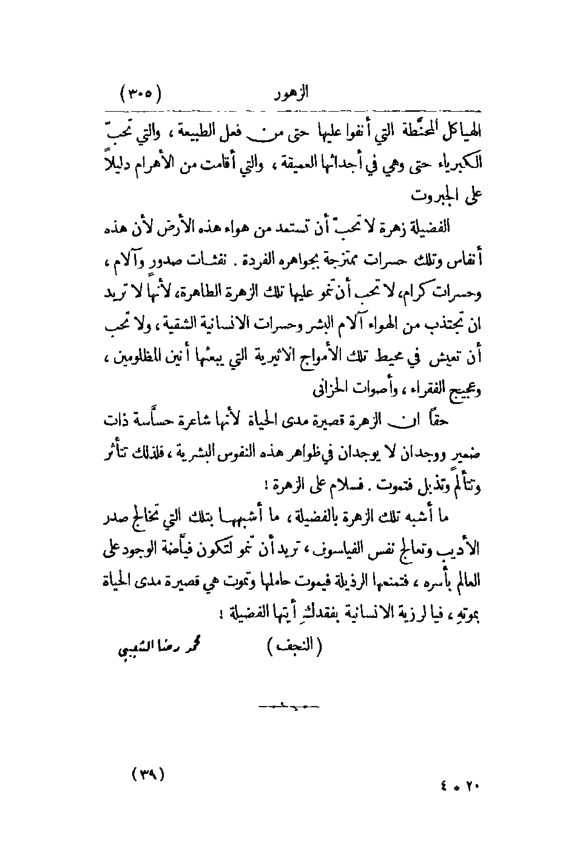 الهياكل المحنَّطة التي أنفوا عليها حتى من فعل الطبيعة , والتي تحبّ الكبرياء حتى وهي أجداثها العميقة , والتي أقامت من الأهرام دليلاً على الجبروت. الفضيلة زهرة لا تحبّ أن تستمد من هواء هذه الأرض لأن هذه أنفاس وتلك حسرات ممتزجة بجواهره الفردة. نفثات صدورٍ وآلام , وحسرات كرام , لا تحب أن تنمو عليها تلك الزهرة الطاهرة , لأنها لا تريد أن تجتذب من الهوء آلام البشر وحسرات الإنسانية الشقية , ولا تحب أن تعيش في محيط تلك الأمواج الاثيرية التي يبعثها أنين المظلومين , وعجيج الفقراء , وأصوات الحزاني. حقاً أن الزهرةة قصيرة مدى الحياة لأنها شاعرة حسَّاسة ذات ضمير ووجدان في ظواهر هذه النفوس البشرية , فلذلك تتأثر وتتألم وتذبل تموت. فسلام على الزهرة! ما أشبه تلك الزهرة بالفضيلة , ما أشبهها بتلك التي تخالج صدر الأديب وتعالج نفس الفيلسوف , تريد أنتنمو لتكون فيَّاضة الوجود عى العالم بأسره , فتمنعها الرذيلة فيموت حاملها وتموت قصيرة مدى الحياة بموتهِ , فيا لرزية الإنسانية بفقدكِ أيتها الفضيلة!