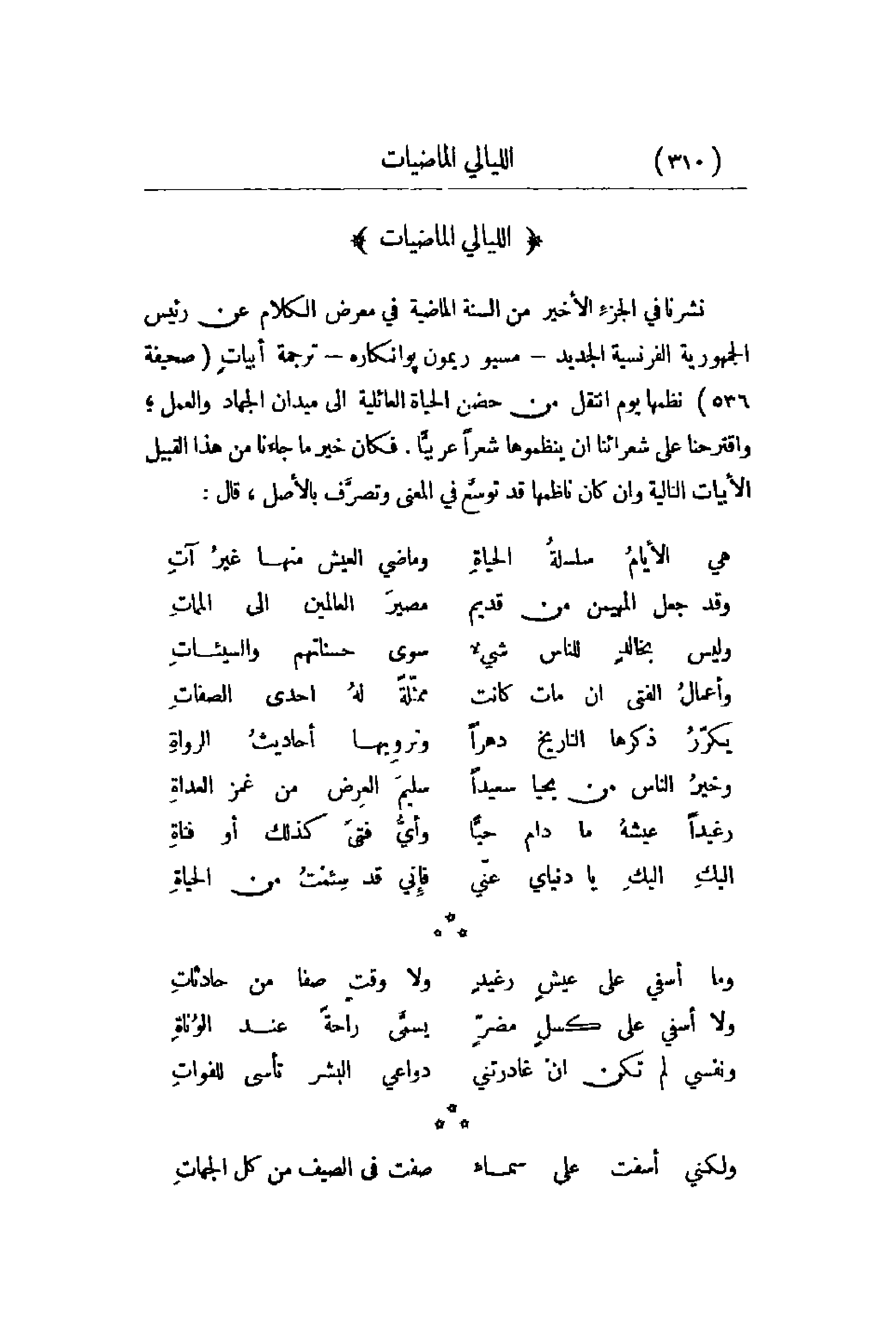 نشرنا في الجزء الأخير من السنة الماضية في معرض الكلام عن رئيس الجمهورية الفرنسية الجديد - مسيو ريمون بوانكاره - ترجمة أبياتٍ صحيفة 536 نظمها يوم انتقل