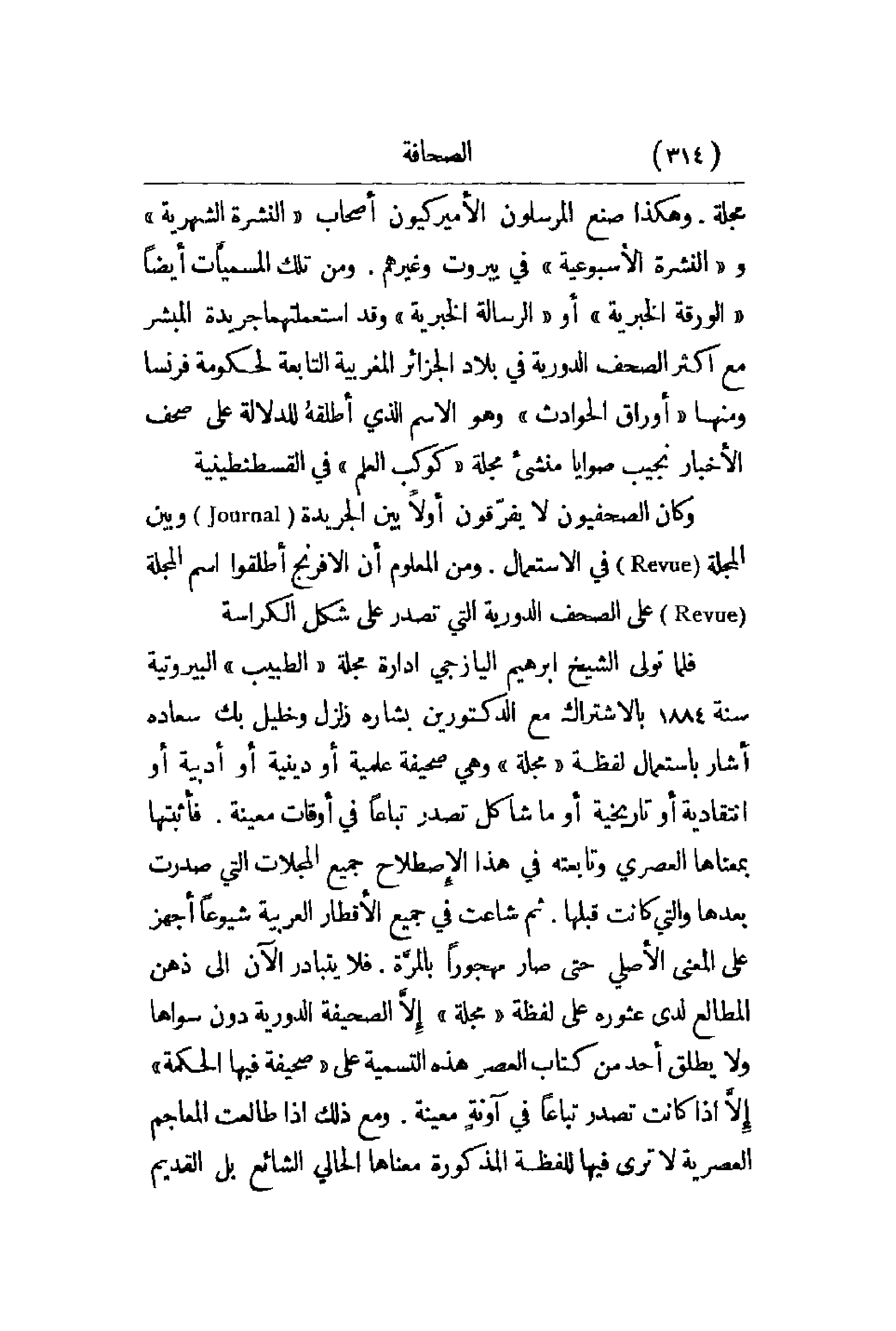 مجلة. وهكذا صنع المرسلون الأميركيون أصحاب النشرة الشهرية والنشرة الأسبوعية99 في بيروت وغيرهم. ومن تلك المسميَّات أيضاً الورقة الخبرية أو الرسالة الخبرية وقد استعملتها جريدة المبشر مع أكثر الصحف الدورية في بلاد الجزائر المغربية التابعة لحكومة فرنسا ومنها أوراق الحوادث وهو الاسم الذي أطلقهُ للدلالة على صحف الأخبار نجيب صوايا منشئ مجلة كوكب العلم في القسطنطينية. وكان الصحفيون لا يفرّقون أولاً بين الجريدة وبين المجلة في الاستعمال. ومن المعلوم أن الإفرنج أطلقوا اسم المجلة على الصحف الدورية التي تصدر على شكل الكراسة. فلما تولى الشيخ إبراهيم اليازجي إدارة مجلة الطبيب البيروتية سنة 1884 بالاشتراك مع الدكتورين بشارة زلزل وخليل بك سعادة أشار باستعمال لفظة مجلة وهي صحيفة علمية أو دينية أو أدبية أو انتقادية أو تاريخية أو ما شاكل تصدر تباعاً في أوقات معينة. فأثبتها بمعناها العصري وتابعته في هذا الاصطلاح جميع المجلات التي صدرت بعدها والتي كانت قبلها. ثم شاعت في جميع الأقطار العربية شيوعاً أجهز على المعنى الأصلي حتى صار مهجوراً بالمرَّة. فلا يتبادر الآن إلى ذهن المطالع لدى عثوره على لفظة مجلة إلاَّ الصحيفة الدورية دون سواها ولا يطلق أحد من كتاب العصر هذه التسمية على صحيفة فيها الحكمة إلاَّ إذا كانت تصدر تباعاً في آونةٍ معينة. ومع ذلك إذا طالعت المعاجم العصرية لا ترى فيها للفظة المذكورة معناها الحالي الشائع بل القديم