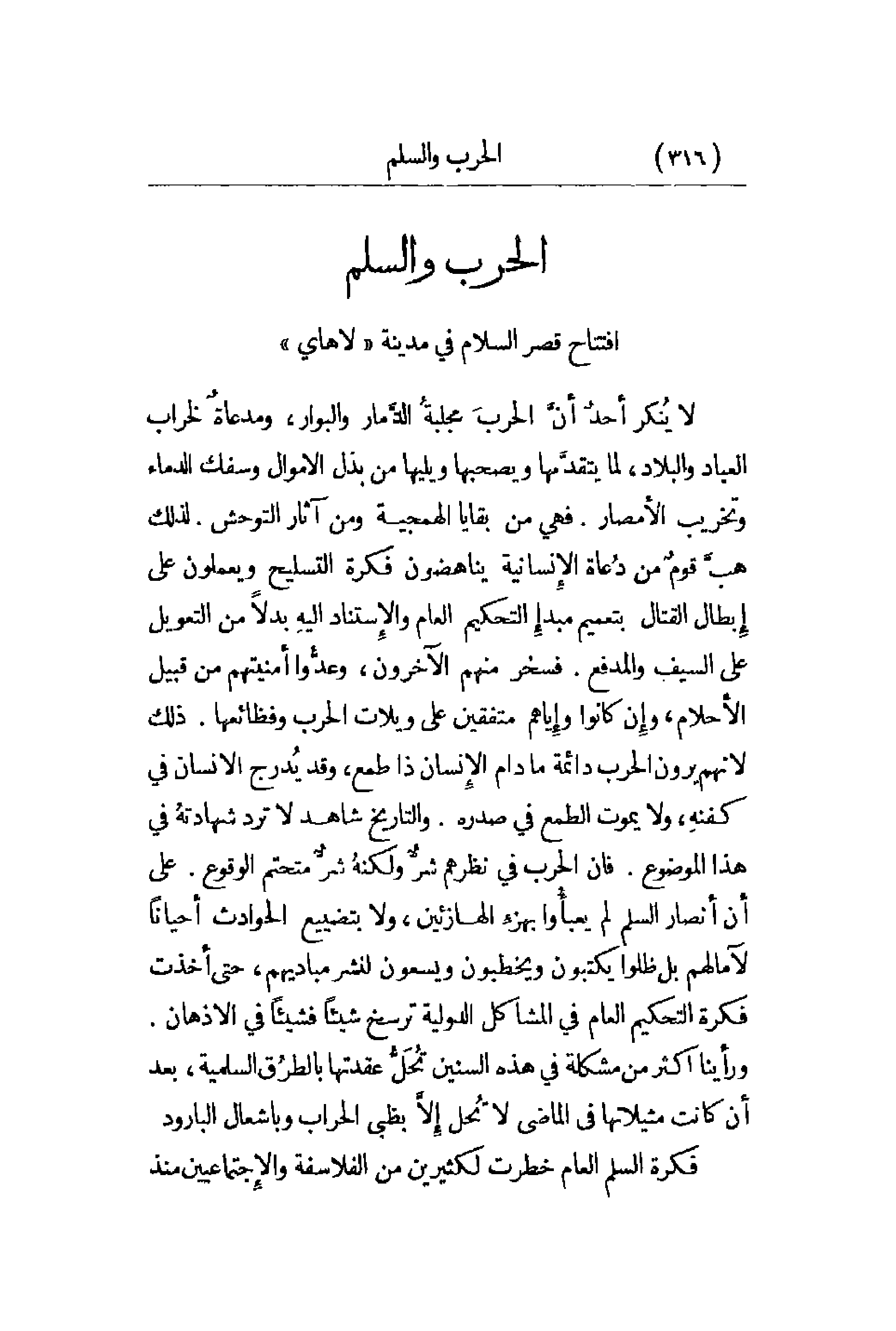 لا يُنكر أحدٌ أنَّ الحربَ مجلبةُ الدَّمار والبوار , ومدعاةٌ لخراب العباد والبلاد , لما يتقدَّمها ويصحبها ويليها من بذل الأموال وسفك الدماء وتخريب الأمصار. فهي من بقايا الهمجية ومن آثار التوحش. لذلك هبَّ قومٌ من دُعاة الإنسانية يناهضون فكرة التسليح ويعملون على إِبطال القتال بتعميم مبدأِ التحكيم العام والاِستناد إليهِ بدلاً من التعويل على السيف والدفع. فسخر منهم الآخرون , وعدُّوا أمنيتهم من قبيل الأحلام , وإِن كانوا وأِباهم متفقين على ويلات الحرب وفظائعهم. ذلك لأنهم يرون الحرب دائمة ما دام الإِنسان ذا طمع , وقد يُدرج الإِنسان في كفنهِ , ولا يموت الطمع في صدره. والتاريخ شاهد لا ترد شهادتهُ في هذا الموضوع. فإن الحرب في نظرهم شرٌّ ولكنهُ شرٌّ متحتم الوقوع. على أن أنصار السلم لم يعبأ وأبهزءِ الهازئين , ولا بتصنيع الحوادث أحياناً لآمالهم بل ظلوا يكتبون ويخطبون ويسعون لنشر مباديهم , حتى أخذت فكرة التحكيم العام في المشاكل الدولية ترسخ شيئاً فشيئاً في الأذهان. ورأينا أكثر من مشكلة في هذه السنين تُحَلُّ عقدتها بالطرُق السلمية , بعد أن كانت مثيلاتها في الماضي لا تُحل إلاَّ بظبي الحراب وبإشعال البارود. فكرة السلم العام خطرت لكثيرين من الفلاسفة والاِجتماعيين منذ