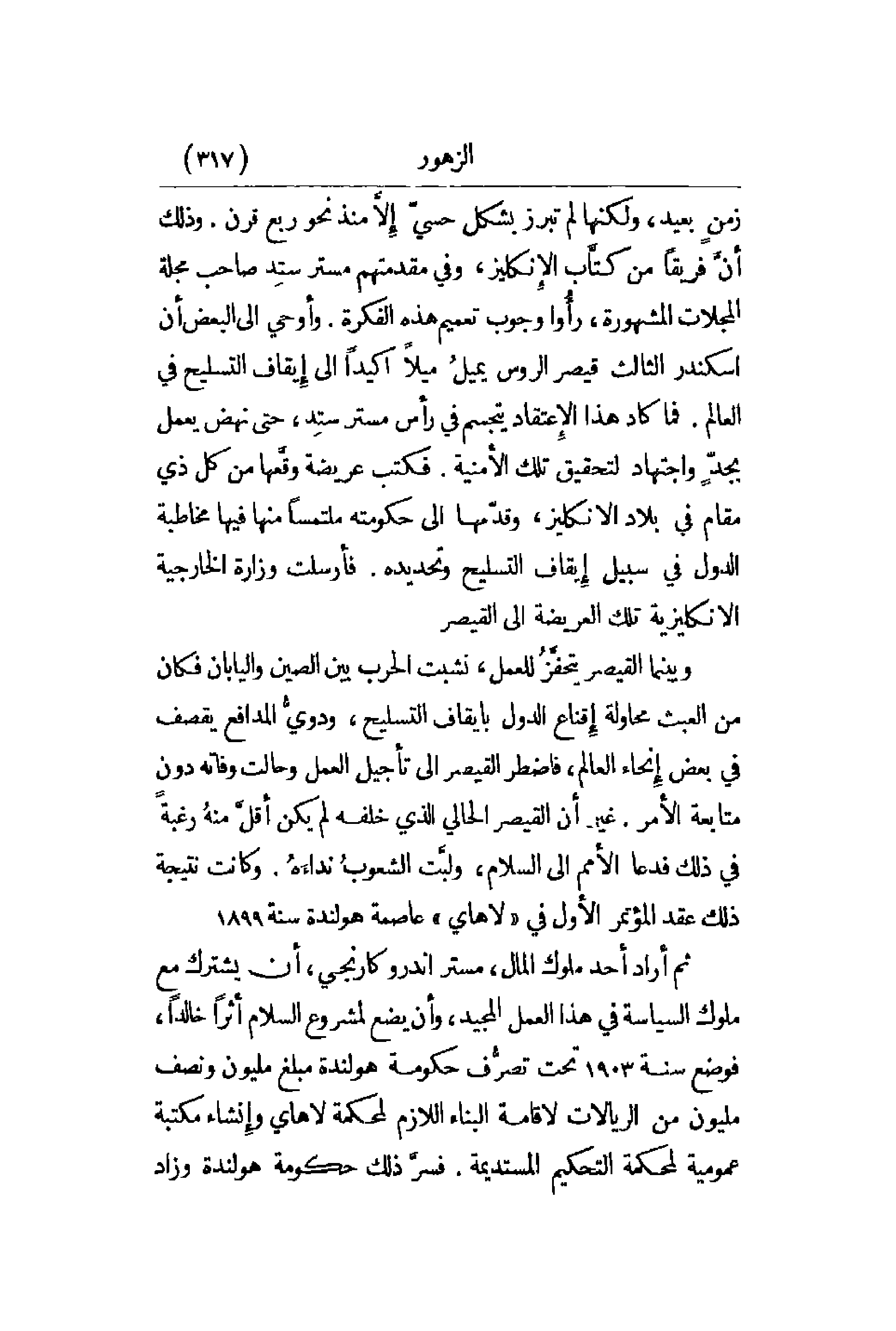 زمنٍ بعيد , ولكنها لم تبرز بشكل حسيّ إلاَّ منذ نحو ربع قرن. وذلك أنَّ فريقاً من كتَّاب الإنكليز , وفي مقدمتهم مستر ستدِ صاحب مجلة المجلات المشهورة , رأُوا وجوب تعميم هذه الفكرة. وأوحي إلى البعض أن اسكندر الثالث قيصر الروس يميلُ ميلاً أكيداً إلى إِيقاف التسليح في العالم. فما كاد هذا الاعتقاد يتجسم في رأس مستر ستدِ , حتى نهض يعمل بجدٍّ واجتهاد لتحقيق تلك الأمنية. فكتب عريضة وقَّعها من كل ذي مقام في بلاد الانكليز , وقدّمها إلى حكومتها ملتمساً منها فيها مخاطبة الدول في سبيل إِيقاف التسليح وتحديده. فأرسلت وزارة الخارجية الانكليزية تلك العريضة إلى القيصر. وبينما القيصر يتحفَّزُ للعمل , نشبت الحرب بين الصين واليابان فكان من العبث محاولة إِقناع الدول بإيقاف التسليح , ودويُّ المدافع يقصف في بعض إِنحاء العالم , فاضطر القيصر إلى تأجيل العمل وحالت وفاته دون متابعة الأمر. غير أن القيصر الحالي الذي خلفه لم يكن أقلَّ منهُ رغبةً في ذلك فدعا الأمم إلى السلام ,