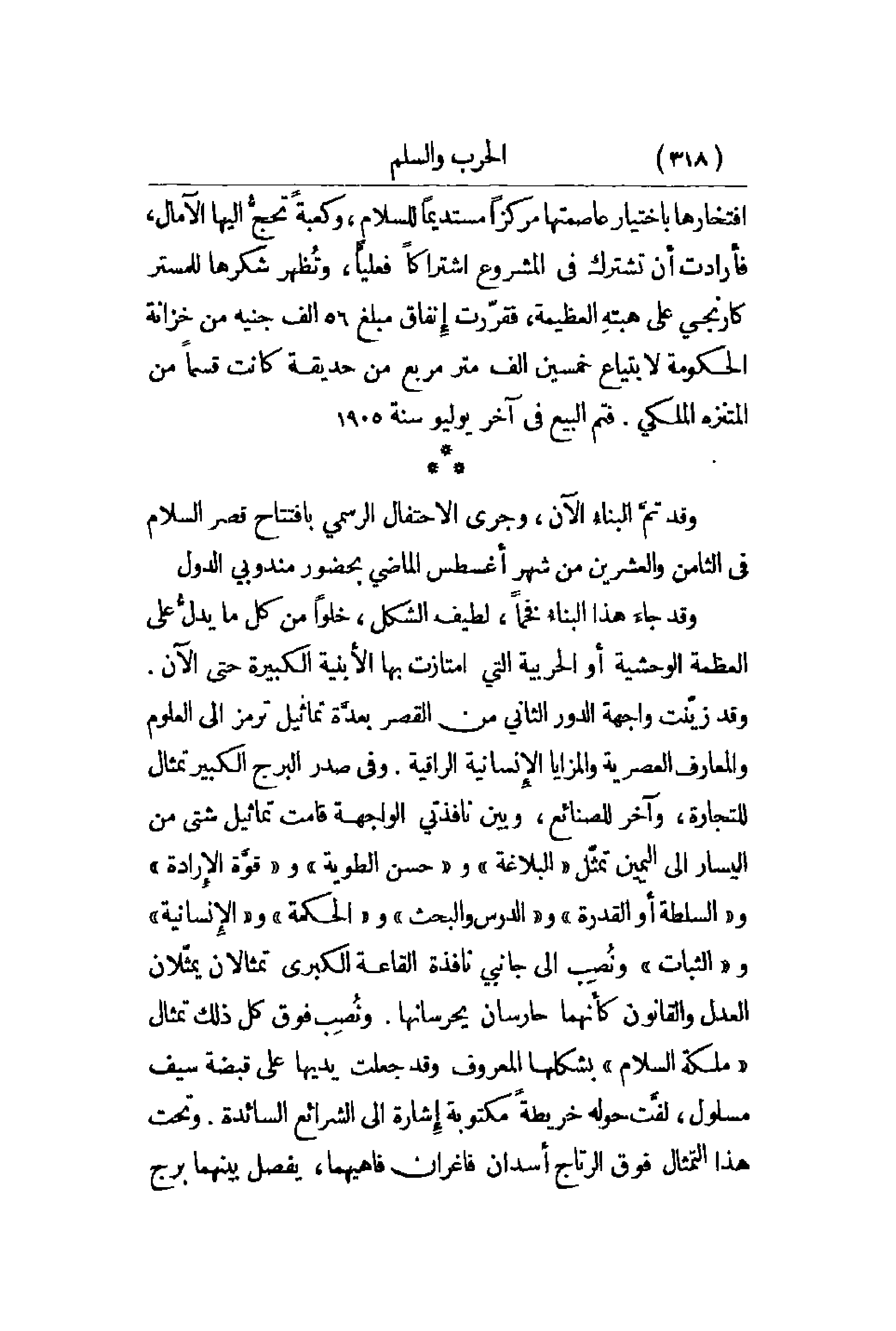 وقد تمَّ البناءُ الآن , وجرى الاحتفال الرسمي بافتتاح قصر السلام في الثامن والعشرين من شهر أغسطس الماضي بحضور مندوبي الدول. وقد جاءَ هذا البناءُ فخماً , لطيف الشكل , خلواً من كل ما يدلُّ على العظمة الوحشية أو الحربية التي امتازت بها الأبنية الكبيرة حتى الآن. وقد زيّنت واجهة الدور الثاني من القصر بعدَّة تماثيل ترمز إلى العلوم والمعارف العصرية والمزايا الإِنسانية الراقية. وفي صدر البرج الكبير تمثال للتجارة , وآخر للصنائع , وبين نافذتي الواجهة قامت تماثيل شتى من اليسار إلى اليمين تمثّل البلاغة وحسن الطوية وقوَّة الإِرادة والسلطة أو القدرة والدرس والبحث والحكمة والإِنسانية والثبات ونُصيب إلى جانبي نافذة القاعة الكبرى تمثالان يمثّلان العدل والقانون كأنهما حارسان يحرسانها. ونُصِب فوق كل ذلك تمثال ملكة السلام بشكلها المعروف وقد جعلت يديها على قبضة سيف مسلول , لفَّت حوله خريطةً مكتوبة إِشارة إلى الشرائع السائدة. وتحت هذا التمثال فوق الرتاج أسدان فاغران فاهيهما. يفصل بينهما برج