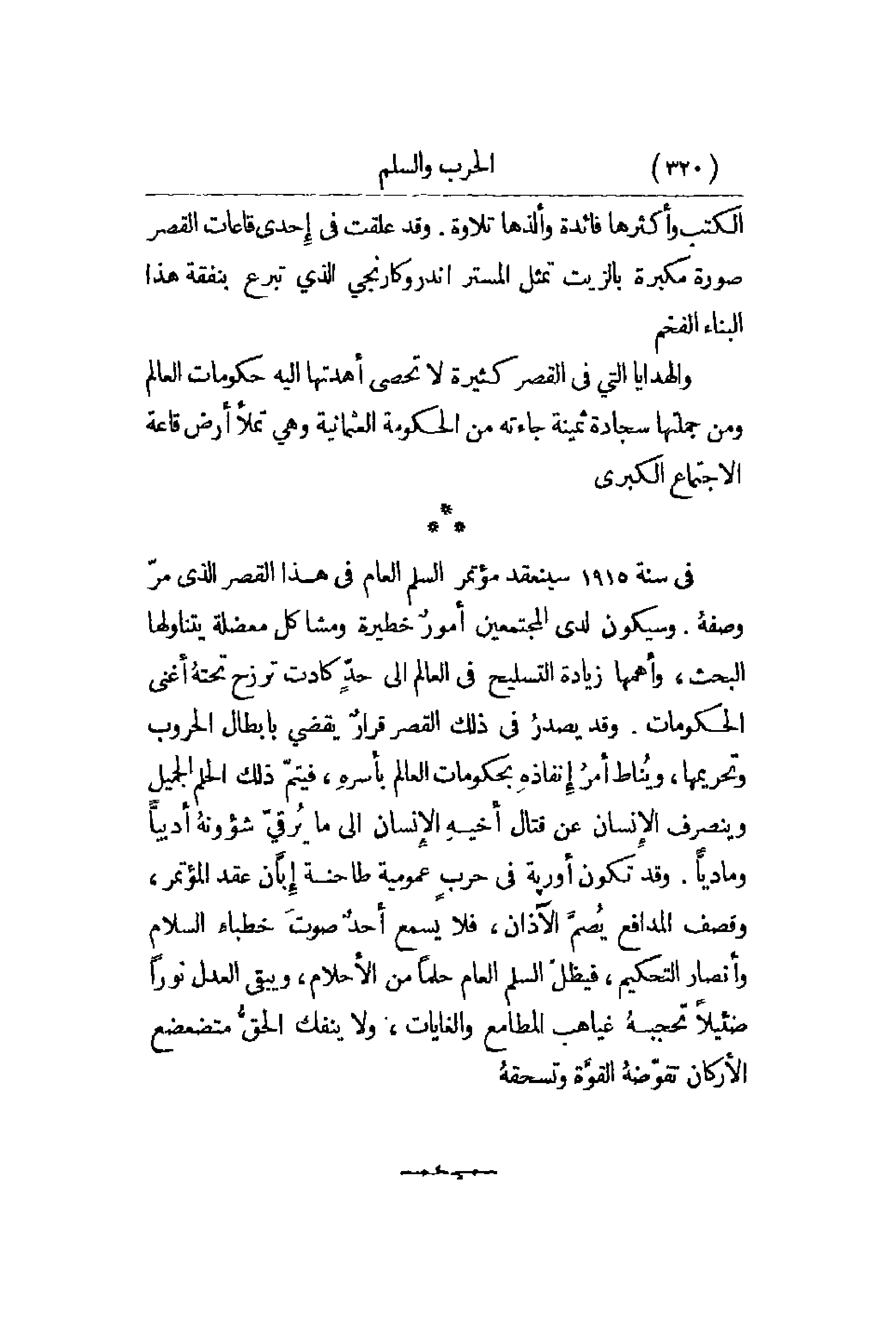 في سنة 1915 سينعقد مؤتمر السلم العام في هذا القصر الذي مرّ وصفهُ. وسيكون لدى المجتمعين أمورٌ خطيرة ومشاكل معضلة يتناولها البحث , وأهمها زيادة التسليح في العالم إلى حدٍّ كادت ترزخ تحتهُ أغنى الحكومات. وقد يصدرُ في ذلك القصر قرارٌ يقضي بإبطال الحروب وتحريمها , ويُناط أمرُ إِنفاذه بحكومات العالم بأسرهِ , فيتم ذلك الحلم الجميل وينصرف الإِنسان عن قتال أخيهِ الإِنسان إلى ما يُرقيّ شؤونهُ أدبيّاً وماديّاً. وقد تكون أوربة في حربٍ عمومية طاحنة إبَّان عقد المؤتمر , وقصف المدافع يُصمَّ الآذان , فلا يسمع أحدٌ صوتَ خطباءِ السلام وأنصار التحكيم , فيظل السلم العام حلماً من الأحلام , ويبقى العدل نوراً ضئيلاً تحجبهُ غياهب المطامع والغايات , ولا ينفك الحقُّ متضعضع الأركان تقوّضهُ القوَّة وتسحقهُ.