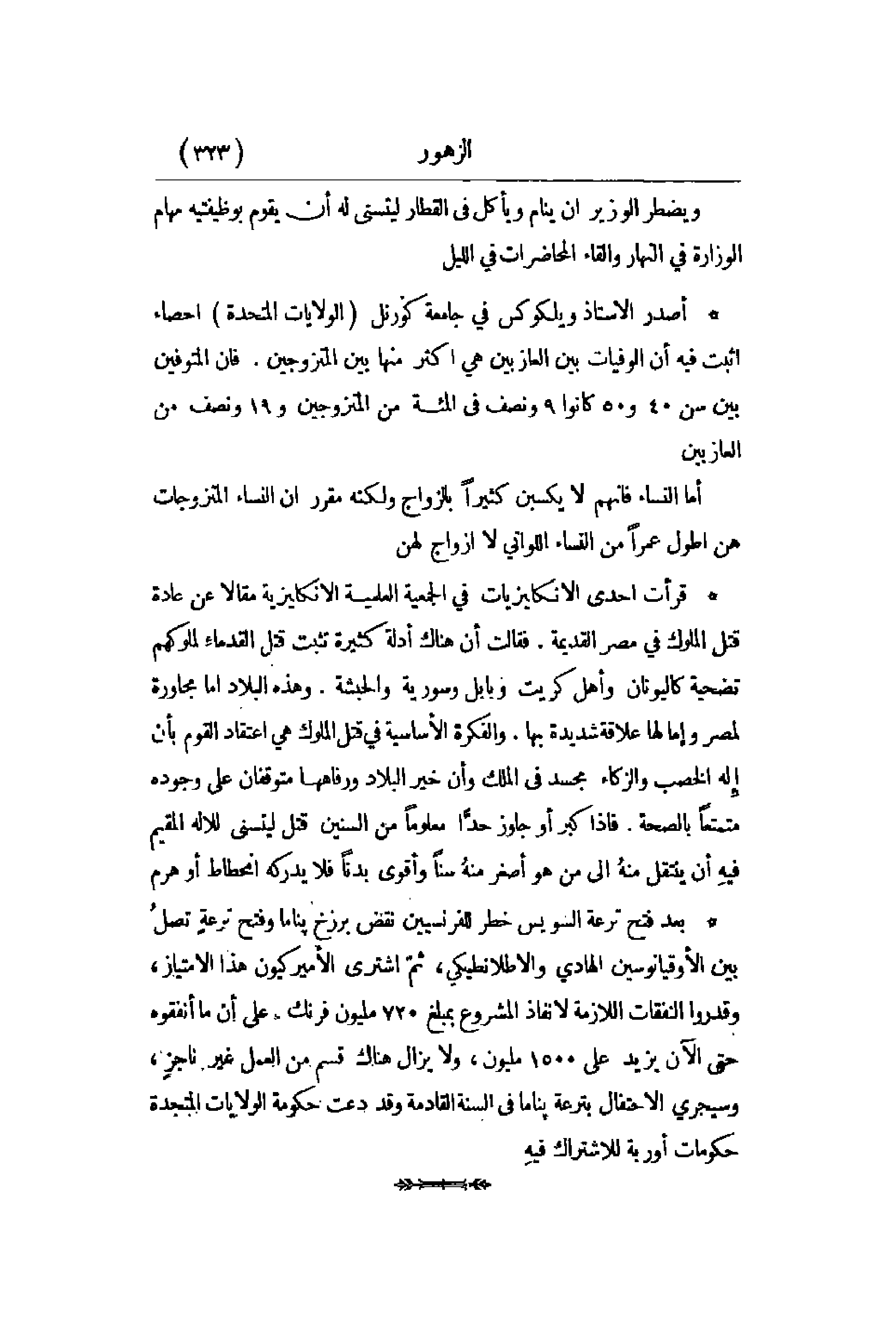 قرأت إحدى الانكليزيات في الجمعية العلمية الانكليزية مقالا عن عادة قتل الملوك في مصر القديمة. فقالت أن هناك أدلة كثيرة تثبت قتل القدماء لملوكهم تضحية كاليونان وأهل كريت وبابل وسورية والحبشة. وذه البلاد أما مجاورة لمصر وإما لها علاقة شديدة بها. والفكرة الأساسية في قتل الملوك هي اعتقاد القوم بأن إله الخصب والزكاء مجسد في الملك وأن خير البلاد ورفاهها متوفقان على وجوده متمتعاً بالصحة. فإذا كبر أو جاوز حدّاً معلوماً من السنين قتل ليتسنى للإله المقيم فيه أن ينتقل منهُ إلى من هو أصغر منهُ سناً وأقوى بدناً فلا يدركه انحطاط أو هرم.