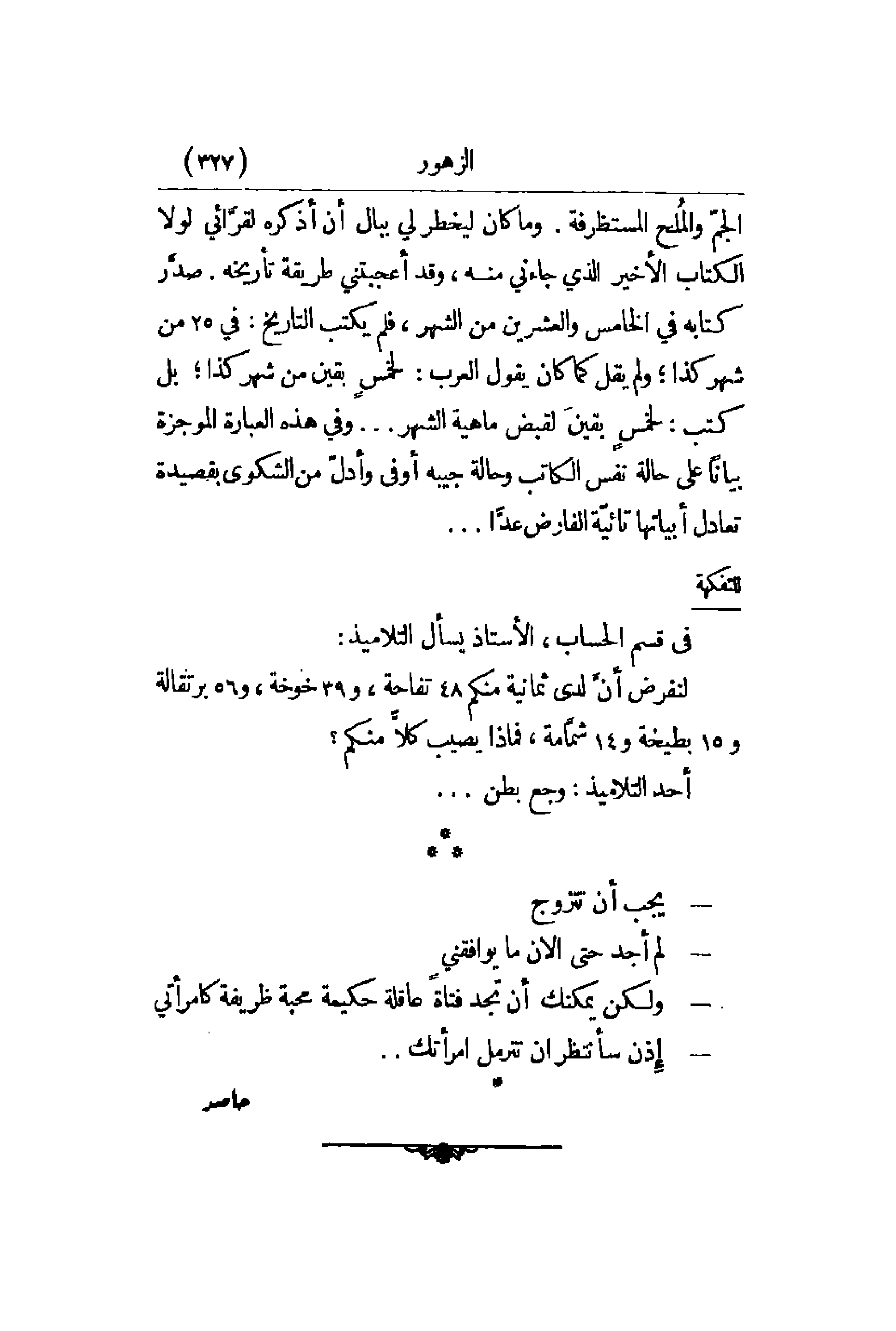 الجمّ والمُلح المستظرفة. وما كان ليخطر لي ببال أن أذكره لقرَّائي لولا الكتاب الأخير الذي جاءني منه , وقد أعجبتني طريقة تأريخه. صدَّر كتابه في الخامس والعشرين من الشهر , فلم يكتب التاريخ: في 25 من شهر كذا؛ ولم يقل كما كان يقول العرب: لخمسٍ بقين من شهر كذا؛ بل كتب: لخمسٍ بقين لقبض ماهينة الشهر. . . وفي هذه العبارة الموجزة بياناً
