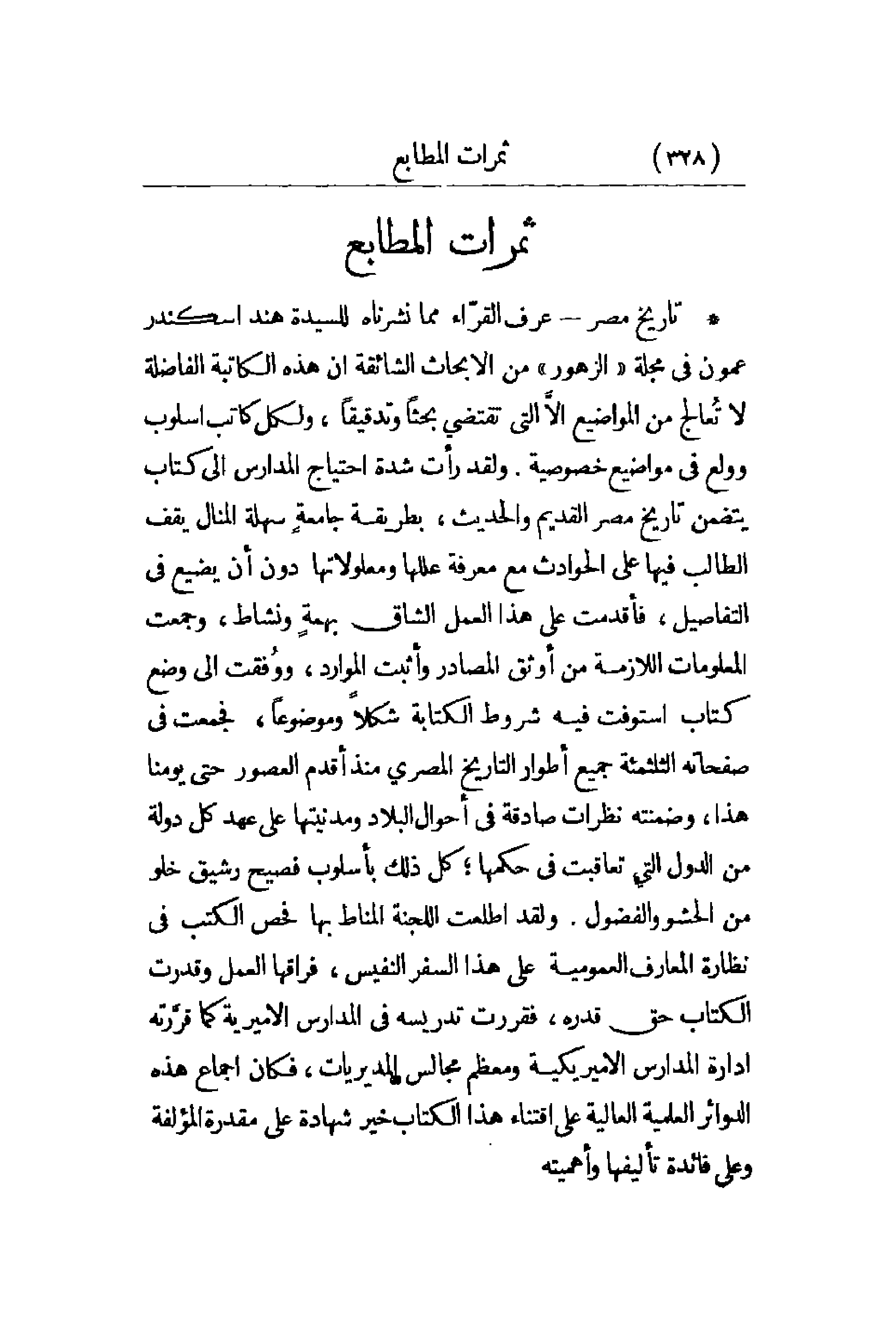 تاريخ مصر - عرف القرّاء مما نشرناه للسيدة هند اسكندر عمون في مجلة الزهور من الأبحاث الشائقة أن هذه الكاتبة الفاضلة لا تُعالج من المواضيع إلاَّ التي تقتضي بحثاً وتدقيقاً , ولكل كاتب أسلوب وولع في مواضيع خصوصية. ولقد رأت شدة احتياج المدارس إلى كتاب يتضمن تاريخ مصر القديم والحديث , بطريقة جامعةٍ سهلة المنال يقف الطالب فيها على الحوادث مع معرفة عللها ومعلوماتها دون أن يضيع في التفاصيل , فأقدمت على هذا العمل الشاق بهمةٍ ونشاط , وجمعت المعلومات اللازمة من أوثق المصادر وأثبت الموارد , ووُقفت إلى وضع كتاب استوفت فيه شروط الكتابة شكلاً وموضوعاً , فجمعت في صفحاته الثلثمئة جميع أطوار التاريخ المصري منذ أقدم العصور حتى يومنا هذا , وضمنته نظرات صادقة في أحوال البلاد ومدنيتها على عهد كل دولة من الدول التي تعاقبت في حكمها؛ كل ذلك بأسلوب فصيح رشيق خلو من الحشو والفضول. ولقد أطلعت اللجنة المناط بها فحص الكتب في نظارة المعارف العمومية على هذا السفر النفيس , فراقها العمل وقدرت الكتاب حق قدره , فقررت تدريسه في المدارس الأميرية كما قرَّرته إدارة المدارس الأميريكية ومعظم مجالس المديريات , فكان إجماع هذه الدوائر العلمية على اقتناء هذا الكتاب خير شهادة على مقدرة المؤلفة وعلى فائدة تأليفها وأهميته.