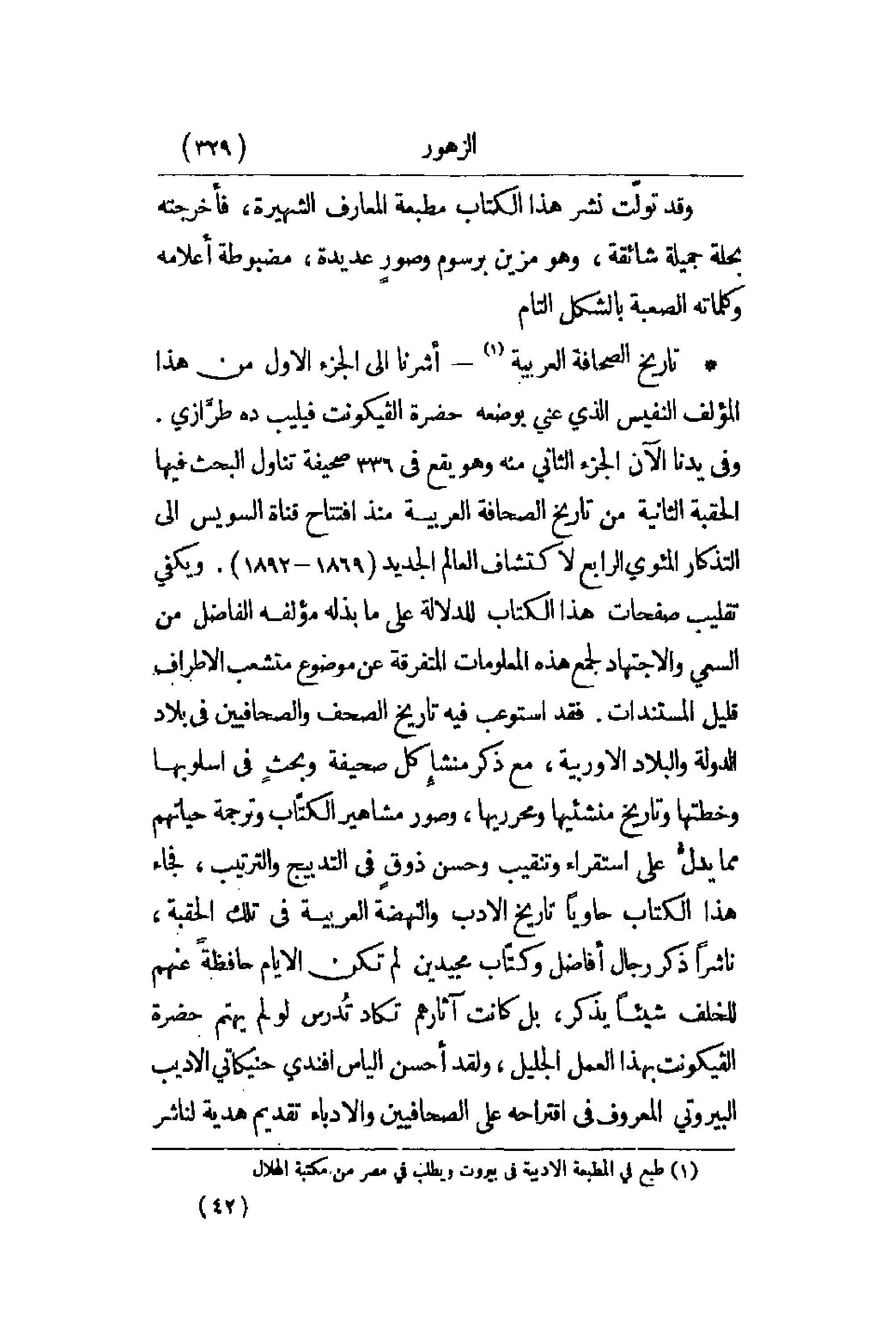 حاوياً تاريخ الأدب والنهضة العربية في تلك الحقبة , ناشراً ذكر رجال أفاضل وكتّاب مجيدين لم تكن الأيام حافظةً عنهم للخلف شيئاً يذكر , بل كانت آثارهم تكاد تُدرس لو لم يهتم حضرة الفيكونت بهذا العمل الجليل , ولقد أحسن الياس أفندي حنيكاتي الأديب البيروتي المعروف في اقتراحه على الصحافيين والأدباء تقديم هدية لناشر