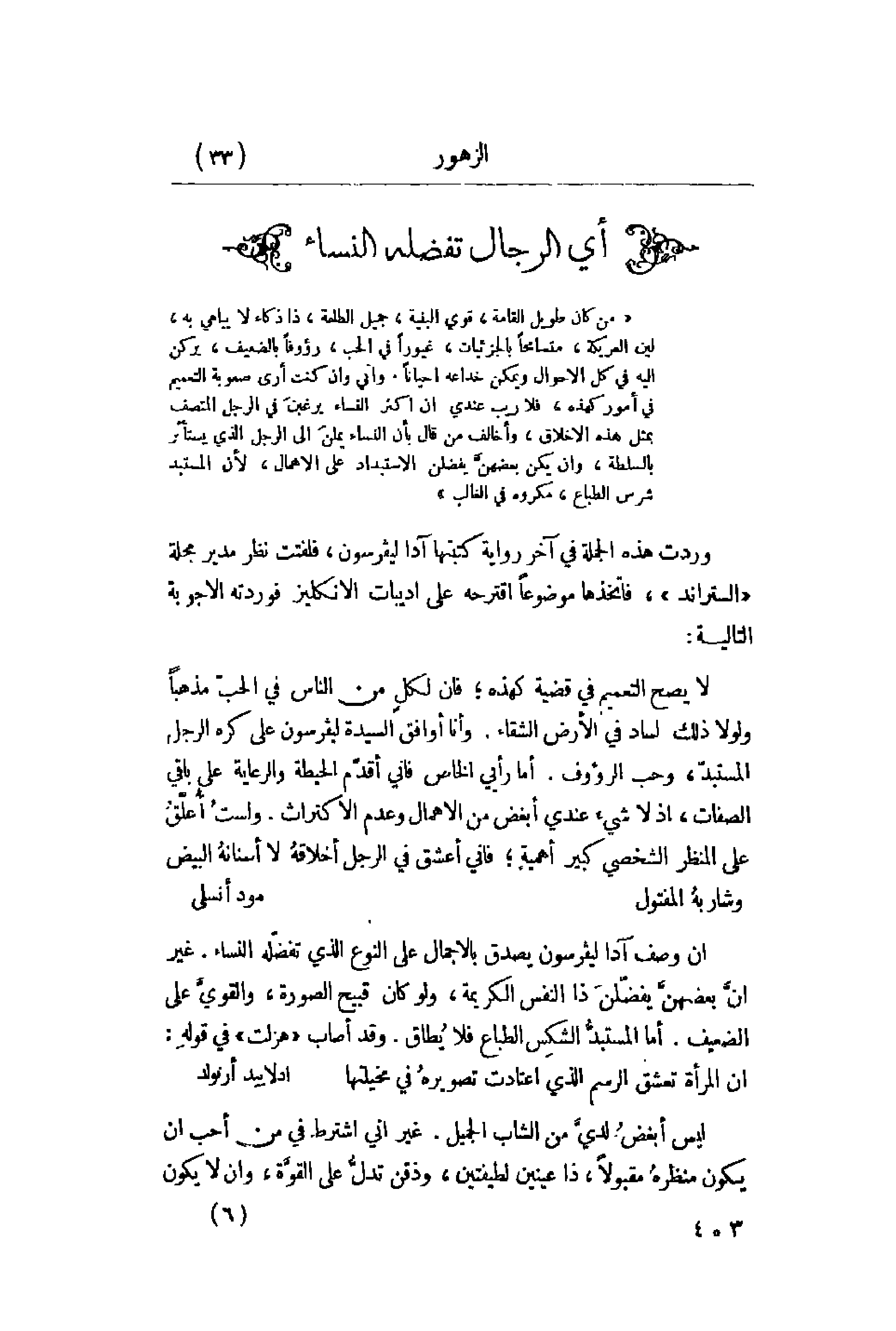 وردت هذه الجملة في آخر رواية كتبتها آدا ليفرسون , فلفتت نظر مدير مجلة الستراند , فاتخذها موضوعاً اقترحه على أديبات الانكليز فوردته الأجوبة التالية: لا يصح التعميم في قضية كهذه؛ فإن لكلٍ من الناس في الحبّ مذهباً ولولا ذلك لساد في الأرض الشقاء. وأنا أوافق السيدة ليفرسون على كره الرجل المستبدّ , وحب الرؤوف. أما رأيي الخاص فإني أقدّم الحيطة والرعاية على باقي الصفات , إذ لا شيءَ عندي أبغض من الإهمال وعدم الاكتراث. ولستُ أُعلّق على المنظر الشخصي كبير أهميةٍ , فإني أعشق في الرجل أخلاقهُ لا أسنانهُ البيض وشاربهُ المفتول.