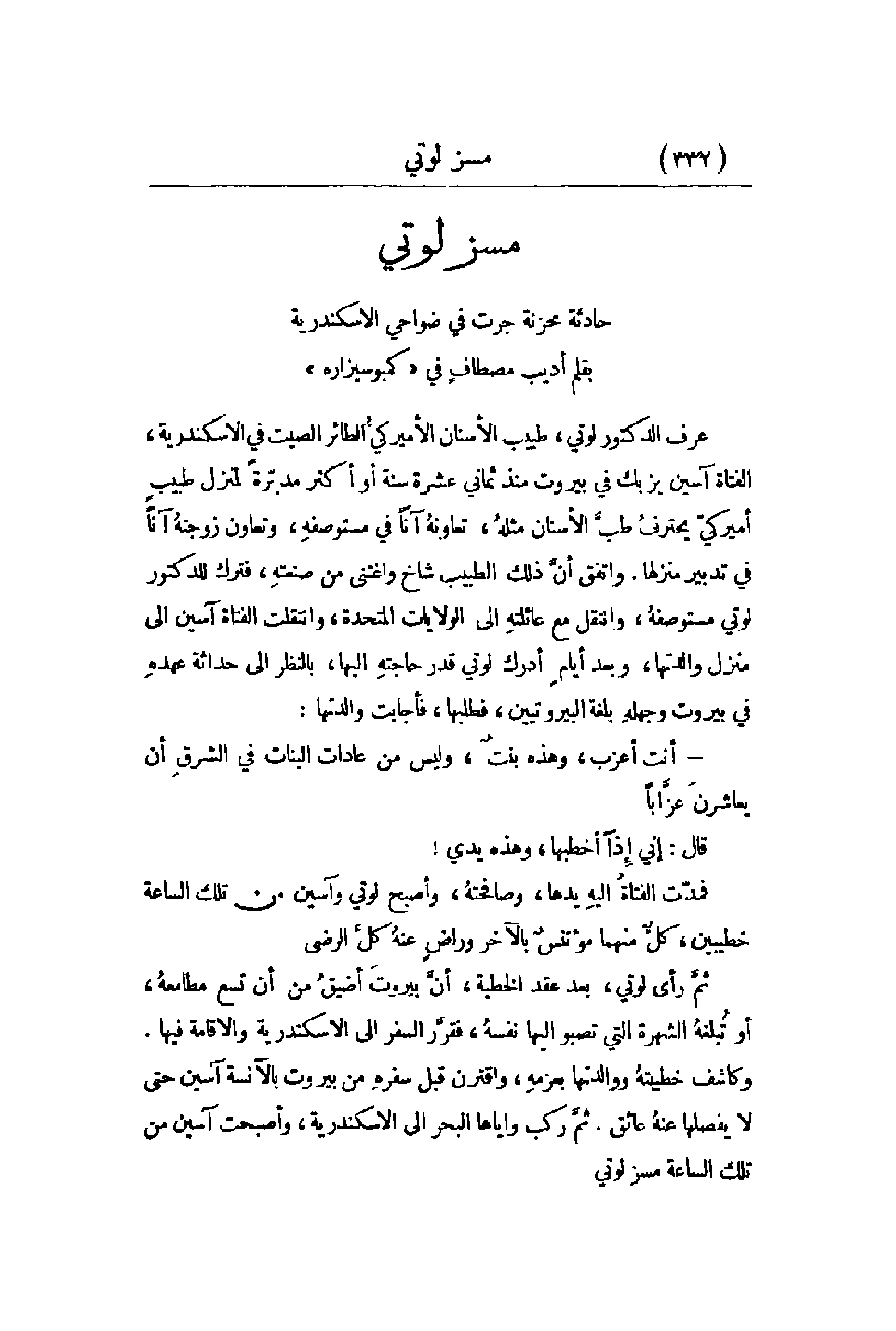ثمَّ رأى لوتي , بعد عقد الخطبة , أنَّ بيروتَ أضيقُ من أن تسع مطامعهُ , أو تُبلغهُ الشهرة التي تصبو إليها نفسهُ , فقرَّر السفر إلى الإسكندرية والإقامة فيها. وكاشف خطيبتهُ ووالدتها بعزمهِ , واقترن قبل سفرهِ من بيروت بالآنسة آسين حتى لا يفصلها عنهُ عائق. ثمَّ ركب وإياها البحر إلى الإسكندرية , وأصبحت آسين من تلك الساعة مسز لوتي.