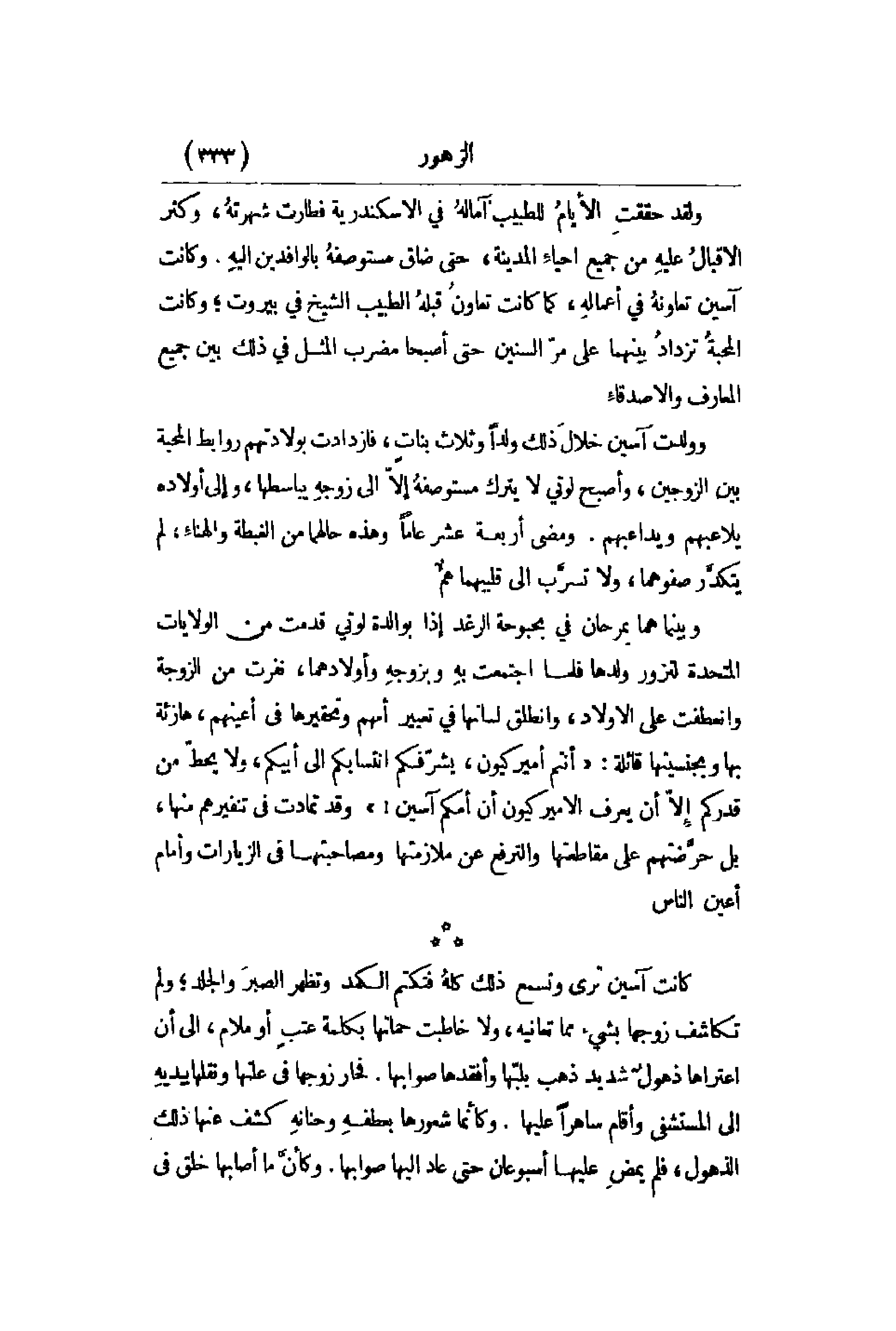 كانت آسين نرى وتسمع ذلك كلهُ فتكتم الكمد وتظهر الصبرَ والجلد؛ ولم تكاشف زوجها بشيء مما تعانيه , ولا خاطبت حماتها بكلمة عتبٍ أو ملام , إلى أن اعتراها ذهولٌ شديد ذهب بلبّها وأفقدها صوابها. فحار زوجها في علتها ونقلها بيديهِ إلى المستشفى وأقام ساهراً عليها. وكأنما شعورها بعطفهِ وحنانهِ كشف عنها ذلك الذهول , فلم يمضِ عليها أسبوعان حتى عاد إليه صوابها. وكأنَّ ما أصابها خلق في