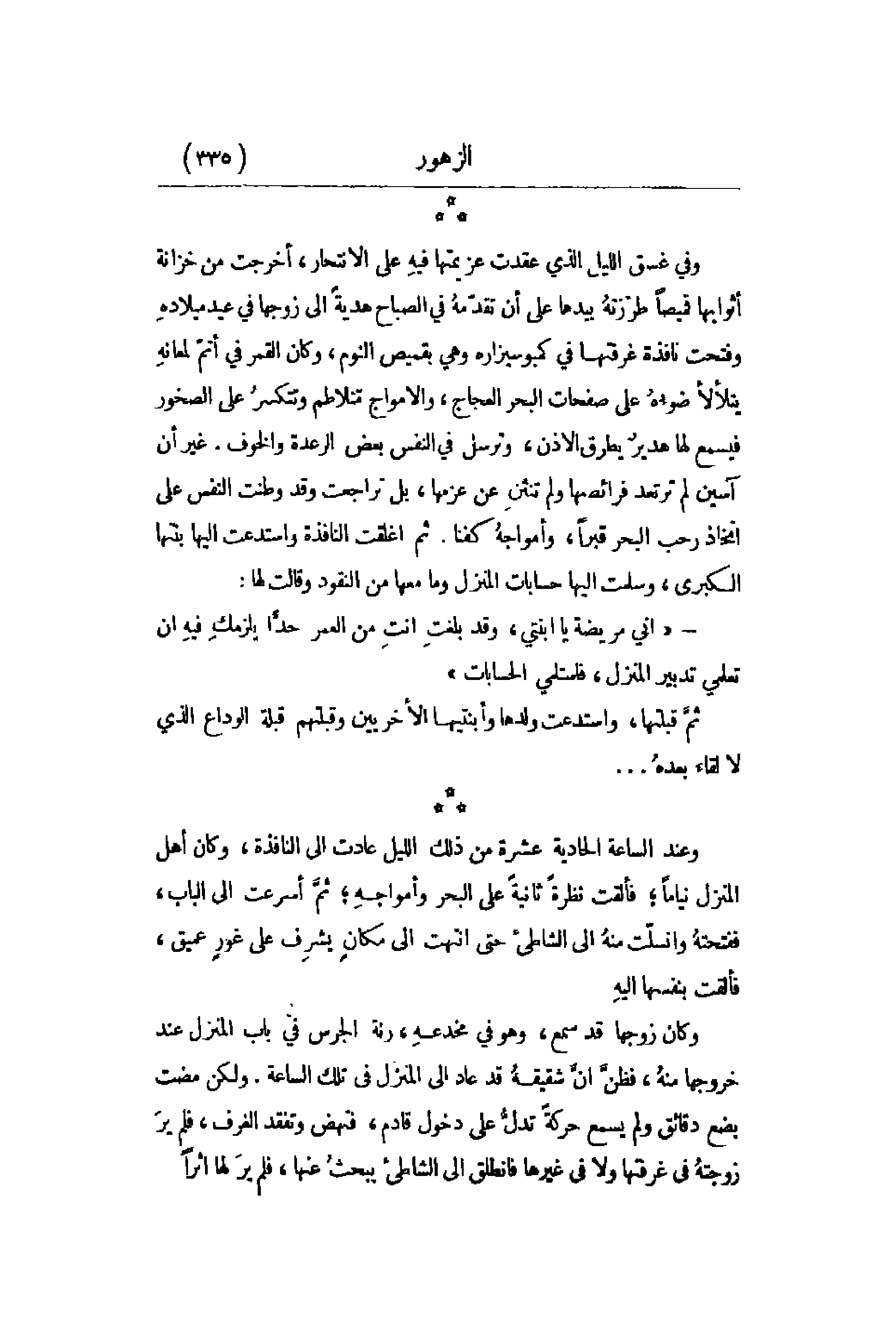 وعند الساعة الحادية عشرة من ذلك الليل عادت إلى النافذة , وكان أهل المنزل نياماً؛ فألقت نظرةً ثانيةً على البحر وأمواجهِ؛ ثمَّ أسرعت إلى الباب , ففتحتهُ وانسلّت منهُ إلى الشاطئ حتى انتهت إلى مكانٍ يشرف على غورٍ عميق , فألقت بنفسها إليهِ. وكان زوجها قد سمع , وهو في مخدعهِ , رنة الجرس في باب المنزل عند بضع دقائق , ولم يسمع حركةً تدلُّ على دخول قادم , فنهض وتفقد الغرف , فلم يرَ زوجتهُ في غرفتها ولا في غيرها فانطلق إلى الشاطئ يبحثُ عنها , فلم يرَ لها أثراً.