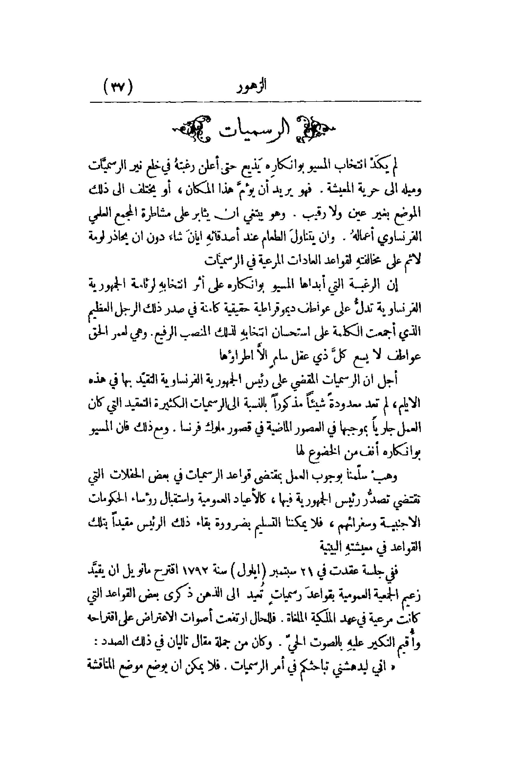 لم يكَدْ انتخاب المسيو يَذيع حتى أعلن رغبتهُ في خلع نير الرسميَّات وميله إلى حرية المعيشة. فهو يريد أن يؤمَّ هذا المكان , أو يختلف إلى ذلك الموضع بغير عين ولا رقيب. وهو يبتغي أن يثابر على مشاطرة المجمع العلمي الفرنساوي أعمالهُ. وأن يتناول الطعام عند أصدقائهِ إيانَ شاءَ دون أن يحاذر لومة لائم على مخالفتهِ لقواعد العادات المرعية في الرسميات. إن الرغبة التي أبداها المسيو بوانكاره على أثر انتخابهِ لرئاسة الجمهورية الفرنساوية تدلُّ على عواطف ديموقراطية حقيقة كامنة في صدر ذلك الرجل العظيم الذي أجمعت الكلمة على استحسان انتخابهِ لذلك المنصب الرفيع. وهي لعمر الحق عواطف لا يسع كلَّ ذي عقل سامٍ إلاَّ إطراؤها. أجل أن الرسميات المقضي على رئيس الجمهورية الفرنساوية التقيّد بها في هذه الأيام , لم تعد معدودة شيئاً مذكوراً بالنسبة إلى الرسميات الكثيرة التعقيد التي كان العمل جارياً بموجبها في العصور الماضية في قصور ملوك فرنسا. ومع ذلك فإن المسيو بوانكاره أنف من الخضوع لها. وهبْ سلّمنا بوجوب العمل بمقتضي قواعد الرسميات في بعض الحفلات التي تقتضي تصدُّر رئيس الجمهورية فها , كالأعياد العمومية واستقبال رؤساء الحكومات الأجنبية وسفرائهم , فلا يمكننا التسليم بضرورة بقاء ذلك الرئيس مقيداً بتلك القواعد في معيشتهِ البيتية. ففي جلسة عقدت في 21 سبتمبر أيلول سنة 1792 اقترح مانويل أن يقيَّد زعيم الجمعية العمومية بقواعدَ رسميات تُعيد إلى الذهن ذكرى بعض القواعد التي كانت مرعية في عهد الملكية الملغاة. فللحال ارتفعت أصوات الاعتراض على اقتراحه وأُقيم النكير عليهِ بالصوت الحيّ. وكان من جملة مقال تاليان في ذلك الصدد: إني ليدهشني تباحثكم في أمر الرسميات. فلا يمكن أن يوضع موضع المناقشة