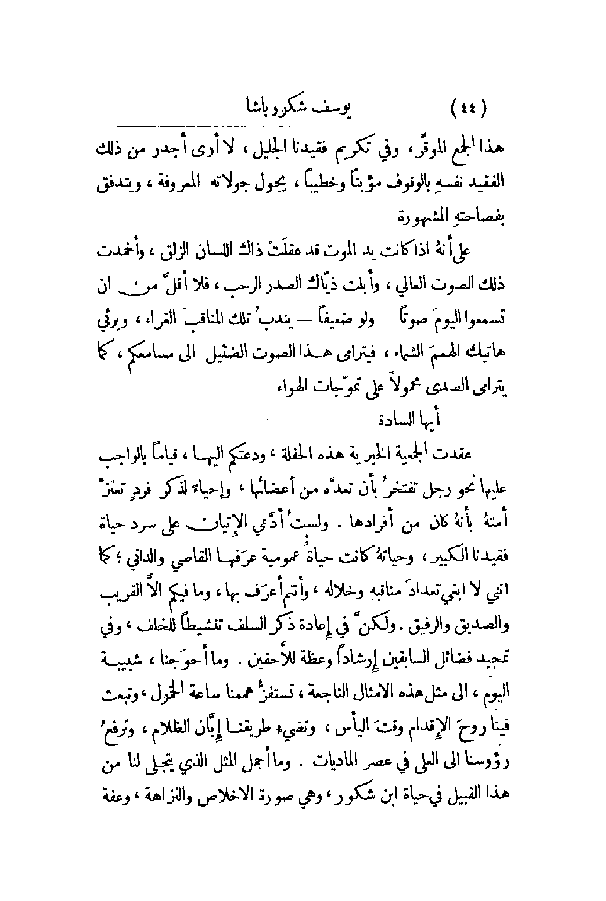 هذا الجمع الموقَّر , وفي تكريم فقيدنا الجليل , لا أرى أجدر من ذلك الفقيد نفسهِ بالوقوف مؤبناً وخطيبً , يجول جولاته المعروفة , ويتدفق بفصاحتهِ المشهورة. على أنه إذا كانت يد الموت قد عقلَتْ ذاك اللسان الزلق , وأخمدت ذلك الصوت العالي , وأبلت ذيّاك الصدر الرحب , فلا أقلَّ من أن تسمعوا الهممَ صوتاً - ولو ضعيفاً - يندبُ تلك المناقبَ الغراء , ويرثي هاتيك الهممَ الشماء , فيترامى هذا الصوت الضئيل إلى مسامعكم , كما يترامي الصدى محمولاً على تموجات الهواء.