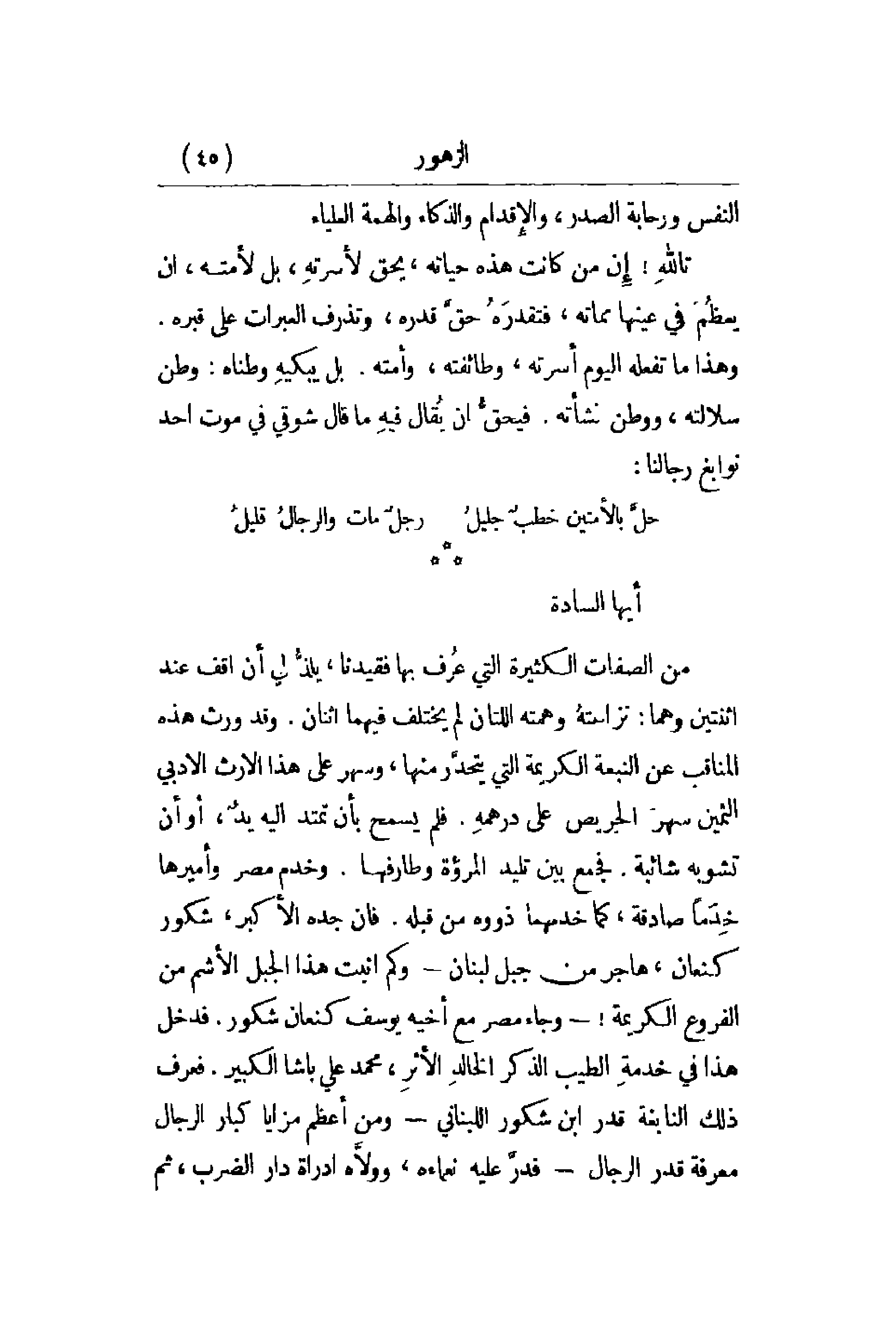 النفس ورحابة الصدر , والإِقدام والذكاء والهمة العلياء. تاللهِ! إِن من كانت هذه حياته , يحق لأسرتهِ , بل لأمته , أن يعظُم في عينها مماته , فتقدرَهُ حقَّ قدره , وتذرف العبرات على قبره. وهذا ما تفعله اليوم أسرته , وطائفته , وأمته. بل يبكيه وطناه: وطن سلالته , ووطن شأته. فيحقُّ أن
