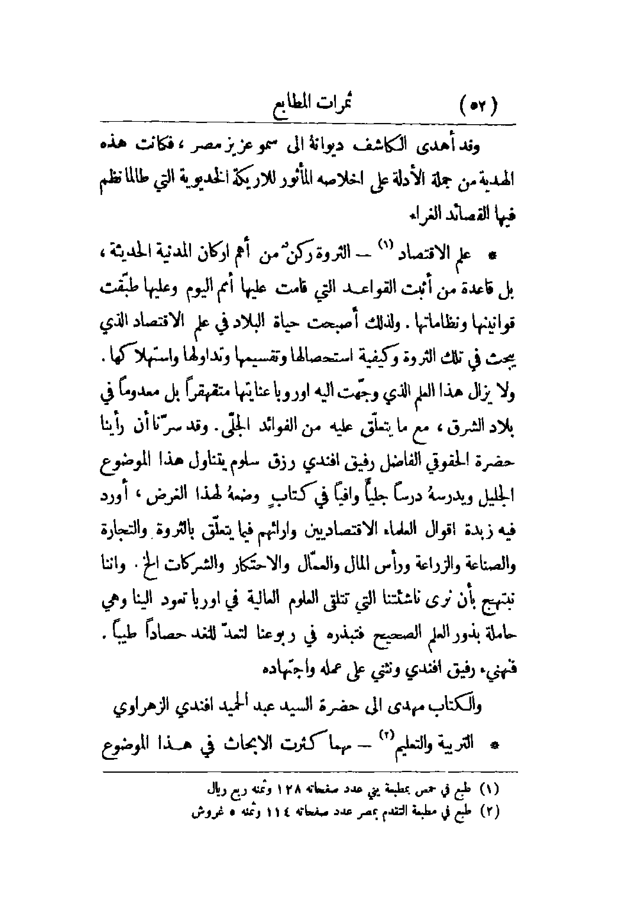 علم الاقتصاد - الثروة ركنٌ من أهم أركان المدنية الحديثة , بل قاعدة من أثبت القواعد التي قامت عليها أمم اليوم وعليها طبّقت قوانينها ونظاماتها. ولذلك أصبحت حياة البلاد في علم الاقتصاد الذي يبحث في تلك الثروة وكيفية استحصالها وتقسيمها وتداولها واستهلاكها. ولا يزال هذا العلم الذي وجّهت إليه أوروبا عنايتها متقهقراً بل معدوماً في بلاد الشرق , مع ما يتعلق عليه من الفوائد الجلّي. وقد سرّنا أن رأينا حضرة الحقوقي الفاضل رفيق أفندي رزق سلوم يتناول هذا الموضوع