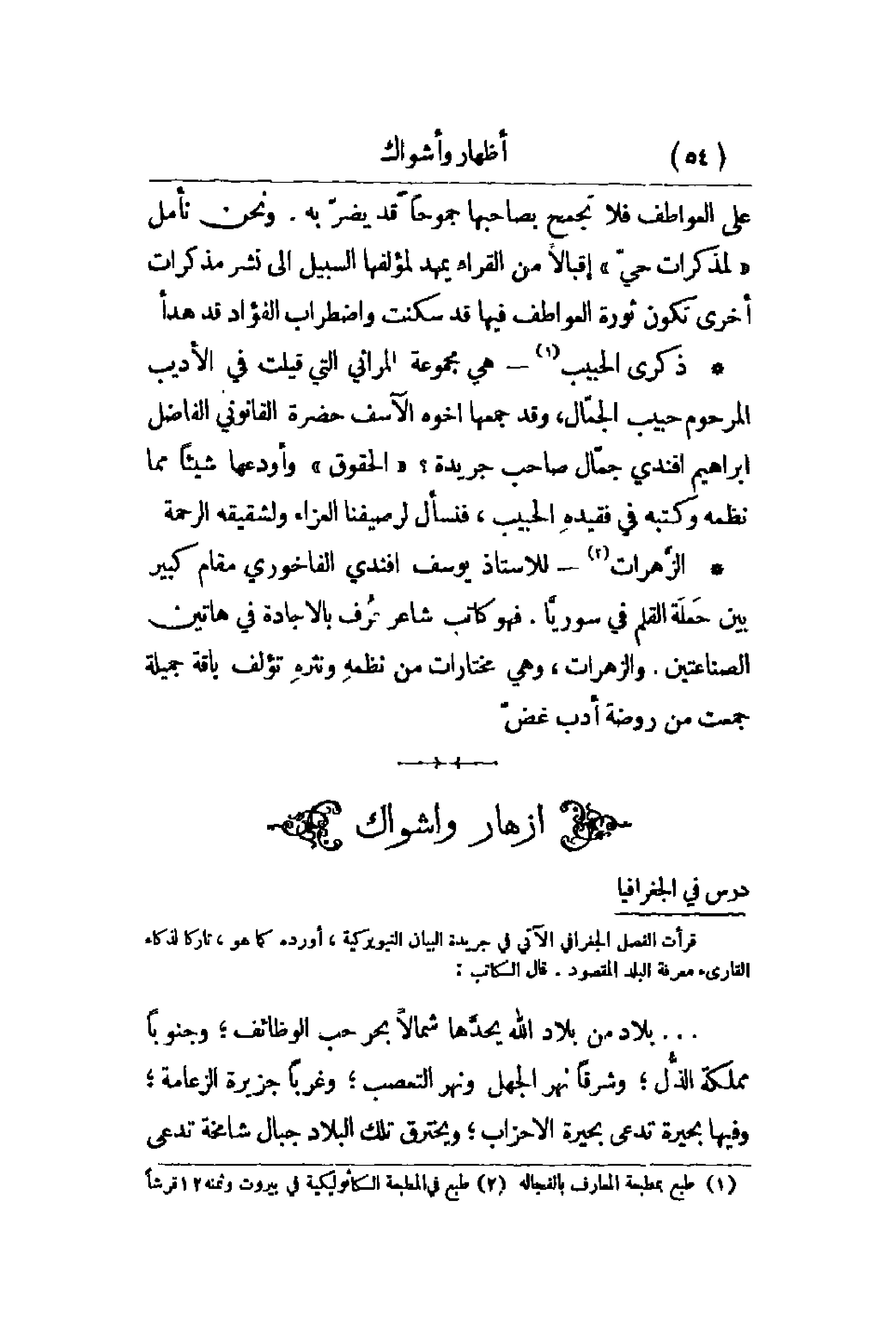 الزَّهرات - للأستاذ يوسف أفندي الفاخوري مقام كبير بين حَملَة القلم سوريَّا. فهو كاتب شاعر عُرف بالإجادة في هاتين الصناعتين. والزهرات , وهي مختارات من نظمهِ ونثرهِ تؤلف باقة جميلة جمعت من روضة أدب غضّ.