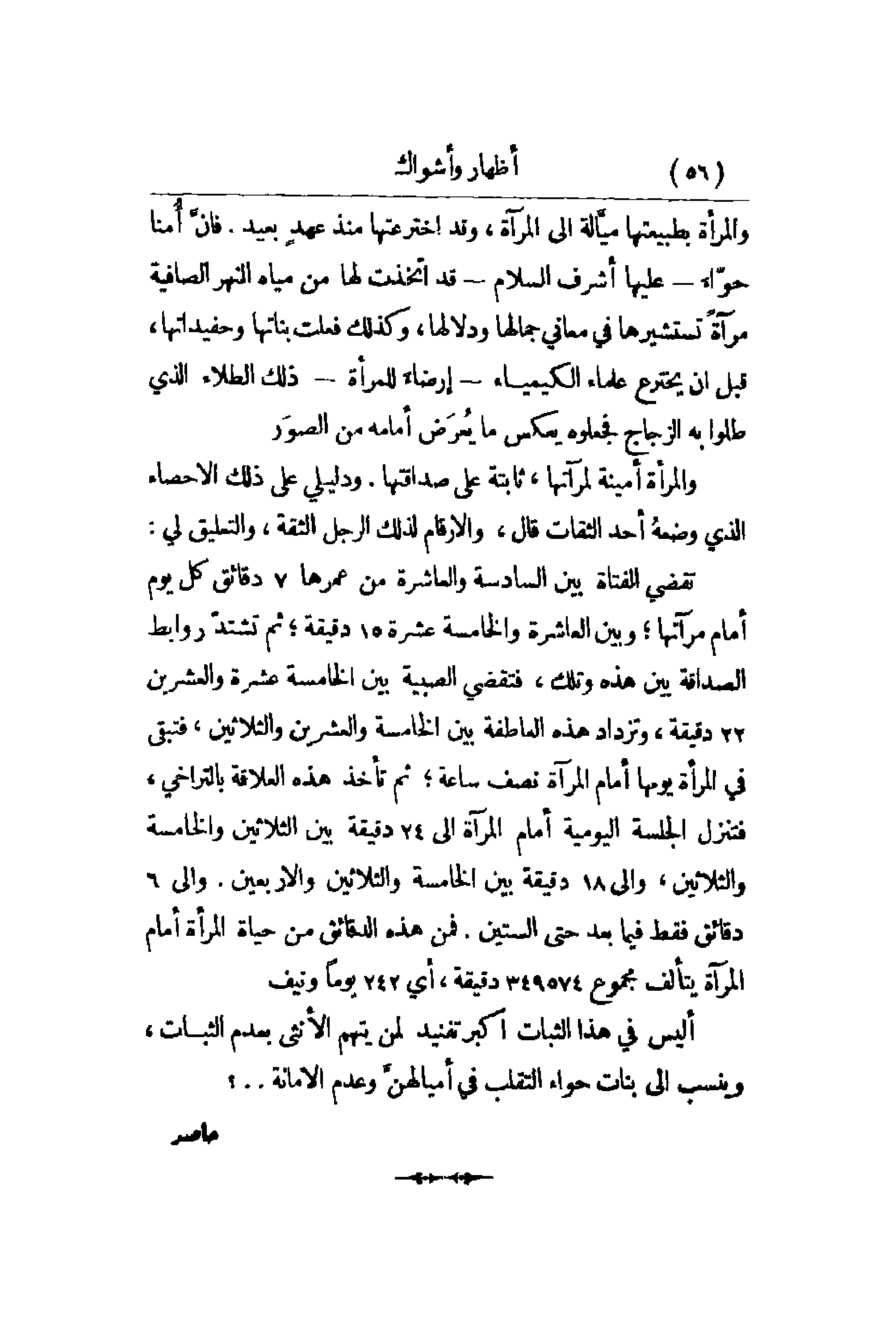 صداقتها. ودليلي على ذلك الإحصاء الذي وضعهُ أحد الثقات قال , والأرقام لذلك الرجل الثقة , والتعليق لي: تقضي الفتاة بين السادسة والعاشرة من عمرها 7دقائق كل يوم أمام مرآتها؛ وبين العاشرة والخامسة عشر 15دقيقة؛ ثم تشتدّ روابط الصداقة بين هذه تلك , فتقضي الصبية بين الخامسة عشر والعشرين 22 دقيقة , وتزداد هذه العاطفة بين الخامسة والعشرين والثلاثون , فتبقى في المرأة يومها أمام المرآة نصف ساعة؛ ثم تأخذ العلاقة بالتراخي , فتنزل الجلسة اليومية أمام المرآة إلى 24دقيقة بين الثلاثين والخامسة والثلاثين , وإلى 18 دقيقة بين الخامسة والثلاثين والأربعين وإلى 6 دقائق فقط فيما بعد حتى الستين. فمن هذه الدقائق من حياة المرآة أمام المرآة يتألف مجموع 349574 دقيقة , أي 242 يوماً ونيف. أليس في هذا الثبات أكبر تفنيد لمن يتهم الأنثى بعدم الثبات , وينسب إلى بنات حواء التقلب في أميالهنَّ وعدم الأمانة. . .؟