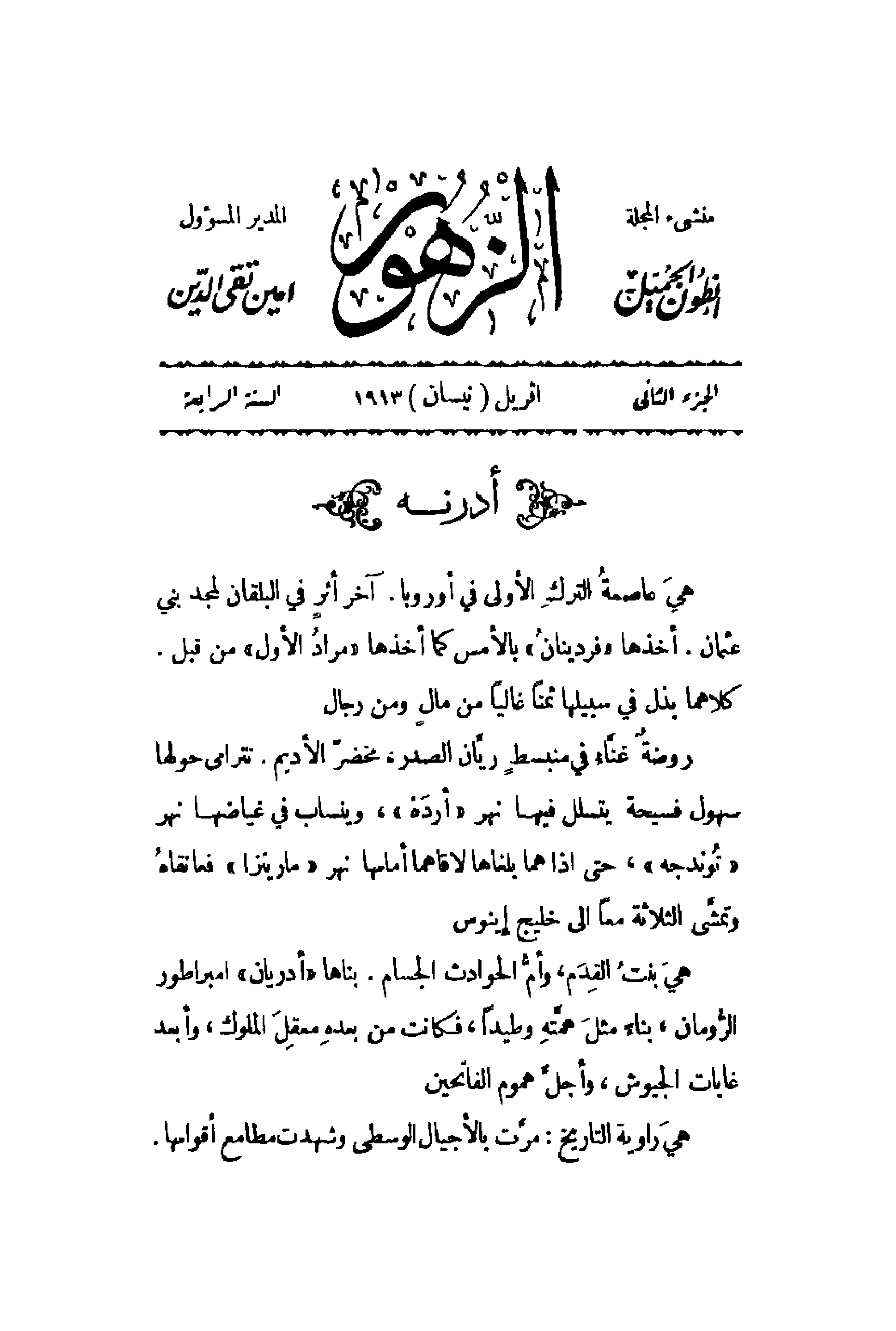 هيَ عاصمةُ التركِ الأولى في أوروبا. آخر أثر في البلقان لمجد بني عثمان. أخذها فردينانُ بالأمس كما أخذها مرادُ الأول من قبل كلاهما بذل في سبيلها ثمناً غالياً من مالٍ ومن رجال. روضةٌ غنُّاءُ في منبسطٍ ريَّان الصدر , مخضرّ الأديم. تترامى حولها سهول فسيحة يتسلل فيها نهر أردَهْ وينساب في غياضها نهر تُوندجه , حتى إذا هما بغاها لأقامها أمامها نهر ماريتزا فعانقاهُ وتمشَّى الثلاثة معاً إلى خليج إينوس. هيَ بنتُ القِدَم , وأمُّ الحوادث الجسام. بناها أدريان إمبراطور الرُّومان , بناءً مثلَ همَّتهِ وطيداً , فكانت من بعدهِ معقِلَ الملوك , وأبعد غايات الجيوش , وأجلَّ هموم الفاتحين. هيّ رواية التاريخ: مرَّت بالأجيال الوسطى وشهدت مطامع أقوامها.