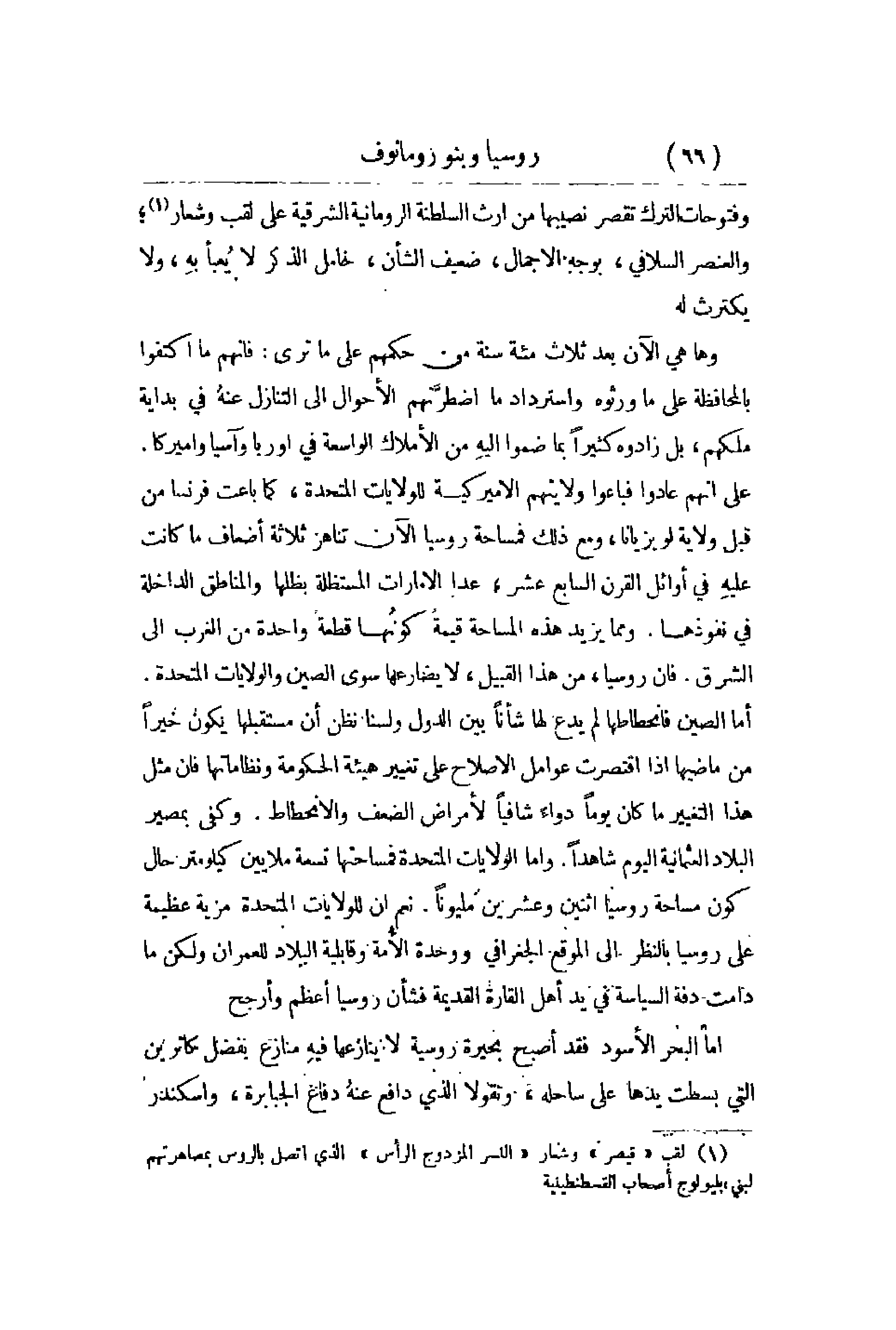 وفتوحات الترك تقصر نصيبها من إرث السلطة الرومانية الشرقية على لقب وشعار؛ والعنصر السافي , بوجه الإجمال , ضعيف الشأن , خامل الذكر لا يُعبأ بهِ , ولا يكترث له. وها هي الآن بعد ثلاثة مئة سنة من حكمهم على ما ترى: فإنهم ما اكتفوا بالمحافظة على ما ورثوه واسترداد ما اضطرّتهم الأحوال إلى التنازل عنهُ في بداية ملكهم , بل زادوه كثيراً بما ضموا إليهِ من الأملاك الواسعة في أوربا وآسيا وأميركا. على أنهم عادوا فباعوا ولا يتهم الأميركية للولايات المتحدة , كما باعت فرنسا من قبل ولاية لويزيانا , ومع ذلك فمساحة روسيا الآن تناهز ثلاثة أضعاف ما كانت عليهِ في أوائل القرن السابع عشر , عدا