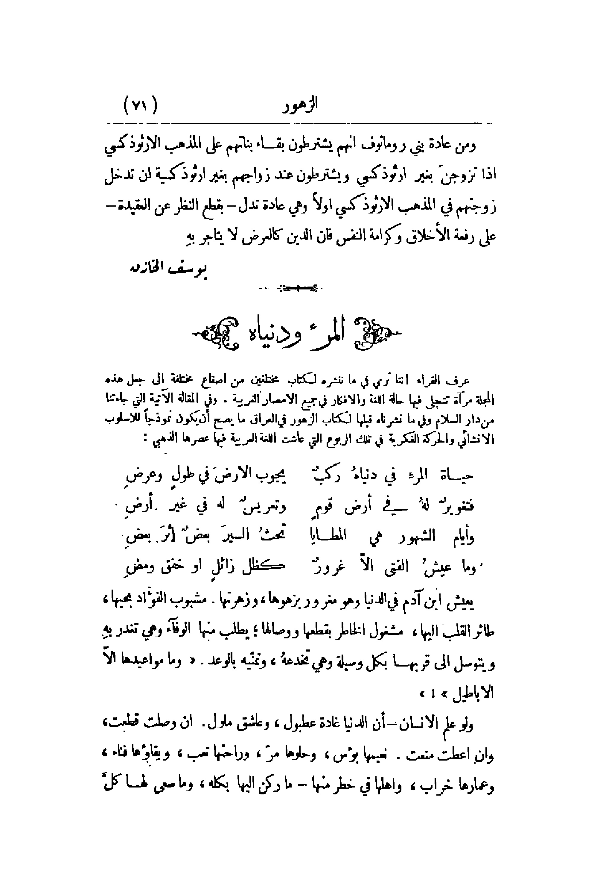 عرف القراء أننا نرمي في ما ننشره لكتاب مختلفين من أصقاع مختلفة إلى جعل هذه المجلة مرآة تتجلى فيها حالة اللغة والأفكار في جميع الأمصار العربية. وفي مقالة الآتية التي جاءتنا من دار السلام وفي نشرناه قبلها لكتاب الزهور في العراق ما يصح أن يكون نموذجاً للأسلوب الإنشائي والحركة الفكرية في تلك الربوع التي عاشت اللغة العربية فيها عصرها الذهبي: